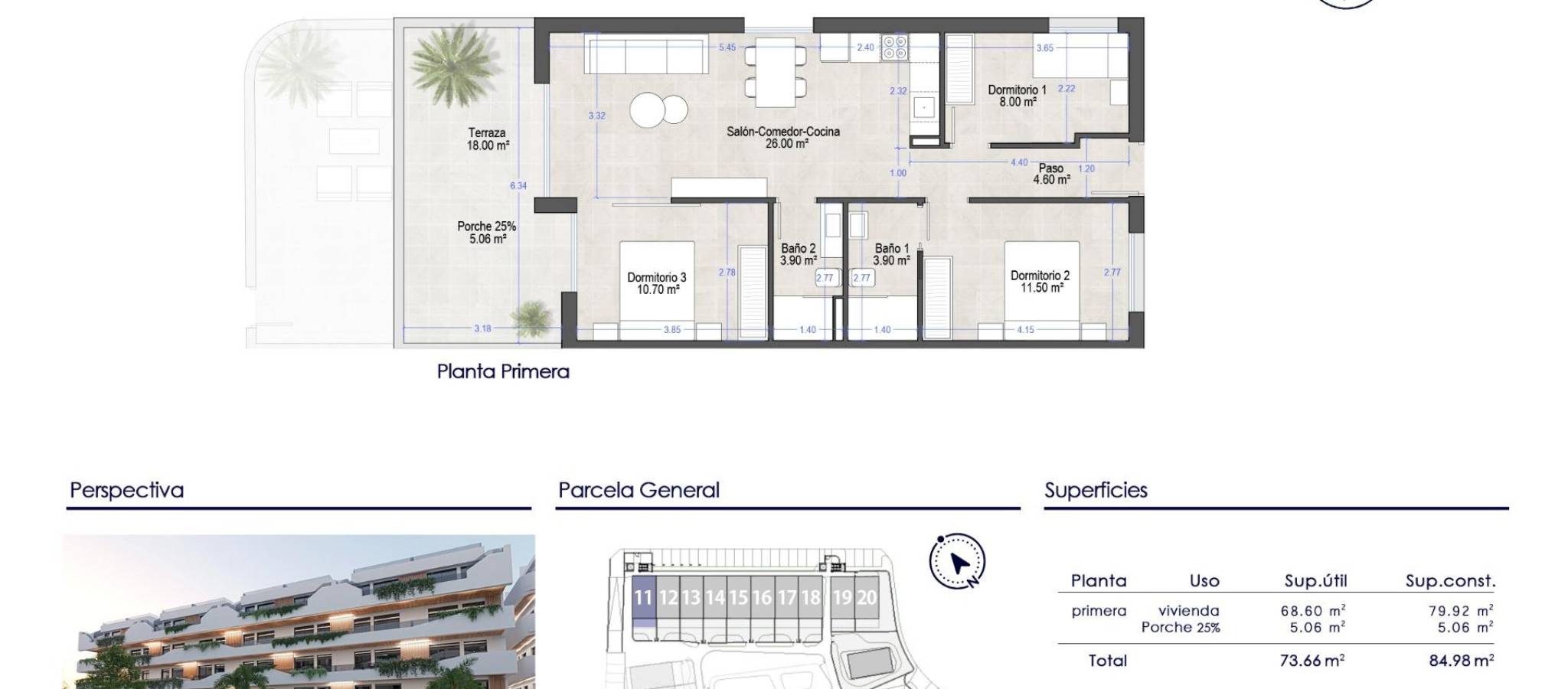 Nybyggede turistleiligheter i Santiago de la Ribera, San Javier – bare 750 meter fra stranden Eksklusivt boligprosjekt på Costa Cálida Dette eksklusive boligkomplekset med 125 turistleiligheter ligger i Santiago de la Ribera (San Javier), en sjarmerende kystby på Costa Cálida, kjent for sine vakre sandstrender, avslappede middelhavsstil og utmerkede klima året rundt. Med Mar Menor bare 750 meter unna, tilbyr disse boligene den perfekte kombinasjonen av komfort, stil og nærhet til sjøen. Moderne leiligheter med flere alternativer Utbyggingen tilbyr romslige leiligheter med 3 soverom og 2 bad, inkludert et hovedsoverom med eget bad. Kjøpere kan velge mellom: Leiligheter i første etasje med privat hage Leiligheter i mellomste etasje med store terrasser Penthouseleiligheter med privat solarium Hver bolig er designet for å maksimere naturlig lys og utendørs liv. Funksjonene inkluderer fullt utstyrt og møblert kjøkken med hvitevarer, innvendig og utvendig belysning, bad med møbler og dusjvegger. Hver bolig har en parkeringsplass på overflaten, mens underjordisk parkering og bod er tilgjengelig mot en ekstra kostnad. Førsteklasses fasiliteter og tjenester Eierne vil kunne nyte godt av en moderne bygning utstyrt med heiser, to felles svømmebassenger og vakre hager. Boligene har forhåndsinstallert kanalisert klimaanlegg for komfort hele året. En smart investeringsmulighet Disse leilighetene har allerede fått turistlisens, noe som gjør dem til en utmerket investering for ferieutleie. Eierne kan generere inntekter gjennom korttidsutleie, samtidig som de kan nyte eiendommen til egne familieferier. Vær oppmerksom på at disse boligene er ment for feriebruk og ikke kan brukes som permanente boliger. Førsteklasses beliggenhet i San Javier Utbyggingen er strategisk plassert i nærheten av alle viktige tjenester og fritidsaktiviteter. Avstander til viktige severdigheter: Mar Menor-stranden: 750 m La Ribera kjøpesenter: 2 km Dos Mares kjøpesenter: 3 km Roda Golf: 5 km Lo Pagán marina: 4 km Murcia lufthavn (Corvera): 40 km Cartagena: 30 km Murcia by: 40 km Gjør din drøm om å bo ved kysten til virkelighet Dette nybyggprosjektet i Santiago de la Ribera representerer en unik mulighet til å nyte middelhavslivet samtidig som du gjør en smart investering i utleie. Kontakt oss i dag for mer informasjon eller for å avtale en visning av disse moderne turistleilighetene, bare noen skritt fra Mar Menor.