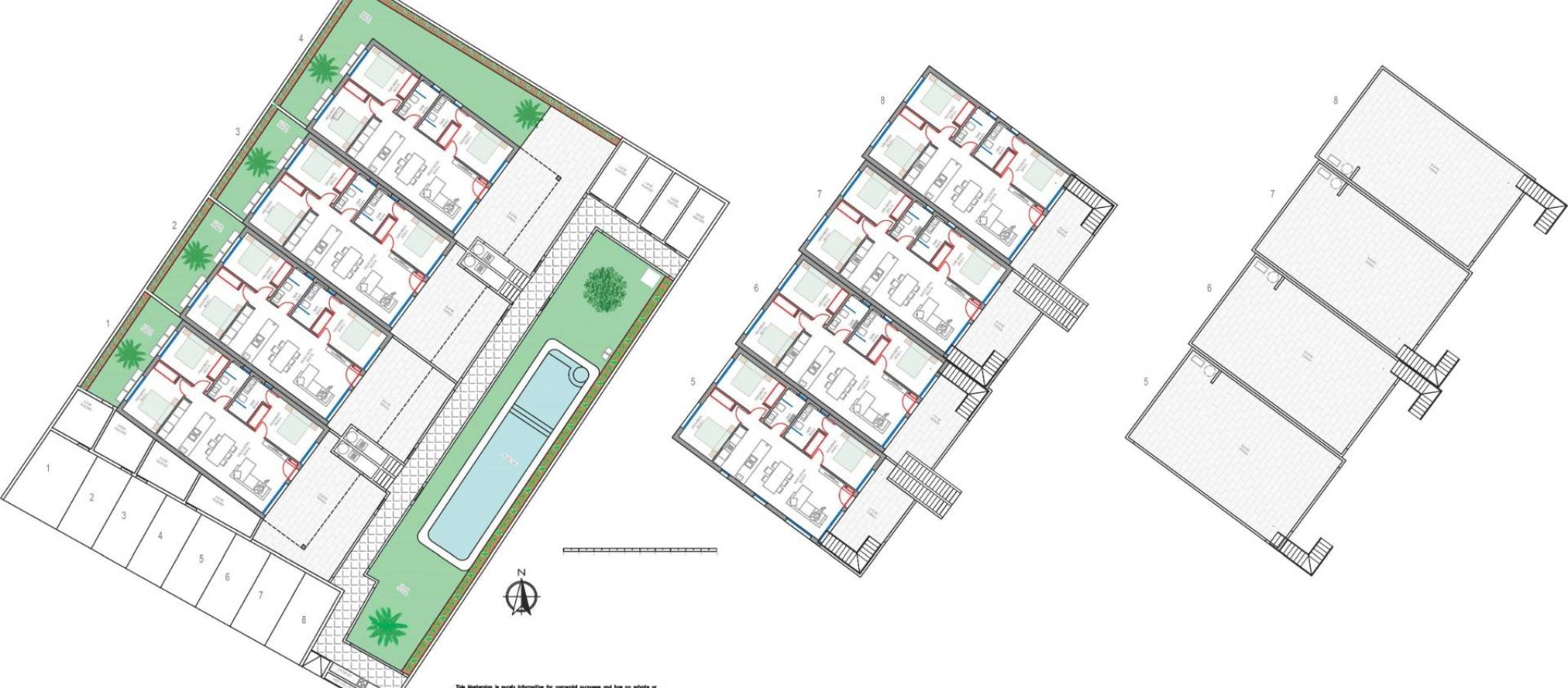 Boligkomplekset har et felles svømmebasseng omgitt av anlagte hager, som skaper et innbydende og fredelig miljø for avslapning og fritid. Hver eiendom har også en privat parkeringsplass og et bod.
