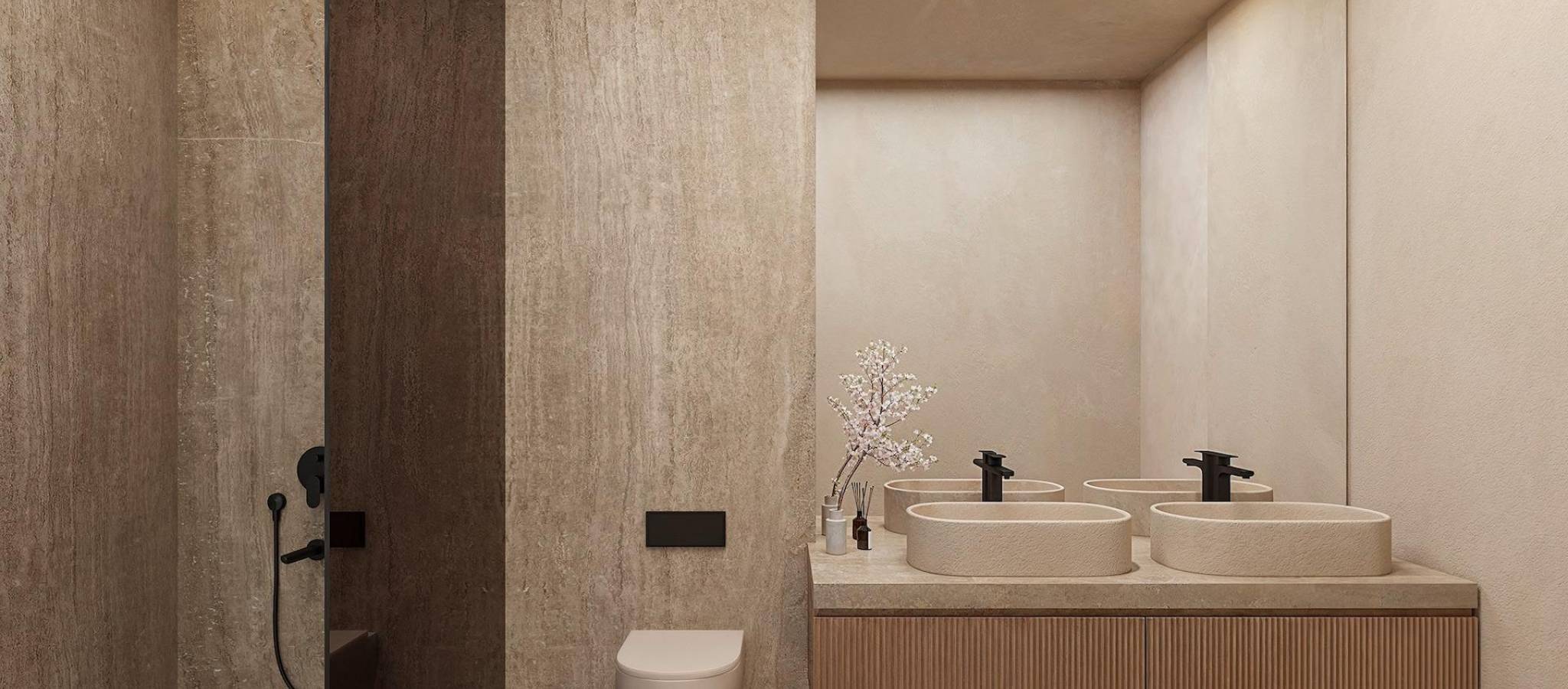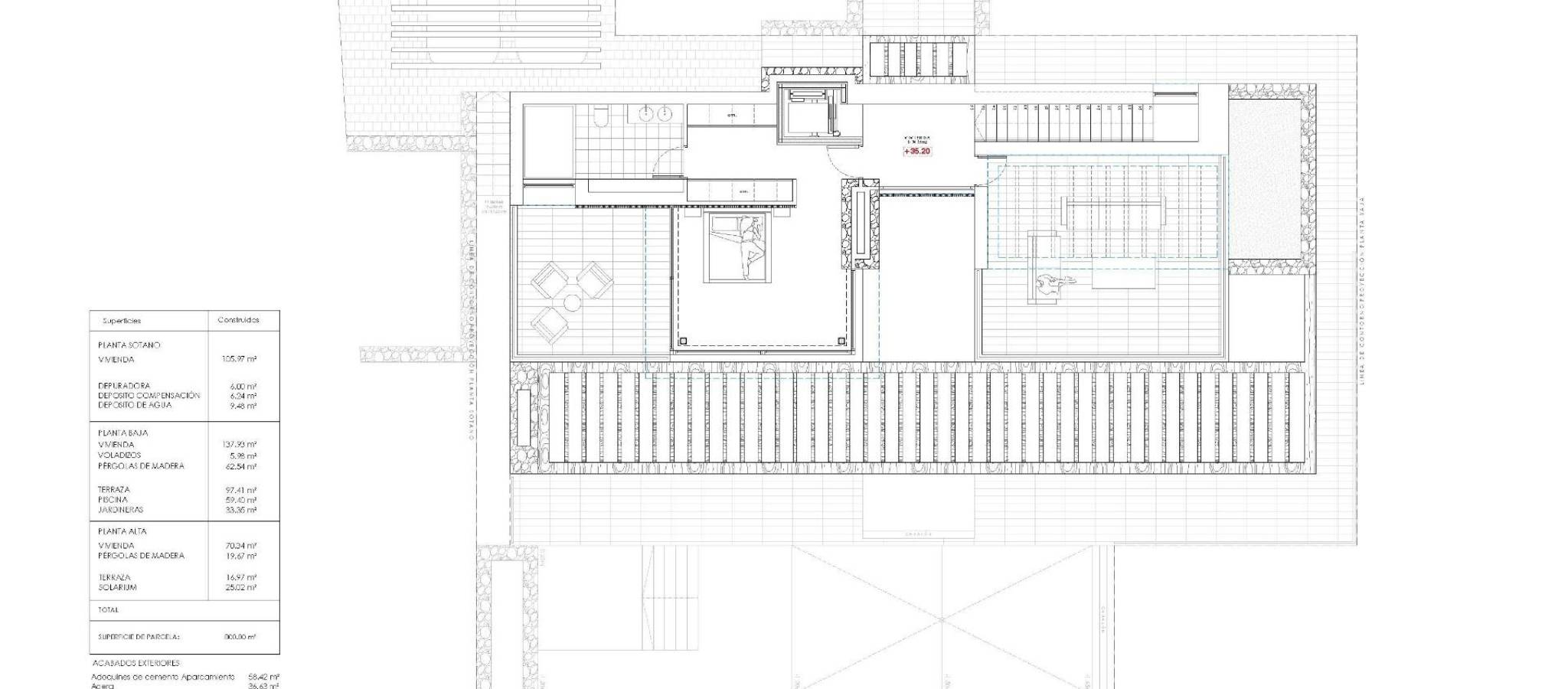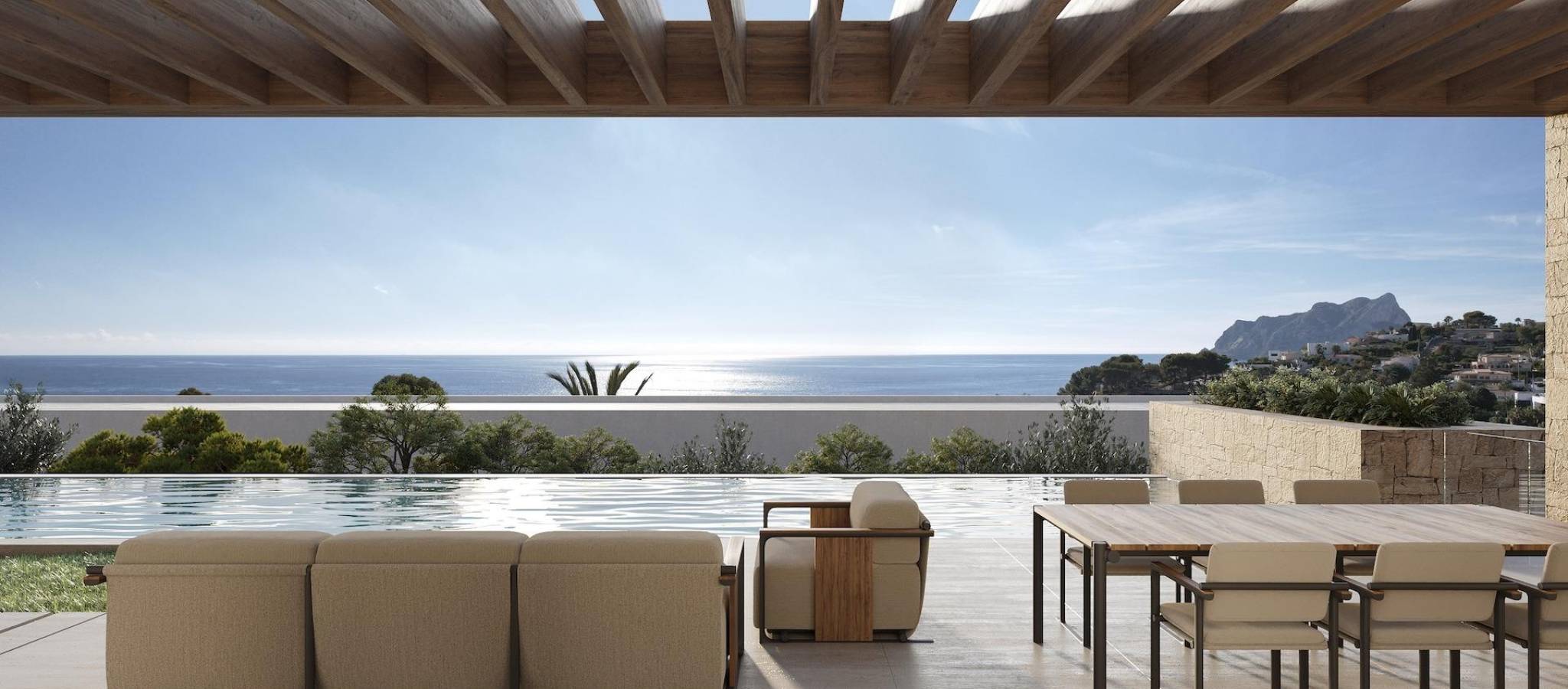 Moderne villa med panoramautsikt over havet i La Fustera, Benissa Costa Denne eksklusive nybygde villaen, designet av en kjent arkitekt og utviklet av en lokal utbygger med mer enn 20 års erfaring, ligger på en 800 m² stor tomt bare noen få skritt fra La Fustera-stranden. Arkitekturen blander middelhavsvarme med moderne eleganse og kombinerer naturstein, tre og myke, nøytrale farger, som integreres sømløst med kystlandskapet. Med et totalt byggeareal på 716 m² fordelt på tre etasjer – kjeller, første etasje og andre etasje – tilbyr villaen en perfekt balanse mellom funksjonalitet, design og komfort. Kjeller Den nedre etasjen på 105,97 m² er designet for både praktisk bruk og fritid. Den inkluderer et fullt utstyrt treningsstudio, vaskerom og tekniske områder, med mulighet for å tilpasse ekstra rom som vinkjeller, kino eller flerbruksrom. Denne etasjen huser også bassengets filtreringssystem og vanntanker, noe som sikrer effektiv styring av alle tekniske installasjoner. Første etasje Hovedetasjen, på 137,93 m², har en lys åpen planløsning som fanger essensen av middelhavslivet. Den romslige stuen, spisestuen og kjøkkenet åpner seg gjennom store vinduer fra gulv til tak mot hovedterrassen og evighetsbassenget, og rammer inn den fantastiske panoramautsikten over havet som preger karakteren til dette hjemmet. To doble soverom, et komplett bad og et gjestetoalett fullfører denne etasjen og gir komfort og funksjonalitet. Utenfor skygger en pergola av tre for utendørs stue og spisestue, omgitt av frodige hager, solterrasser og et 59,40 m² stort evighetsbasseng som visuelt smelter sammen med havet. Første etasje Den øvre etasjen, på 70,19 m², er reservert for master-suiten – et privat tilfluktssted med walk-in-garderobe, eget bad og en stor privat terrasse med fantastisk utsikt over Middelhavet. Et andre soverom eller kontor fullfører denne etasjen, som også gir tilgang til et solarium på 25,02 m², ideelt for å slappe av i solen og nyte roen i omgivelsene. Utvendig og beliggenhet Denne eiendommen ligger i en rolig boliggate omgitt av moderne villaer, og har en eksepsjonell beliggenhet bare 3 minutters gange fra La Fustera-stranden (150 m), Mandala Beach Bar & Restaurant og viktige fasiliteter som supermarkeder og lokale tjenester. Denne villaen er designet med vekt på lys, rom og sømløs overgang mellom inne og ute, og legemliggjør den moderne middelhavsstilen – elegant, avslappet og i perfekt harmoni med den spektakulære panoramautsikten over havet. Sikre deg din drømmevilla i La Fustera, Benissa Costa, og omfavn den ultimate middelhavsstilen med fantastisk havutsikt og uovertruffen komfort.