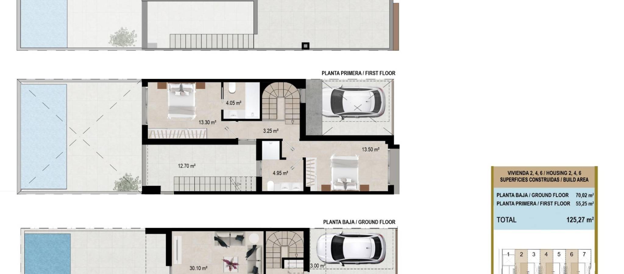 Nybygde rekkehus i San Javier - moderne design og førsteklasses beliggenhet Rekkehus med moderne design og privat svømmebasseng Oppdag dette eksklusive komplekset med 8 splitter nye rekkehus i San Javier, Murcia, som er designet for å tilby maksimal komfort og en moderne livsstil. Hver bolig har et privat svømmebasseng, terrasse, solarium og parkeringsplass, noe som gir en ideell plass for avslapning og nytelse året rundt. Boligene er bygget med materialer av høy kvalitet og har en åpen planløsning som utnytter det naturlige lyset på best mulig måte. De er perfekte både som permanent bolig og som feriehus på Costa Cálida. Distribusjon og utstyr av høy kvalitet Hvert rekkehus har: 3 romslige soverom med garderober og kommoder. 3 fullt utstyrte bad med møbler, speil og skjermer. Åpent konseptkjøkken, fullt utstyrt og med hvitevarer inkludert. Romslig stue-spisestue med store vinduer som går ut til terrassen. Privat svømmebasseng med dusj og hage med kunstgress. Solarium med sommerkjøkken, perfekt for å nyte middelhavsklimaet. Pre-installasjon av kanalisert klimaanlegg i hver etasje. PVC utvendig snekring med doble vinduer, noe som garanterer termisk og akustisk isolasjon. Sikkerhetsinngangsdør, for større trygghet og beskyttelse. Strategisk beliggenhet i San Javier San Javier er en kystby med et bredt utvalg av tjenester, idrettsanlegg og fritidsområder. Beliggenheten til denne boligen gir rask tilgang til: Strendene i Mar Menor - bare 5 minutter med bil. Strender ved Middelhavet - 10 minutter unna. Golfbaner - Ulike alternativer i området, ideelt for golfelskere. Kjøpesentre og tjenester - Alt du trenger bare noen få minutter unna. Murcia-Corvera lufthavn - 30 minutter unna. Alicante lufthavn - 45 minutter unna. Nyt det beste klimaet og den beste livskvaliteten i San Javier San Javier er et utmerket alternativ for de som leter etter en eiendom nær sjøen, med et privilegert klima og tilgang til alle slags utendørsaktiviteter. Ikke gå glipp av muligheten til å kjøpe en av disse eksklusive boligene. Kontakt oss i dag for mer informasjon eller for å avtale et besøk.