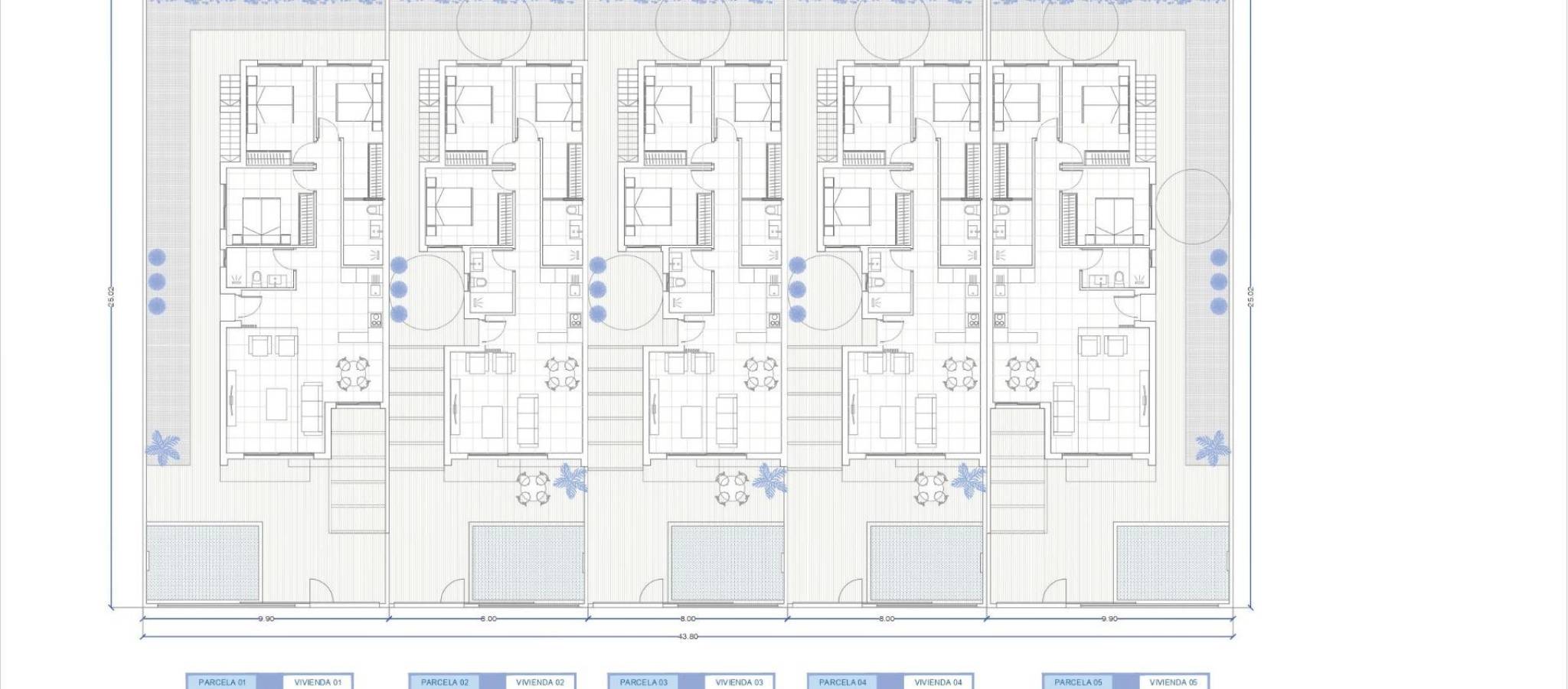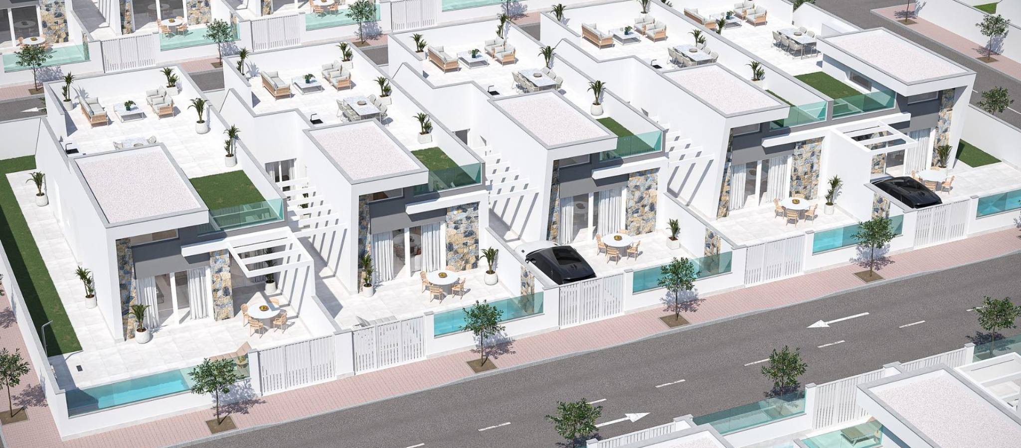 Moderne nybyggede villaer i Los Alcázares Luksusliv nær stranden Oppdag dette eksklusive boligprosjektet med fem enetasjes villaer i den sjarmerende byen Los Alcázares. Hver villa har et privat svømmebasseng med fossefall, et romslig solarium for solskinn året rundt, og moderne interiør designet for komfort og stil. Med tre soverom og to bad er disse boligene perfekte for familier, par eller andre som ønsker et luksuriøst fristed. Kjøkkenet er fullt utstyrt med elegante, svarte hvitevarer, mens den doble takhøyden i oppholdsrommet forsterker følelsen av rom og lys. Førsteklasses funksjoner for en komfortabel livsstil Disse villaene er konstruert med materialer av høy kvalitet og har gjennomtenkte detaljer som sikrer en moderne og praktisk boopplevelse: Utvendig snekkerarbeid i hvit aluminium eller PVC med doble vinduer for optimal solbeskyttelse. Fullt utstyrte bad, inkludert innebygde nisjer i dusjen, speil med belysning og servantskap. Innredede garderober på soverommene med innebygde skuffer. Høyeffektiv varmtvannsbereder for bærekraftig energiforbruk. Forinstallasjon av klimaanlegg via kanaler i stuer og soverom. Privat svømmebasseng med innebygde sitteplasser, trapper, fossefall og undervannsbelysning. Kunstgress og et sommerkjøkken med benkeplate og uttak for et minikjøleskap på solariumet. Førsteklasses beliggenhet i Los Alcázares Disse villaene ligger bare 1,5 km fra de uberørte strendene i Mar Menor, og tilbyr den perfekte balansen mellom ro og bekvemmelighet. Los Alcázares er kjent for sin pulserende kystlivsstil, vannsport og solskinn året rundt. Den nærliggende Serena Golf-banen ligger bare 2 km unna, noe som gjør det ideelt for golfentusiaster. Tilgjengelighet til viktige severdigheter Los Alcázares har utmerkede forbindelser til større byer og attraksjoner: Murcia-Corvera lufthavn: 30 km (20 minutter med bil) Alicante lufthavn: 90 km (1 time med bil) Cartagena: 25 km Zenia Boulevard kjøpesenter: 35 km Serena Golf: 2 km Drømmehuset ditt venter Omfavn middelhavsstilen i disse utsøkte nybyggede villaene i Los Alcázares. Enten du er på utkikk etter et permanent hjem eller et feriested, tilbyr disse eiendommene alt du trenger for en komfortabel og luksuriøs boopplevelse. Kontakt oss i dag for å planlegge en visning eller be om mer informasjon!