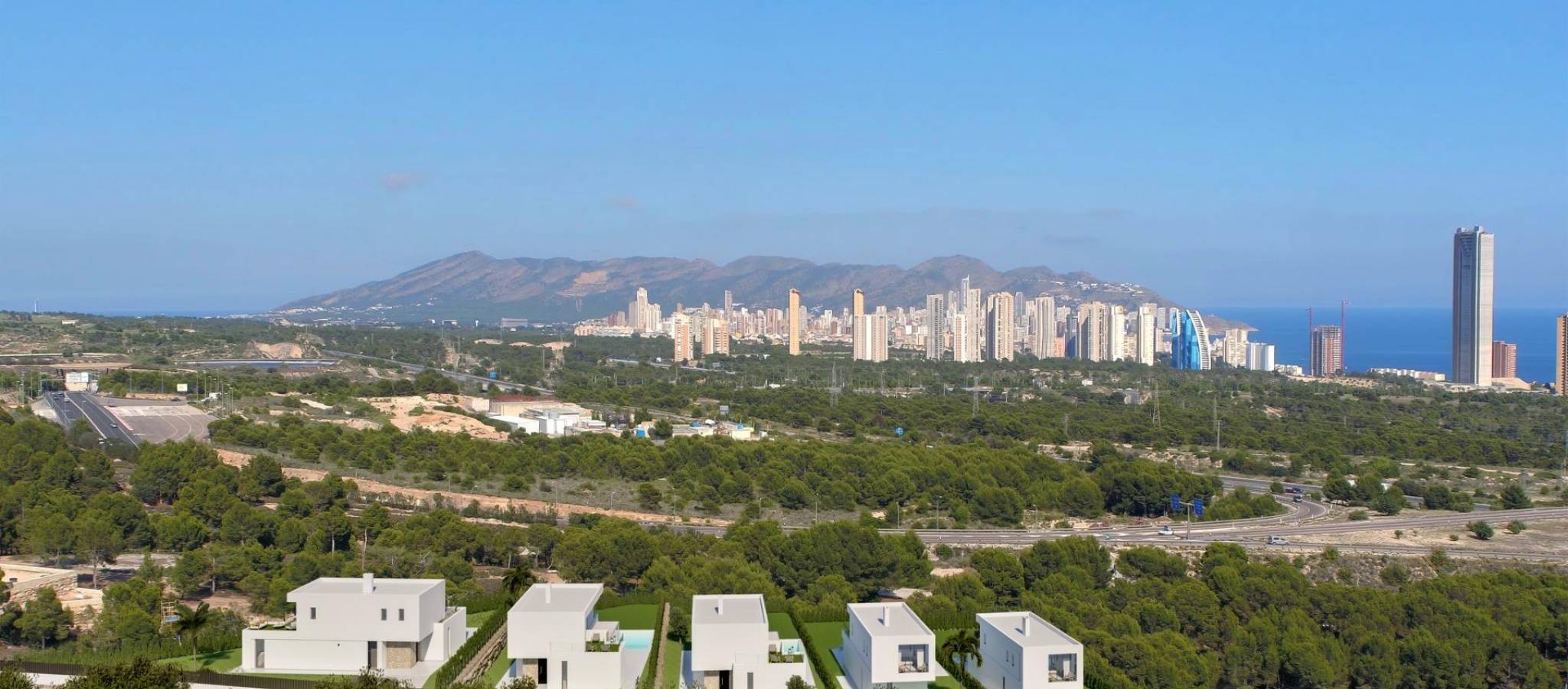 NYBYGGEDE VILLAER I FINESTRAT MED HAVUTSIKT Nybygde luksusvillaer i Sierra Cortina, Finestrat. Villaer med 3 soverom og 3 bad, åpen kjøkkenløsning med stue, terrasse med fantastisk utsikt over Benidorm, privat hage med svømmebasseng og parkeringsplass. Villaene er bygget med materialer av topp kvalitet. Finestrat ligger i Marina Baixa-regionen på Costa Blanca, nær nabobyen Benidorm og ca. 40 kilometer fra byen Alicante og den internasjonale flyplassen. Landsbyen ligger i fjellsiden av Puig Campana og har vakker utsikt over fjellene, kysten og Middelhavet. Benidorm ligger bare en fem minutters kjøretur unna, og her finner du alt du trenger av butikker, barer, restauranter, supermarkeder, banker, apotek og flere private internasjonale skoler.