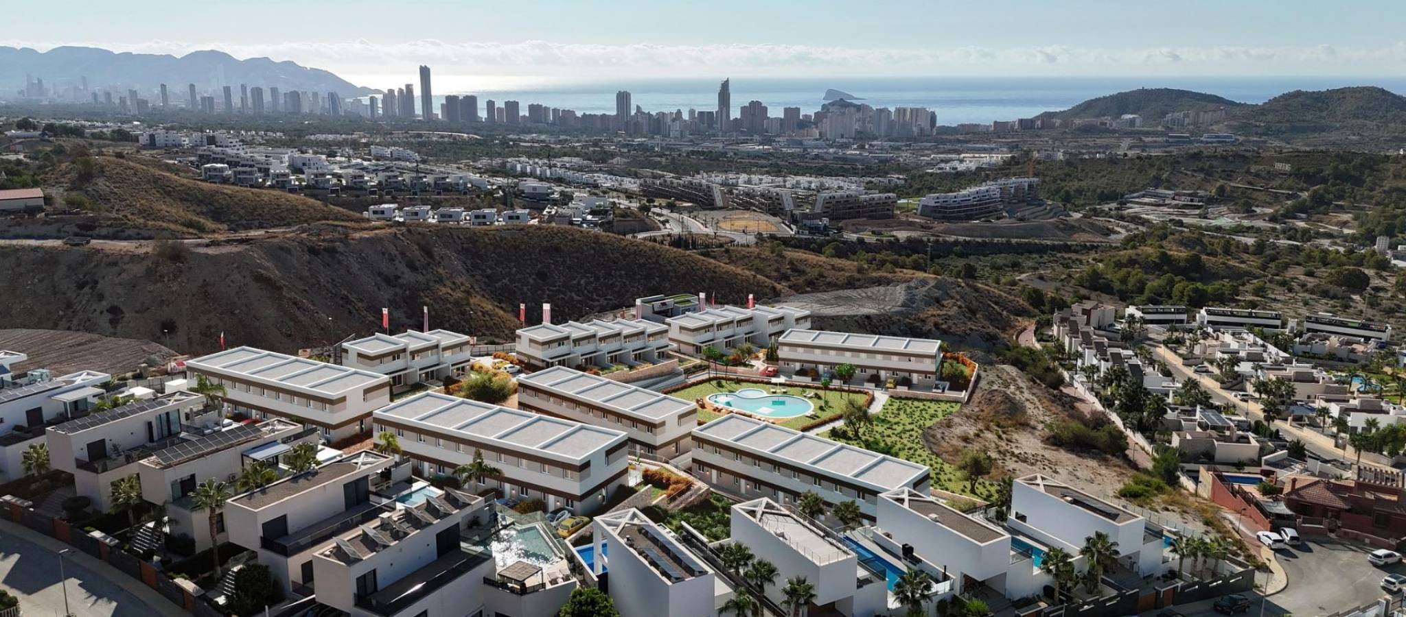 Moderne rekkehus med 3 soverom til salgs i Balcon de Finestrat på Costa Blanca Moderne boliger i en førsteklasses beliggenhet ved Middelhavet Dette nye boligprosjektet med rekkehus med 3 soverom, 2 bad og 1 gjestetoalett ligger i Balcon de Finestrat, et fredelig og velholdt område på Costa Blanca. Bare noen minutter fra Benidorm og ved siden av Puig Campana golfbane, tilbyr denne beliggenheten en ideell balanse mellom natur, sjø og viktige tjenester. Området er kjent for sitt vakre fjellandskap, enkel tilgang til fritidsområder og et behagelig klima hele året. Moderne design med lyse og funksjonelle interiører Rekkehusene har en moderne åpen planløsning. Første etasje har et romslig kjøkken, spisestue og stue fylt med naturlig lys, samt et gjestetoalett. I andre etasje gir dobbeltrommene og fullt utstyrte bad komfort og privatliv for hele familien. Noen enheter har en 50 m2 kjeller med forhåndsinstallert ekstra bad og et åpent rom som eierne kan tilpasse, med direkte tilgang til hagen. Uteområder designet for middelhavsliv Hver eiendom har store terrasser, ideelle for å nyte utsikten over naturen og det solrike været på Costa Blanca. Fellesområdet har svømmebasseng, anlagte hager og utendørs avslapningsområder, som skaper et fredelig miljø for beboerne. Høy kvalitet og energieffektivitet Boligene har fullt utstyrte bad med møbler, speil og dusjvegger, komplett klimaanlegg, solcellepaneler for elektrisk støtte, pansret inngangsdør og energisertifikat A. Kjellere leveres med forhåndsinstallasjon for klimaanlegg. Utmerket tilknytning og nærliggende tjenester Sandstrendene i Benidorm og Villajoyosa ligger bare 4 km unna, og kjøpesenteret La Marina ligger bare en kort kjøretur unna, med restauranter, butikker og underholdning. I nærheten finner du internasjonale skoler, supermarkeder og alle daglige fasiliteter. Avstander av interesse: Alicante lufthavn 40 km, Puig Campana golfbane 1 km, Benidorms strender 4 km, Villajoyosa havn 9 km. En livsstil med komfort og bekvemmelighet Hver eiendom har en eller to private utendørs parkeringsplasser, noe som sikrer praktisk og komfortabel bruk hele året. Kontakt oss i dag for å avtale en visning og sikre deg ditt nye hjem i Balcon de Finestrat.