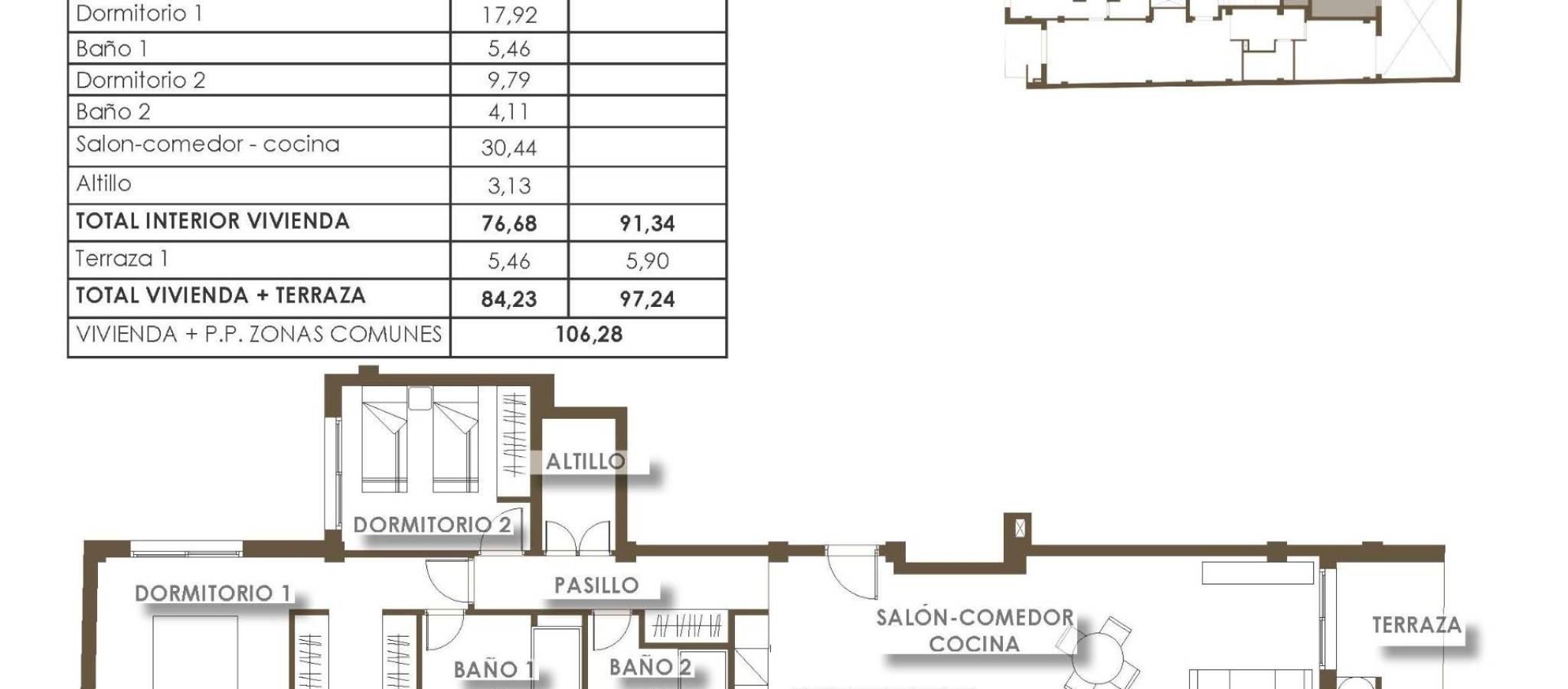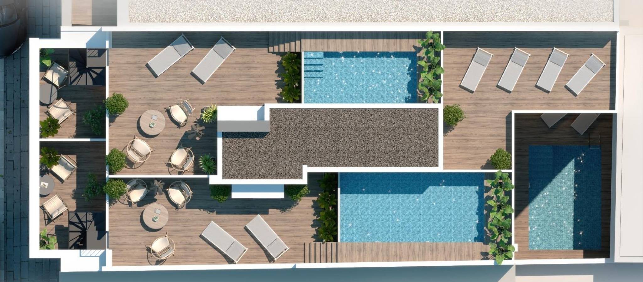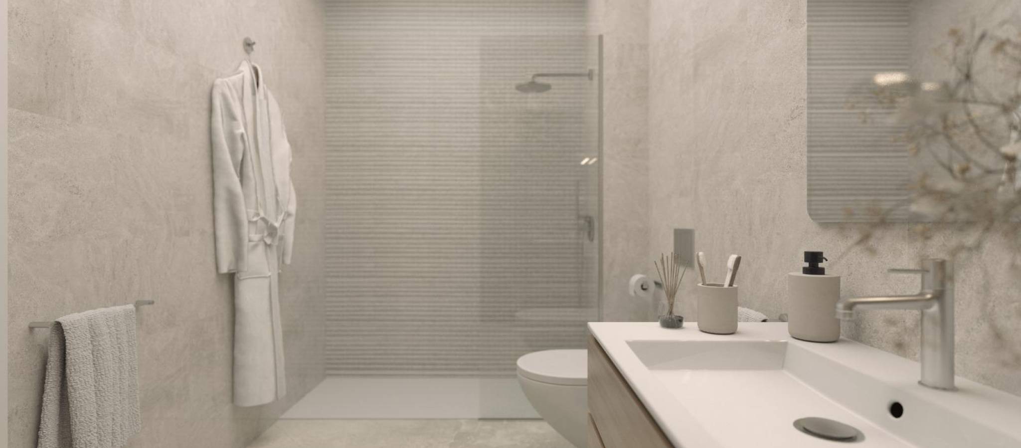 Moderne nybyggede leiligheter i hjertet av Torrevieja Førsteklasses beliggenhet bare 150 m fra sjøen Dette eksepsjonelle nybygget ligger i sentrum av Torrevieja, bare 150 m fra de naturlige svømmebassengene og strandpromenaden, og bare 500 m fra Playa del Cura. Området er omgitt av et omfattende utvalg av tjenester, inkludert butikker, supermarkeder, parker, kafeer og restauranter, og tilbyr alt du trenger innen kort gangavstand. Kombinasjonen av urbane bekvemmeligheter og kystnær ro gjør dette til et av de mest attraktive boligområdene i byen. Moderne leiligheter med 1 og 2 soverom Utbyggingen tilbyr moderne leiligheter med 1 eller 2 soverom og 1 eller 2 bad, inkludert to eksklusive penthouse-leiligheter med privat solarium, grill og privat basseng. Alle boligene er designet med åpne planløsninger som maksimerer naturlig lys, med romslige terrasser og stilige kjøkken i amerikansk stil. Hver leilighet har et fullt utstyrt kjøkken med hvitevarer, komplette bad med møbler, dusjvegger og gulvvarme, samt innvendig belysning. Det er også forhåndsinstallert for sentral klimaanlegg, som sikrer komfort hele året. Attraktive fellesområder for avslapning Beboerne kan nyte gode fellesfasiliteter designet for velvære og fritid. Første etasje har et forfriskende felles svømmebasseng og en avslappende badstue. Takterrassen har et felles solarium, ideelt for soling og for å nyte middelhavsatmosfæren. Nyt et unikt kyst- og naturområde Torrevieja er kjent for sitt milde middelhavsklima, med en gjennomsnittlig årstemperatur på 20 ºC, perfekt for å bo der hele året. Byen er hjemsted for de berømte saltsjøene og den beskyttede naturparken La Mata og Torrevieja, som ligger bare 4 km fra boligprosjektet. Med sine livlige rosa og grønne laguner, naturskjønne turstier og mangfoldige dyreliv, tilbyr den et sunt og inspirerende naturmiljø. Avstander til viktige severdigheter Puerto Deportivo de Torrevieja 1 km Parque Natural de La Mata 4 km Villamartin Golf 8 km Alicante lufthavn 45 km Murcia lufthavn 60 km Lev middelhavslivet Sikre deg et moderne hjem i en av de mest ettertraktede kystbyene på Costa Blanca. Kontakt oss i dag for å avtale et besøk og reservere din plass i dette enestående nye boligprosjektet.