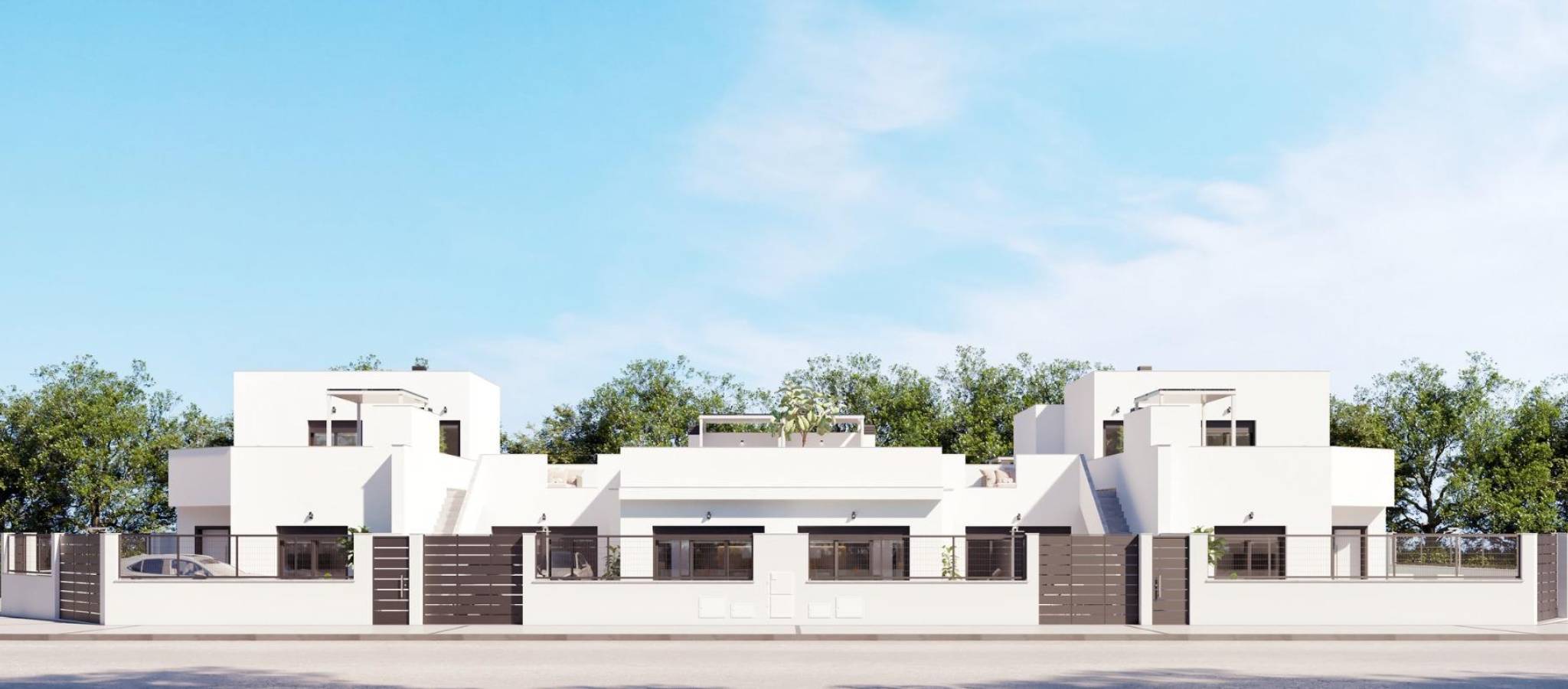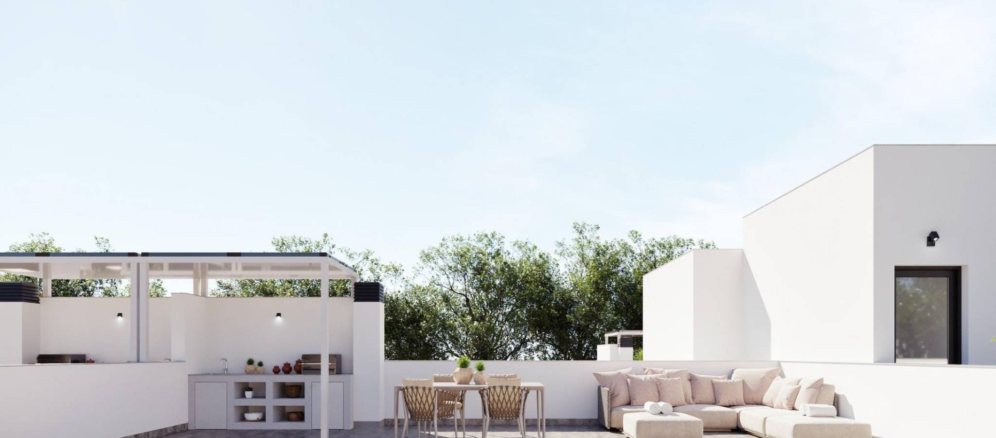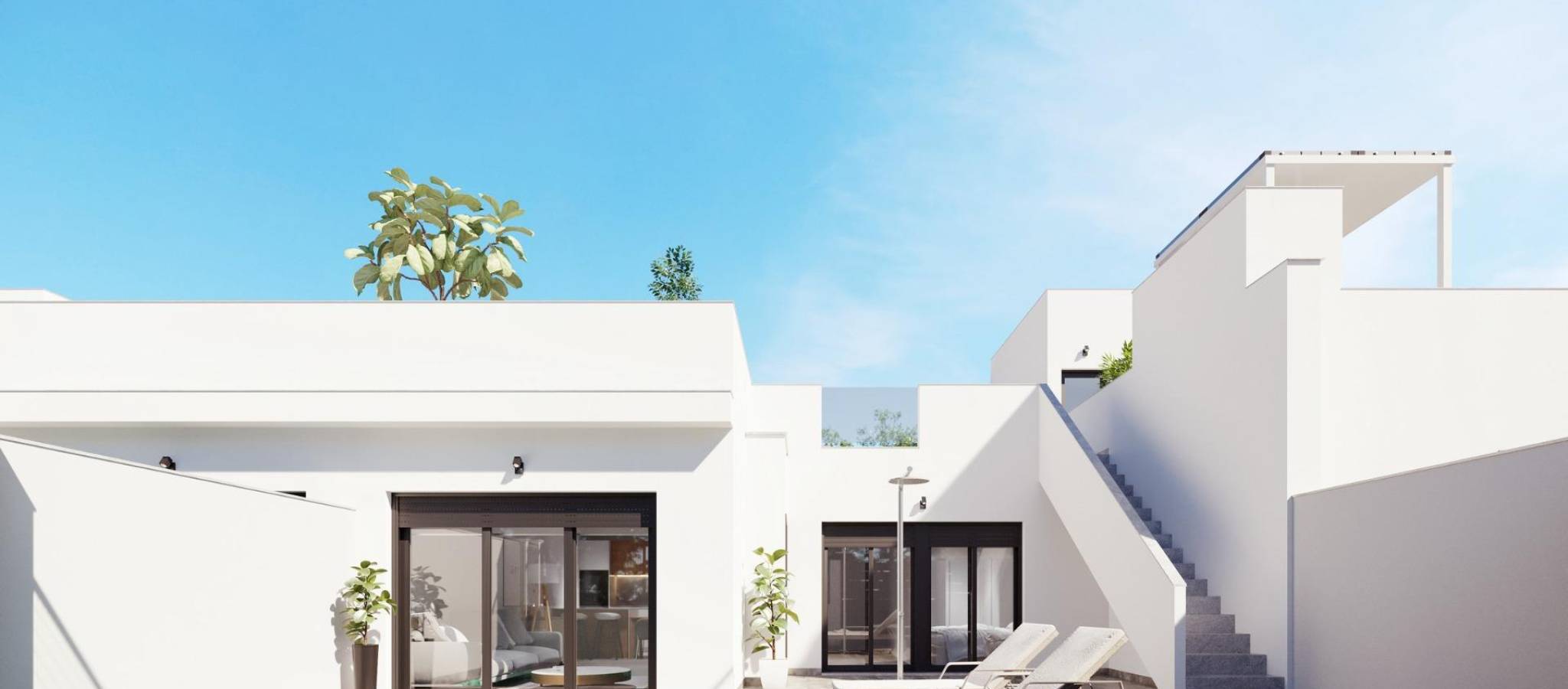 NYBYGG I TORRE-PACHECO Nybygg med 8 rekkehus og firemannsboliger i Torre-Pacheco. Moderne boliger med 2 soverom og 2 bad, åpen kjøkkenløsning med stue, garderober, terrasse, privat solarium, hage med basseng og parkeringsplass. Disse eksklusive boligene er designet med elegant og funksjonelt interiør, fullt utstyrt kjøkken, inkludert elektriske apparater. Badene har servantskap med servant og belysning. Soverommene har garderobeskap med skuffer, og alle boligene har forhåndsinstallert klimaanlegg. Eksteriøret er ikke mindre imponerende, med blant annet et privat svømmebasseng og et stort solarium med sommerkjøkken, slik at du kan nyte solen hele året. I tillegg har boligene forhåndsinstallasjon for elbilladere. Leilighetene ligger ved siden av Club de Golf, Torre Pacheco, hvor du finner alle fasiliteter, inkludert barer, restauranter, supermarkeder og banker, og en 15-minutters kjøretur til de vakre strendene i Mar Menor. Torre Pacheco er omgitt av prisbelønte golfbaner, og hele regionen regnes som et av de sunneste stedene i Spania. Denne ideelle beliggenheten gir deg så mye mer for pengene. Gangavstand til lokale fasiliteter og mange barer og restauranter. Motorveinettet ligger i nærheten, slik at du raskt og enkelt kan reise til andre områder. Murcias internasjonale flyplass ligger 20 minutter unna.