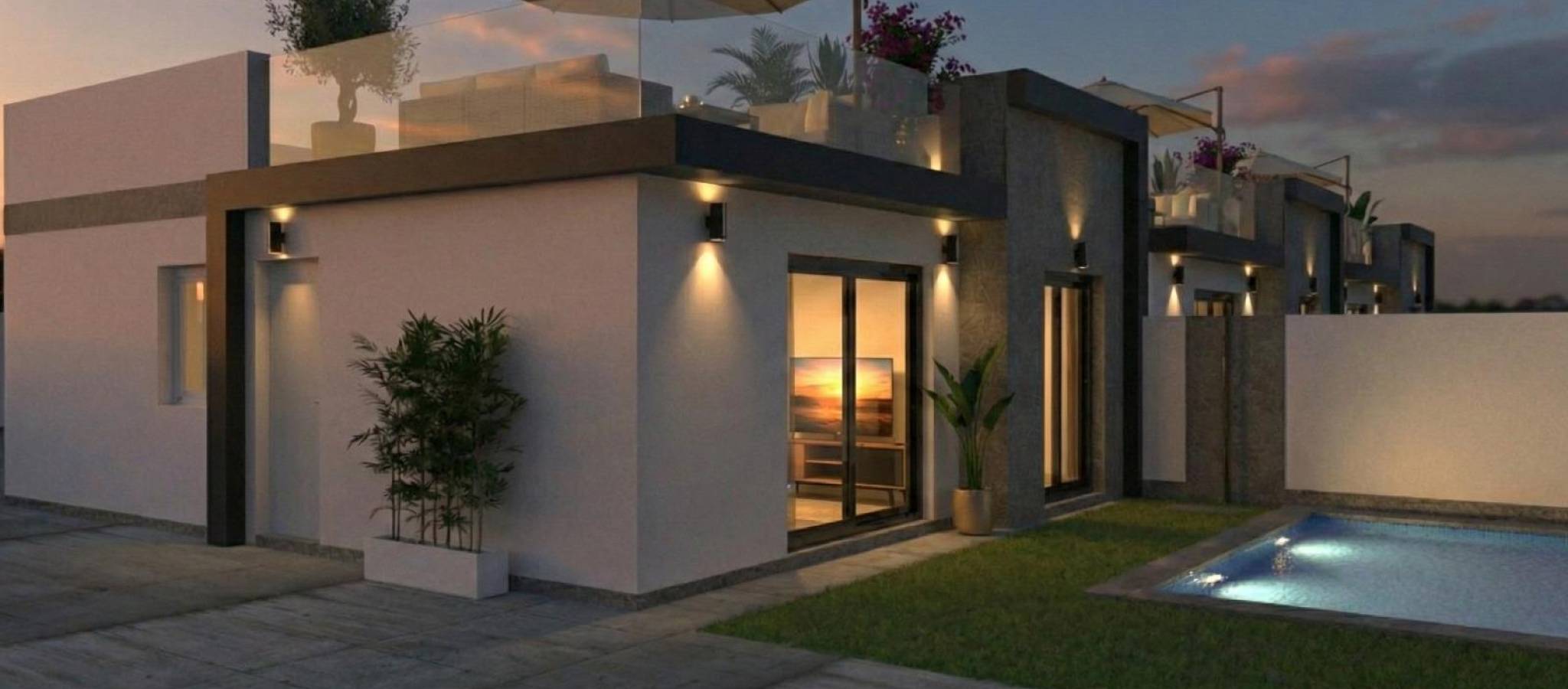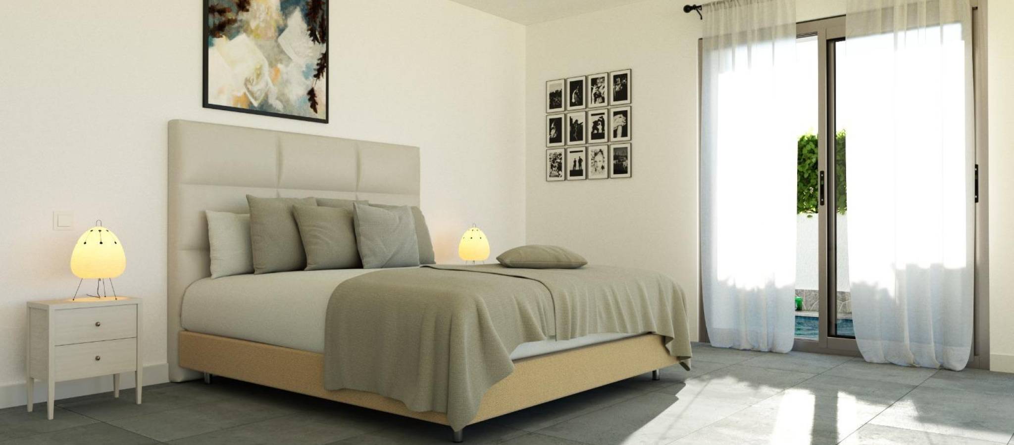 Luksuriøse villaer i ett plan med private bassenger i Balsicas, Murcia Eksklusivt nybygg Oppdag et eksklusivt kompleks med 5 frittliggende villaer i Balsicas, hver designet i ett plan og med privat svømmebasseng, romslige terrasser og et spektakulært solarium på taket. Disse moderne boligene har 3 soverom og 2 bad, og kombinerer komfort, privatliv og moderne stil i et av de mest fredelige og godt tilknyttede områdene i Murcia. Moderne design og høykvalitetsfunksjoner Disse villaene skiller seg ut med sin åpne planløsning, hvor det fullt utstyrte kjøkkenet smelter sømløst sammen med den lyse stuen og spisestuen. Hver eiendom inkluderer: Fullt møblert kjøkken med hvitevarer Komplette bad med møbler, speil og dusjvegg Privat basseng Parkeringsplass på tomten Belysning inkludert, unntatt dekorative lamper Forhåndsinstallasjon av kanalisert klimaanlegg Sommerkjøkken på solterrassen Den enetasjes utformingen sikrer maksimal komfort, mens det store solariet lar deg nyte solen hele året. Et fredelig og godt tilknyttet område Balsicas er kjent for sin sjarmerende atmosfære, omgitt av natur, golfbaner og store grønne områder. Det er et ideelt sted for de som liker friluftsliv, ro og varmt middelhavsklima. Byen tilbyr alle nødvendige tjenester, restauranter og fritidsaktiviteter innen få minutter. Avstander til viktige severdigheter: Murcia internasjonale lufthavn Corvera: ca. 22 km Alicante lufthavn: ca. 90 km Nærmeste golfbaner: New Sierra Golf 4 km, La Torre Golf 8 km, Hacienda Riquelme 12 km Strendene ved Mar Menor: ca. 18 km Havnen i San Pedro del Pinatar: ca. 24 km Ideelt for å bo eller investere Takket være det utmerkede klimaet, nærheten til Mar Menor og enkel tilgang til flyplasser, er Balsicas et attraktivt reisemål både for permanent opphold og ferieinvesteringer. Området er spesielt populært blant golfelskere og de som søker en avslappet livsstil omgitt av natur. Ta neste steg Disse luksuriøse villaene tilbyr alt du trenger for et komfortabelt middelhavsliv. Kontakt oss i dag og sikre deg din plass i dette eksklusive boligprosjektet.