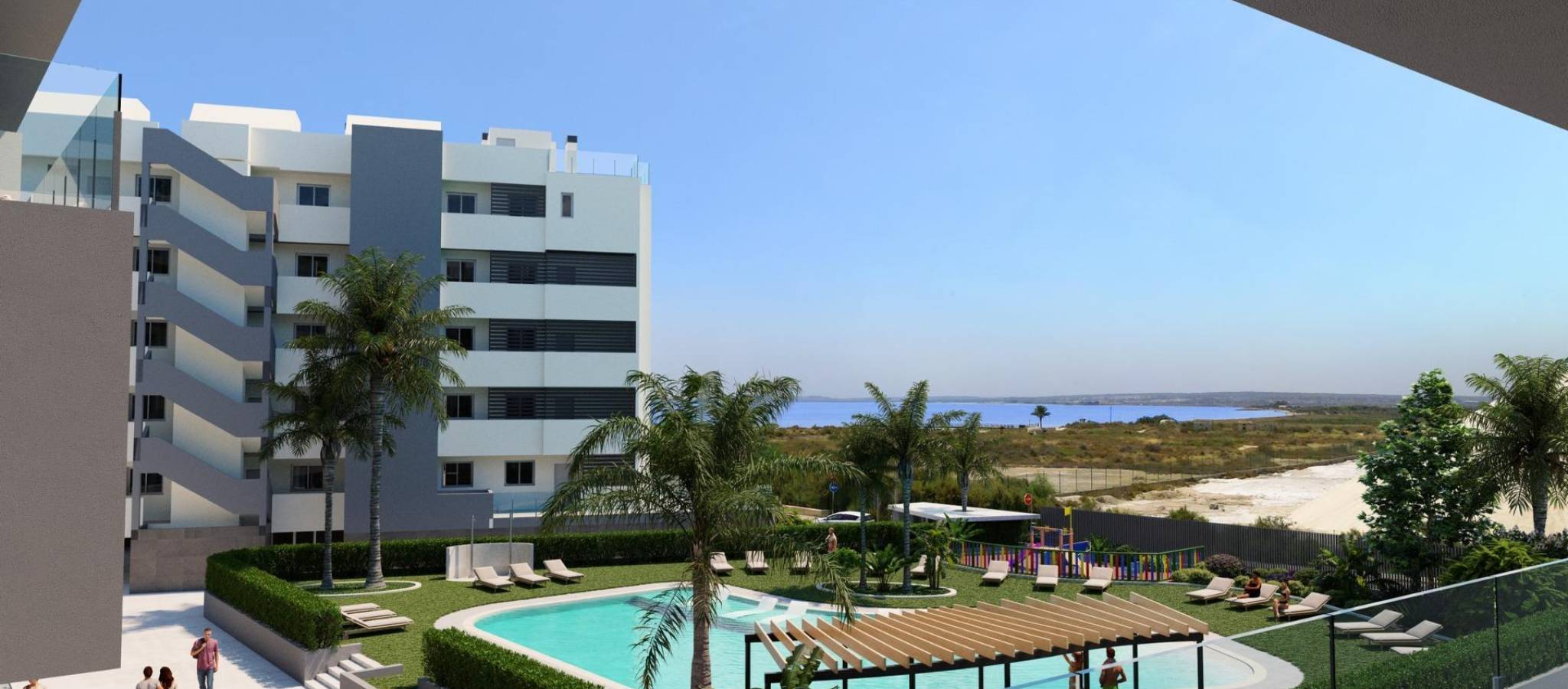 NYBYGD BOLIGKOMPLEKS I SANTA POLA Moderne inngjerdet boligkompleks bestående av 3 boligblokker med store anlagte fellesområder, inkludert et svømmebasseng med vannsenger, lekeplass, pergola og sykkelparkering. Boligen har leiligheter med 3 og 2 soverom, begge typer inkluderer 2 komplette bad, åpen kjøkkenløsning med stue, garderober, terrasse, parkeringsplass. De har en felles hage, svømmebasseng med strandinngang, utstyrt med dusjer og en stor pergola i tre. Det har anlagte områder med palmer og vegetasjon, som alle er opplyst. I den sentrale delen av bassenget er det et grunnere område der vannsengene ligger. Santa Pola kommune ligger på den populære Costa Blanca ved Middelhavet, sør for Alicante og i Bajo Vinalopó-regionen. Byen har en misunnelsesverdig geografisk beliggenhet, omgitt av naturlandskap og med et spesielt mikroklima som gir et mildt klima året rundt. Byens sentrum er avgrenset av festningen og havnen i øst og vest, og grenser til naturparken Santa Pola Salinas og Sierra og Cabo de Santa Pola, et gammelt rev som i dag kjennetegnes av sine løvrike furutrær. Santa Pola ligger 21 km. fra Alicante, provinshovedstaden med utmerket infrastruktur og 15 km. fra den internasjonale flyplassen "Elche-Alicante".