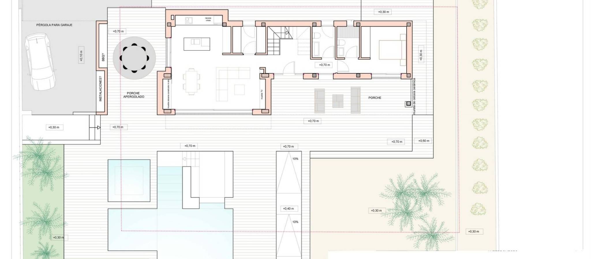 NYBYGD VILLA I CABO ROIG Nybygget luksusvilla i Cabo Roig, Orihuela Costa. Denne imponerende villaen er vårt mesterverk, nøye utvalgt i alt fra materialer til fengslende mønstre som skaper en følelse av tidløs skjønnhet i alle rom. Med estetisk og funksjonell planlegging i tankene har villaen en nøye gjennomtenkt design som optimaliserer plassen og forbedrer hverdagen. De sjenerøse vinduene flommer over interiøret med behagelig naturlig lys og skaper en sømløs forbindelse med omgivelsene. Når man bor her, har man nærhet til havet og kan nyte den avslappende effekten av å bo ved kysten. I tillegg forsterker den forfriskende havbrisen sjarmen til denne eksepsjonelle eiendommen. Cabo Roig er en vakker urbanisering ved bredden av Middelhavet sør på Costa Blanca, som tilhører Orihuela Costa og er et av de mest eksklusive områdene på Costa Blanca. Som navnet indikerer, er Cabo Roig en odde som går ut i havet og derfor er omgitt av strender, alle med blått flagg. Et av de viktigste kjennetegnene ved Cabo Roig er den lave bebyggelsestettheten, der de fleste eiendommene er villaer på store tomter like ved kysten. Dette, sammen med de berømte hvite sandstrendene og det store utvalget av aktiviteter knyttet til havet, nærheten til kjøpesenteret La Zenia Boulevard og golfbanene i Campoamor og Villamartin, gjør denne byen til et paradis og et privilegert sted å feriere, bli boende eller til og med bosette seg permanent. En vakker og romantisk strandpromenade lar deg spasere langs hele kystlinjen og forbinder de tilstøtende urbanisasjonene. I fremtiden er det planlagt å nå byene Torrevieja og Torre de la Horadada.