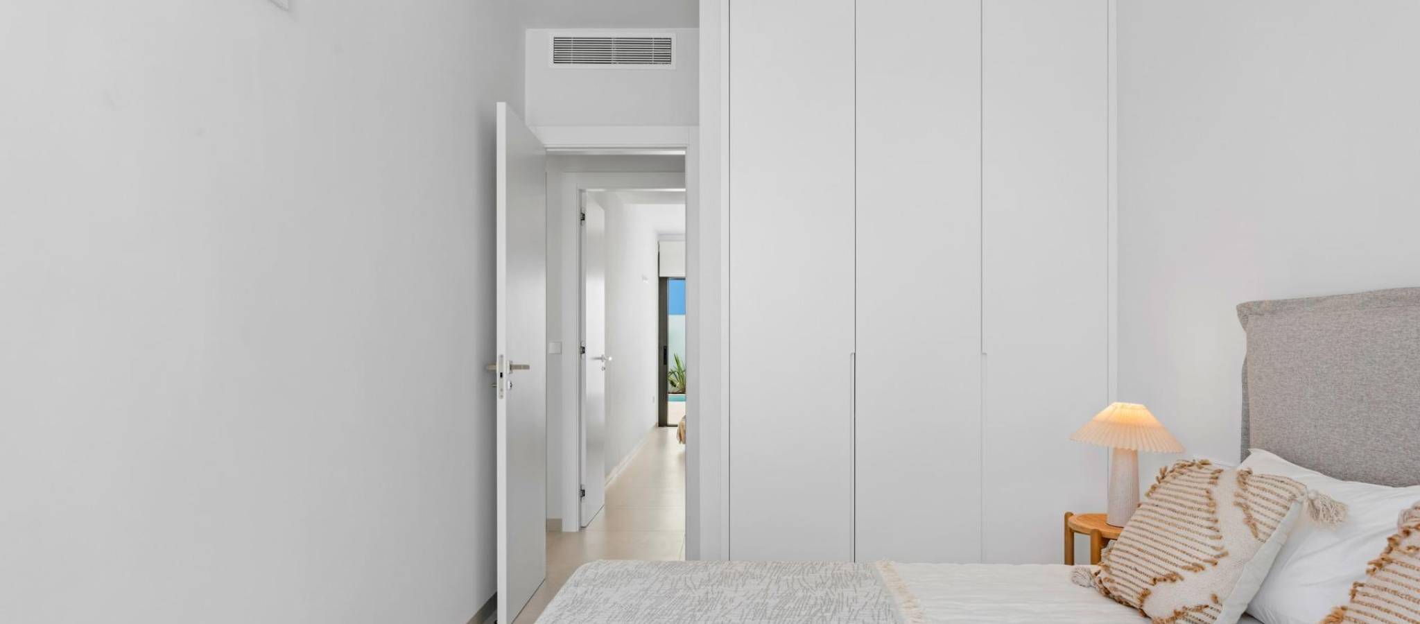 Nybyggede villaer nær Serena Golf i Los Alcazares Moderne villaer i en førsteklasses beliggenhet ved kysten og golfbanen Dette eksklusive nybyggprosjektet tilbyr moderne villaer i Los Alcazares, like ved den prestisjetunge Serena Golf og bare 1,2 km fra sandstrendene ved Mar Menor. Disse boligene ligger i et av de mest attraktive områdene i Murcia-regionen og kombinerer moderne design, komfort og en utmerket beliggenhet nær sjøen, golfbanen og alle daglige tjenester. Los Alcazares er en veletablert kystby kjent for sin avslappede livsstil, lange promenade, vannsport og milde klima gjennom hele året. Enetasjes design med private uteområder Utbyggingen består av stilige villaer med 3 soverom og 2 bad, tilgjengelig i to forskjellige størrelser på henholdsvis ca. 106 kvm og 130 kvm. Den største modellen har også et ekstra gjestetoalett. Alle villaene er designet i én etasje, noe som gir praktisk og komfortabel boform. Det åpne kjøkkenet, spisestuen og stuen har direkte tilgang til en terrasse og privat hage med svømmebasseng, noe som skaper et ideelt rom for innendørs og utendørs opphold. Hver eiendom har også et privat solarium og parkering på tomten. Høy kvalitet og moderne utstyr Disse villaene er bygget med materialer av høy kvalitet og utstyrt med moderne funksjoner. De fullt utstyrte kjøkkenene er tilgjengelige i hvit høyglans eller trefinish og inkluderer benkeplater i kvarts, vask i rustfritt stål, induksjonstopp med integrert avtrekk, stekeovn, mikrobølgeovn, vaskemaskin, integrert kjøleskap og oppvaskmaskin. Badene er utstyrt med møbler, speil, belysning og elektriske håndklestørkere. Ytterligere funksjoner inkluderer elektriske persienner i soverommene, LED-belysning i hele eiendommen og et komplett kanalisert klimaanlegg fra Fujitsu. Privat basseng og energieffektiv komfort Hver villa har et privat svømmebasseng med blå keramiske fliser, integrerte trappetrinn og hvit LED-belysning. Bassenget er forberedt for installasjon av varmepumpe. Kombinasjonen av effektiv klimakontroll, moderne konstruksjon og gjennomtenkt design sikrer komfort hele året. Utmerket tilknytning og viktige avstander Villaene ligger i gangavstand fra sentrum av Los Alcazares og svært nær Serena Golf. Stranden ligger omtrent 1,2 km unna. Byen Cartagena ligger rundt 20 km unna og tilbyr et rikt kulturelt og gastronomisk miljø. Murcia Corvera internasjonale lufthavn ligger omtrent 22 km unna, og Alicante lufthavn ligger omtrent 90 km unna. Flere golfbaner og marinaer ligger også i nærheten, noe som gjør dette stedet ideelt både for permanent opphold og ferier. Ditt ideelle hjem ved sjøen og golfbanen Hvis du er på utkikk etter en moderne nybygget villa nær stranden og golfbanen i Los Alcazares, kan du kontakte oss i dag for mer informasjon eller for å avtale en privat visning.