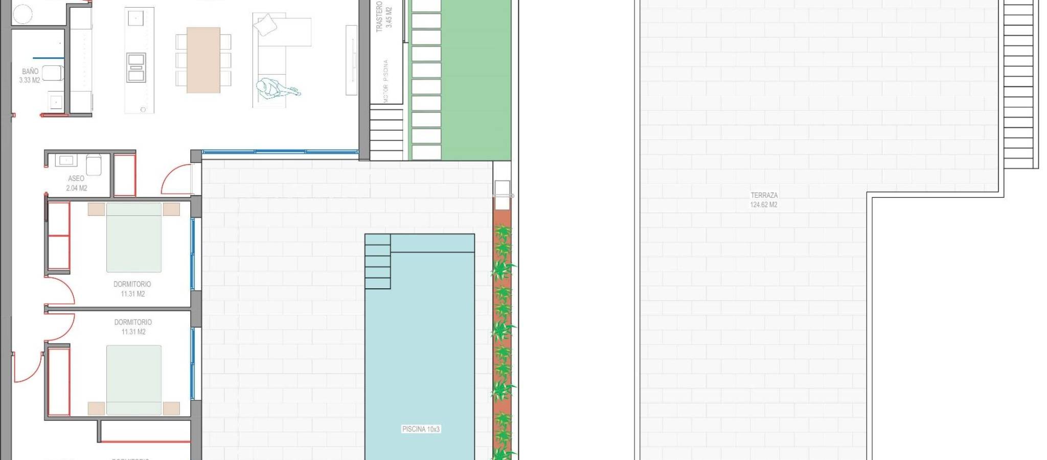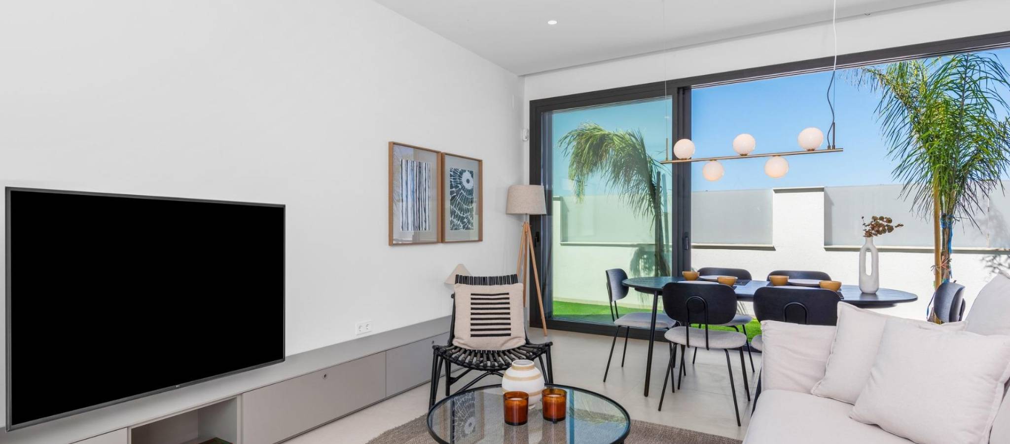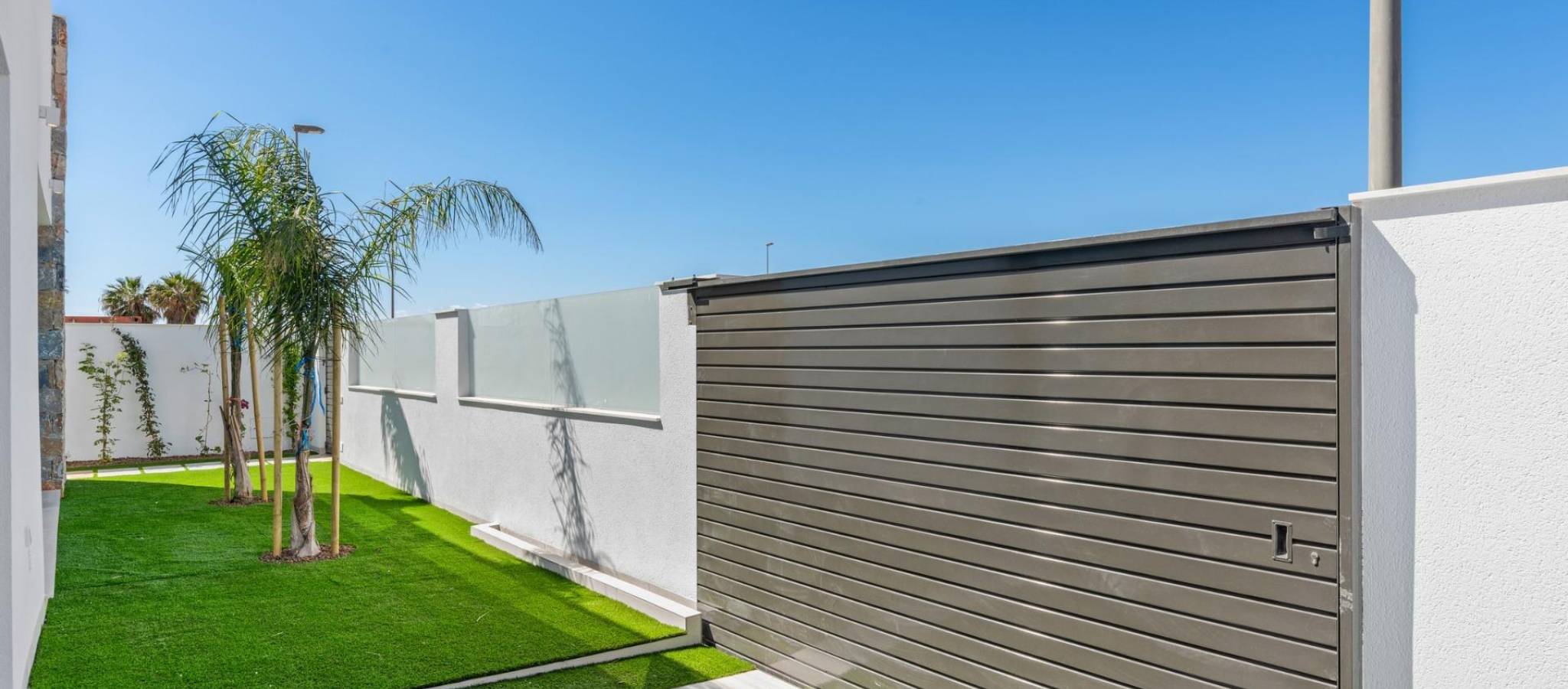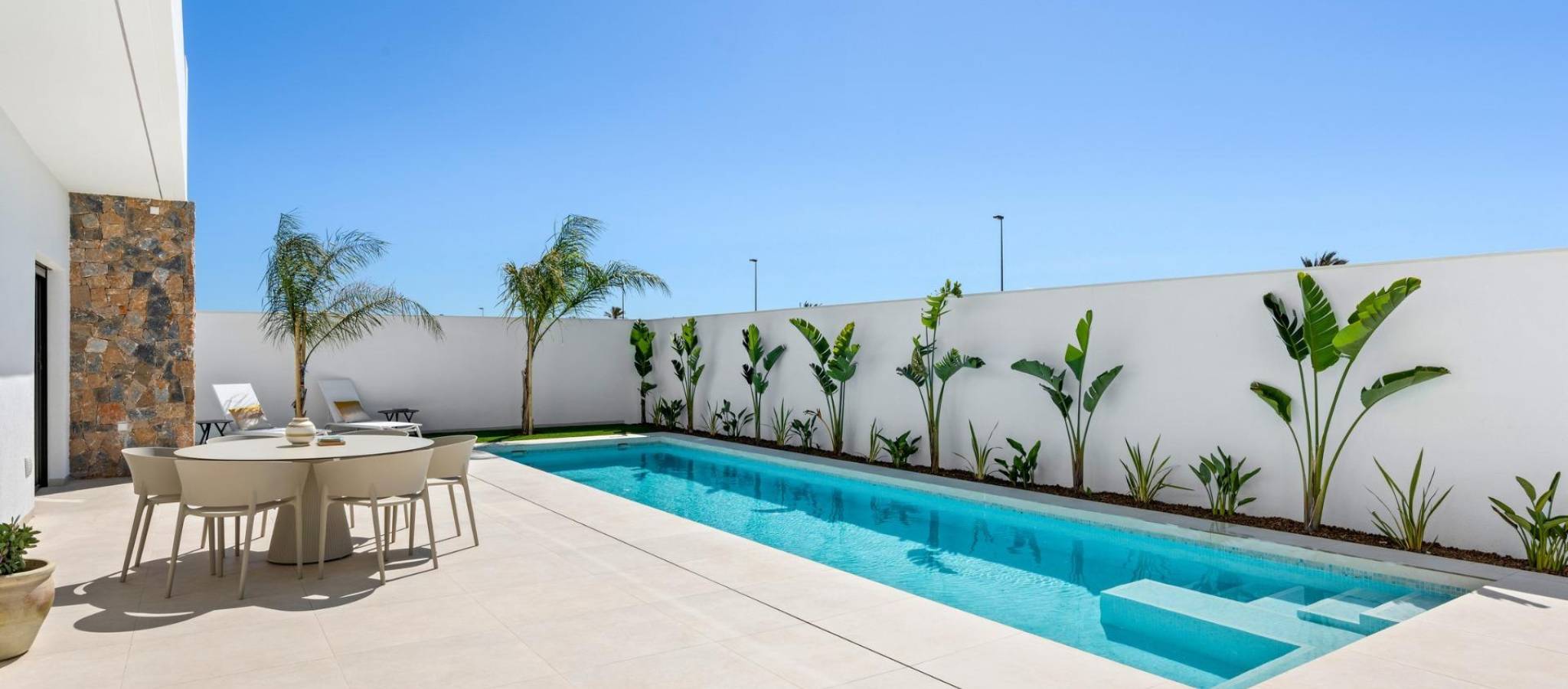Nybyggede villaer nær Serena Golf i Los Alcazares Moderne villaer i en førsteklasses beliggenhet ved kysten og golfbanen Dette eksklusive nybyggprosjektet tilbyr moderne villaer i Los Alcazares, like ved den prestisjetunge Serena Golf og bare 1,2 km fra sandstrendene ved Mar Menor. Disse boligene ligger i et av de mest attraktive områdene i Murcia-regionen og kombinerer moderne design, komfort og en utmerket beliggenhet nær sjøen, golfbanen og alle daglige tjenester. Los Alcazares er en veletablert kystby kjent for sin avslappede livsstil, lange promenade, vannsport og milde klima gjennom hele året. Enetasjes design med private uteområder Utbyggingen består av stilige villaer med 3 soverom og 2 bad, tilgjengelig i to forskjellige størrelser på henholdsvis ca. 106 kvm og 130 kvm. Den største modellen har også et ekstra gjestetoalett. Alle villaene er designet i én etasje, noe som gir praktisk og komfortabel boform. Det åpne kjøkkenet, spisestuen og stuen har direkte tilgang til en terrasse og privat hage med svømmebasseng, noe som skaper et ideelt rom for innendørs og utendørs opphold. Hver eiendom har også et privat solarium og parkering på tomten. Høy kvalitet og moderne utstyr Disse villaene er bygget med materialer av høy kvalitet og utstyrt med moderne funksjoner. De fullt utstyrte kjøkkenene er tilgjengelige i hvit høyglans eller trefinish og inkluderer benkeplater i kvarts, vask i rustfritt stål, induksjonstopp med integrert avtrekk, stekeovn, mikrobølgeovn, vaskemaskin, integrert kjøleskap og oppvaskmaskin. Badene er utstyrt med møbler, speil, belysning og elektriske håndklestørkere. Ytterligere funksjoner inkluderer elektriske persienner i soverommene, LED-belysning i hele eiendommen og et komplett kanalisert klimaanlegg fra Fujitsu. Privat basseng og energieffektiv komfort Hver villa har et privat svømmebasseng med blå keramiske fliser, integrerte trappetrinn og hvit LED-belysning. Bassenget er forberedt for installasjon av varmepumpe. Kombinasjonen av effektiv klimakontroll, moderne konstruksjon og gjennomtenkt design sikrer komfort hele året. Utmerket tilknytning og viktige avstander Villaene ligger i gangavstand fra sentrum av Los Alcazares og svært nær Serena Golf. Stranden ligger omtrent 1,2 km unna. Byen Cartagena ligger rundt 20 km unna og tilbyr et rikt kulturelt og gastronomisk miljø. Murcia Corvera internasjonale lufthavn ligger omtrent 22 km unna, og Alicante lufthavn ligger omtrent 90 km unna. Flere golfbaner og marinaer ligger også i nærheten, noe som gjør dette stedet ideelt både for permanent opphold og ferier. Ditt ideelle hjem ved sjøen og golfbanen Hvis du er på utkikk etter en moderne nybygget villa nær stranden og golfbanen i Los Alcazares, kan du kontakte oss i dag for mer informasjon eller for å avtale en privat visning.