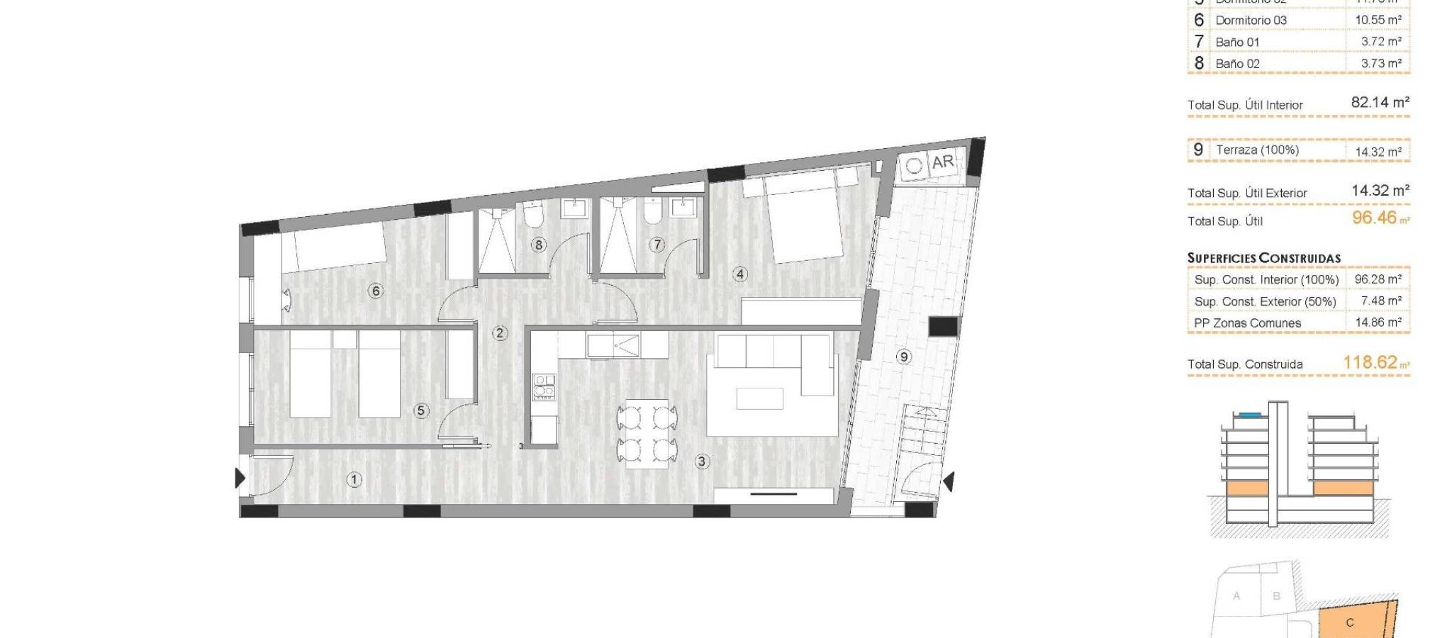 Nybyggede leiligheter i hjertet av Torrevieja Bare 400 m fra Playa del Cura Førsteklasses beliggenhet i sentrum av Torrevieja Dette nye boligbygget har en uovertruffen beliggenhet i sentrum av Torrevieja, bare 400 m fra Playa del Cura. Omgitt av butikker, supermarkeder, restauranter og daglige tjenester, tilbyr det alt du trenger innen gangavstand. Området gir også tilgang til parker, fritidssoner og grønne områder, og skaper en perfekt balanse mellom urbane bekvemmeligheter og øyeblikk av avslapning. Moderne boliger med 2 og 3 soverom Prosjektet tilbyr et utvalg av leiligheter med 2 og 3 soverom, inkludert penthouse-leiligheter, noen av dem med private solterrasser. Hver bolig er designet i moderne stil, med åpen planløsning, store terrasser og integrerte kjøkken i amerikansk stil. Badene er fullt utstyrt med møbler, dusjvegger og gulvvarme. Kjøkkenene inkluderer hvitevarer, og hver leilighet har forhåndsinstallert kanalisert klimaanlegg. Valgfri underjordisk parkering og bod er tilgjengelig. Fasiliteter i resort-stil for velvære Beboerne kan nyte en rekke eksklusive fasiliteter. Første etasje har et fullt utstyrt treningsstudio, ideelt for daglige treningsøkter. Solariet på taket er en ekte oase for avslapning med solsenger, finsk sauna og et minibasseng. Både heisen og trappen går direkte til taket for maksimal bekvemmelighet og tilgjengelighet. Bo i et unikt natur- og kystmiljø Torrevieja er kjent for sitt varme middelhavsklima, med en gjennomsnittlig årstemperatur på 20 ºC, noe som gjør det til et perfekt sted å bo hele året. Byen er kjent for sine naturlige saltlaguner og den beskyttede naturparken La Mata og Torrevieja, som ligger bare 4 km fra boligkomplekset. De rosa og grønne innsjøene, de naturskjønne turstiene og den rike biologiske mangfoldigheten tilbyr en sunn og inspirerende livsstil. Avstander til viktige severdigheter Playa del Cura 0,4 km Torrevieja Marina 1 km La Mata naturpark 4 km Villamartin Golf 8 km Alicante lufthavn 45 km Murcia lufthavn 60 km Opplev middelhavslivsstilen Ikke gå glipp av muligheten til å eie et moderne hjem i en av Costa Blancas mest attraktive kystbyer. Kontakt oss i dag for å avtale et besøk og sikre deg en plass i dette eksepsjonelle nye boligprosjektet.