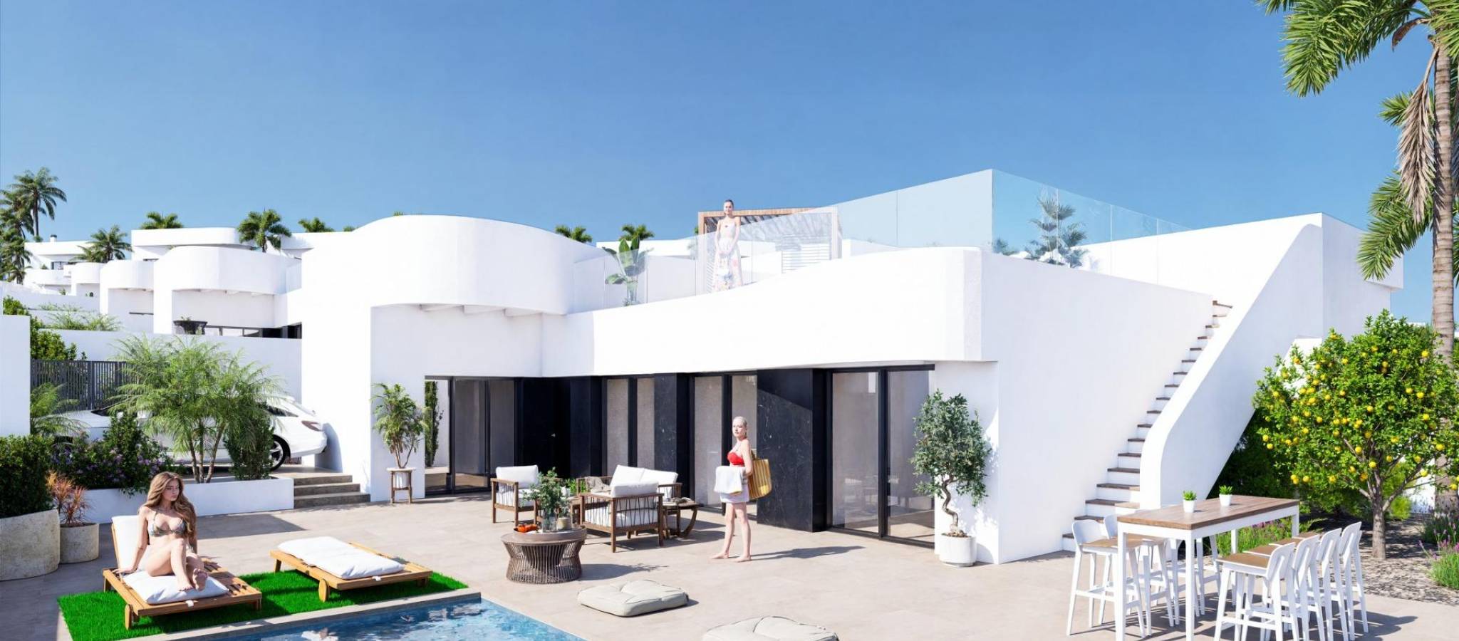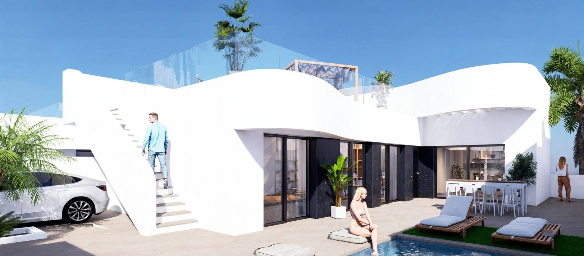 Nybyggede villaer i La Finca Golf Resort Algorfa Eksklusivt nybygg i et prestisjefylt golfmiljø Dette nye boligprosjektet med 53 moderne villaer ligger i det kjente La Finca Golf Resort i Algorfa, et av de mest ettertraktede områdene på Costa Blanca Sør. Omgitt av frodige grønne landskap, sitruslunder og golfbanens bølgende fairways, tilbyr dette stedet ro, privatliv og en middelhavsstil av høy kvalitet, samtidig som det ligger nær viktige tjenester og kysten. Valg av villamodeller og planløsninger Prosjektet tilbyr et bredt utvalg av frittliggende og tomannsboliger i tre forskjellige størrelser på omtrent 98 m2, 111 m2 eller 135 m2. Boligene er tilgjengelige i én eller to etasjer, og alle har tre soverom og to bad. De større modellene har også et gjestetoalett. Villaene i én etasje har et romslig privat solarium på taket, mens boligene i to etasjer har en stor åpen terrasse i øverste etasje. Noen enheter har kjeller, og andre tilbyr dette som et tilleggsvalg mot ekstra kostnad. Alle villaene har privat svømmebasseng og parkeringsplass på tomten. Ibiza-stil og utendørs liv Villaene skiller seg ut med sin elegante Ibiza-stil med myke, buede linjer og lyse, hvite overflater som passer perfekt inn i de naturlige omgivelsene. De romslige uteområdene er designet for å nyte det milde klimaet hele året, og tilbyr ideelle rom for avslapning, underholdning og for å få mest mulig ut av utendørslivet i et fredelig golfmiljø. Høy kvalitet og komfort Alle boligene er bygget etter høye standarder og har forsterket sikkerhetsdør, fullt utstyrt kjøkken, forhåndsinstallert sentralvarme og et aerotermisk system for varmt vann. Disse funksjonene sikrer komfort, energieffektivitet og moderne livsstil, enten det er som permanent bolig eller feriehus. La Finca Golf Resort og Algorfa Lifestyle La Finca Golf Resort er kjent for sin mesterskapsgolfbane, luksushotell, spa-fasiliteter, restauranter og sportsområder, alt i et trygt og velholdt miljø. Algorfa er en sjarmerende spansk by med lokale butikker, tradisjonelle restauranter og en avslappet atmosfære, mens nærliggende byer tilbyr et bredere utvalg av tjenester og fasiliteter. Viktige avstander og forbindelser La Finca golfbane ligger innenfor resortet. Guardamar del Segura-strendene ligger omtrent 14 km unna. Kjøpesentre i Torrevieja og Orihuela Costa ligger rundt 15 km unna. Almoradi, Benijofar og Ciudad Quesada ligger mellom 5 og 10 km unna. Alicante internasjonale lufthavn ligger omtrent 35 km unna. En smart investering på Costa Blanca Med over 300 soldager i året, utmerkede veiforbindelser og nærhet til golf, strender og shoppingområder, er disse villaene ideelle for å bo, feriere eller investere i. Kontakt oss i dag Sikre deg din nye villa i La Finca Golf Resort i dag. Kontakt oss nå for mer informasjon eller for å avtale en privat visning.
