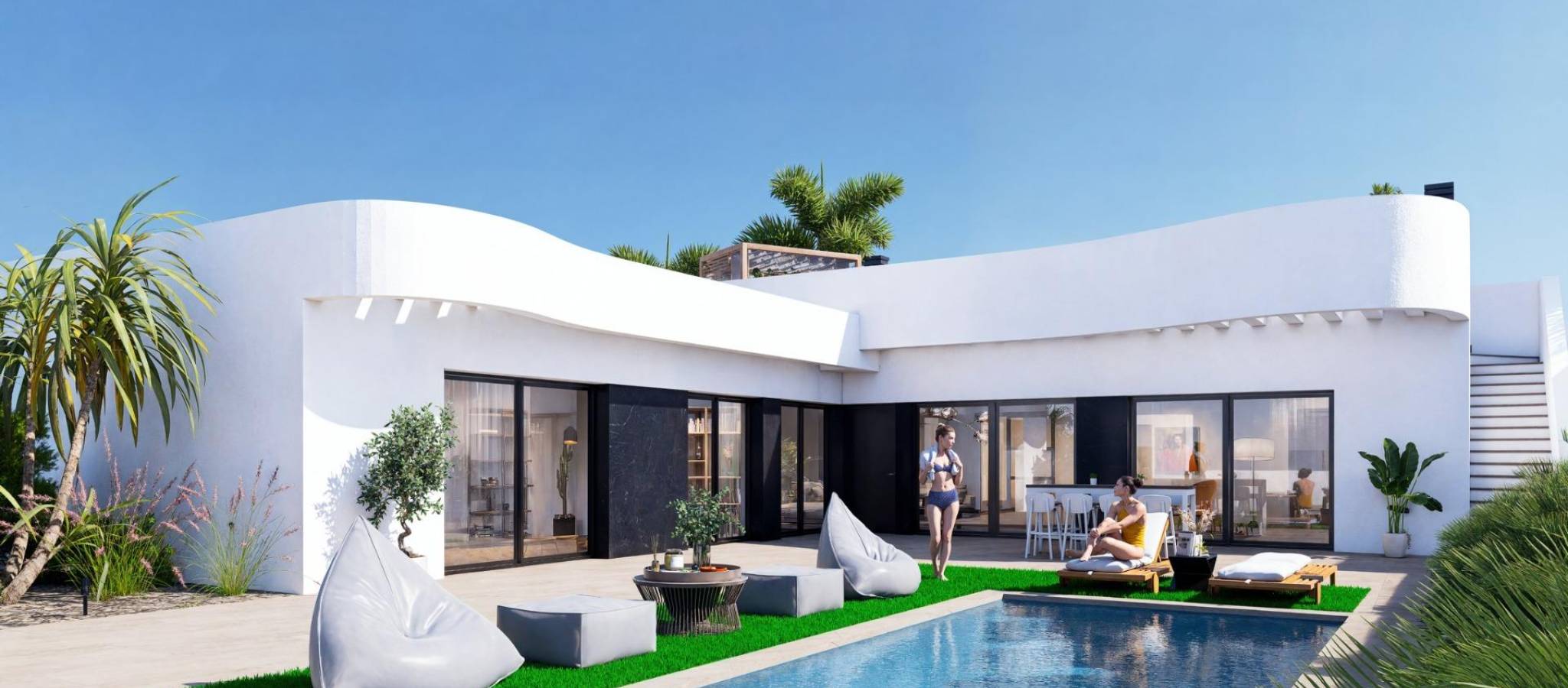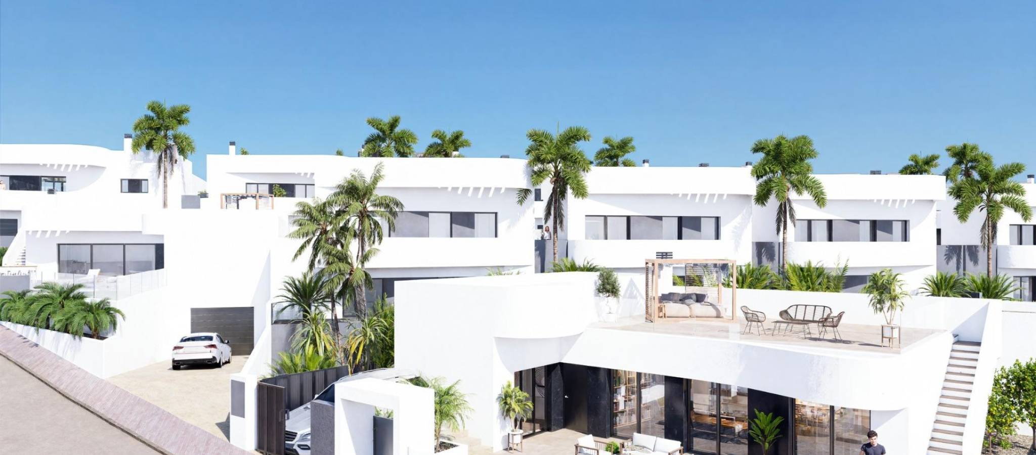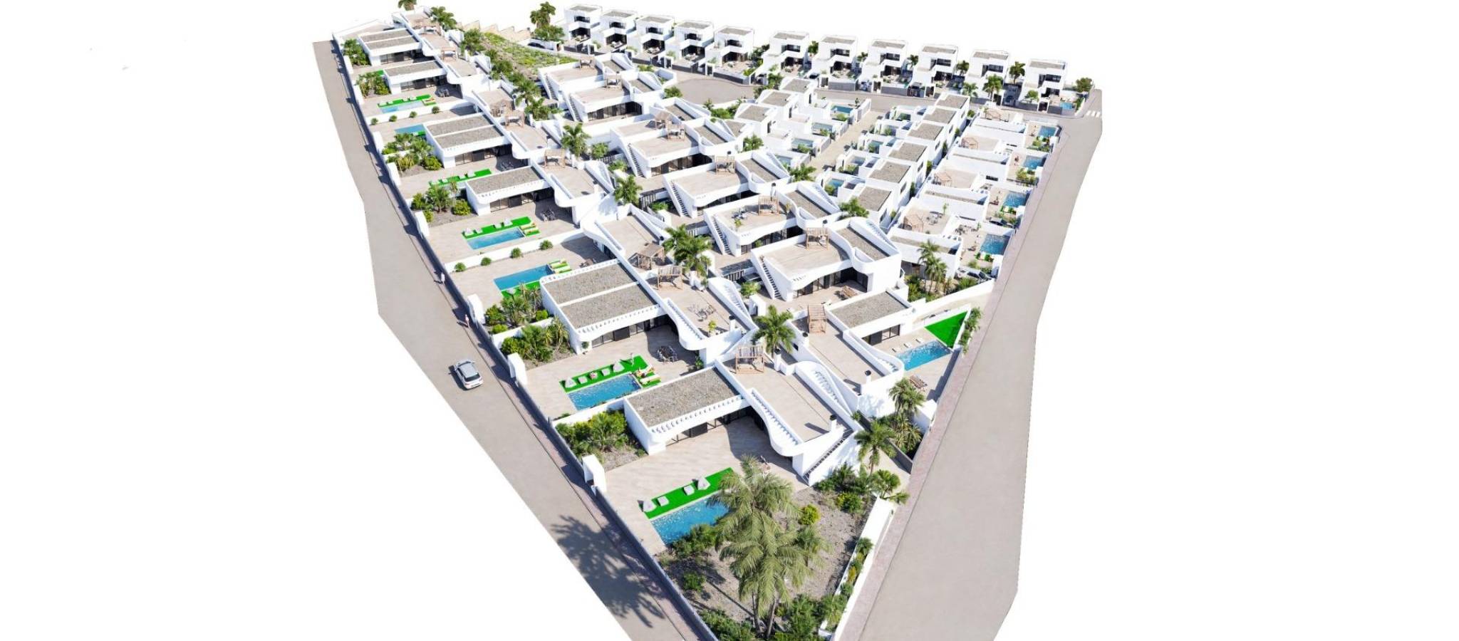 Nybyggede villaer i La Finca Golf Resort Algorfa Eksklusivt nybygg i et prestisjefylt golfmiljø Dette nye boligprosjektet med 53 moderne villaer ligger i det kjente La Finca Golf Resort i Algorfa, et av de mest ettertraktede områdene på Costa Blanca Sør. Omgitt av frodige grønne landskap, sitruslunder og golfbanens bølgende fairways, tilbyr dette stedet ro, privatliv og en middelhavsstil av høy kvalitet, samtidig som det ligger nær viktige tjenester og kysten. Valg av villamodeller og planløsninger Prosjektet tilbyr et bredt utvalg av frittliggende og tomannsboliger i tre forskjellige størrelser på omtrent 98 m2, 111 m2 eller 135 m2. Boligene er tilgjengelige i én eller to etasjer, og alle har tre soverom og to bad. De større modellene har også et gjestetoalett. Villaene i én etasje har et romslig privat solarium på taket, mens boligene i to etasjer har en stor åpen terrasse i øverste etasje. Noen enheter har kjeller, og andre tilbyr dette som et tilleggsvalg mot ekstra kostnad. Alle villaene har privat svømmebasseng og parkeringsplass på tomten. Ibiza-stil og utendørs liv Villaene skiller seg ut med sin elegante Ibiza-stil med myke, buede linjer og lyse, hvite overflater som passer perfekt inn i de naturlige omgivelsene. De romslige uteområdene er designet for å nyte det milde klimaet hele året, og tilbyr ideelle rom for avslapning, underholdning og for å få mest mulig ut av utendørslivet i et fredelig golfmiljø. Høy kvalitet og komfort Alle boligene er bygget etter høye standarder og har forsterket sikkerhetsdør, fullt utstyrt kjøkken, forhåndsinstallert sentralvarme og et aerotermisk system for varmt vann. Disse funksjonene sikrer komfort, energieffektivitet og moderne livsstil, enten det er som permanent bolig eller feriehus. La Finca Golf Resort og Algorfa Lifestyle La Finca Golf Resort er kjent for sin mesterskapsgolfbane, luksushotell, spa-fasiliteter, restauranter og sportsområder, alt i et trygt og velholdt miljø. Algorfa er en sjarmerende spansk by med lokale butikker, tradisjonelle restauranter og en avslappet atmosfære, mens nærliggende byer tilbyr et bredere utvalg av tjenester og fasiliteter. Viktige avstander og forbindelser La Finca golfbane ligger innenfor resortet. Guardamar del Segura-strendene ligger omtrent 14 km unna. Kjøpesentre i Torrevieja og Orihuela Costa ligger rundt 15 km unna. Almoradi, Benijofar og Ciudad Quesada ligger mellom 5 og 10 km unna. Alicante internasjonale lufthavn ligger omtrent 35 km unna. En smart investering på Costa Blanca Med over 300 soldager i året, utmerkede veiforbindelser og nærhet til golf, strender og shoppingområder, er disse villaene ideelle for å bo, feriere eller investere i. Kontakt oss i dag Sikre deg din nye villa i La Finca Golf Resort i dag. Kontakt oss nå for mer informasjon eller for å avtale en privat visning.