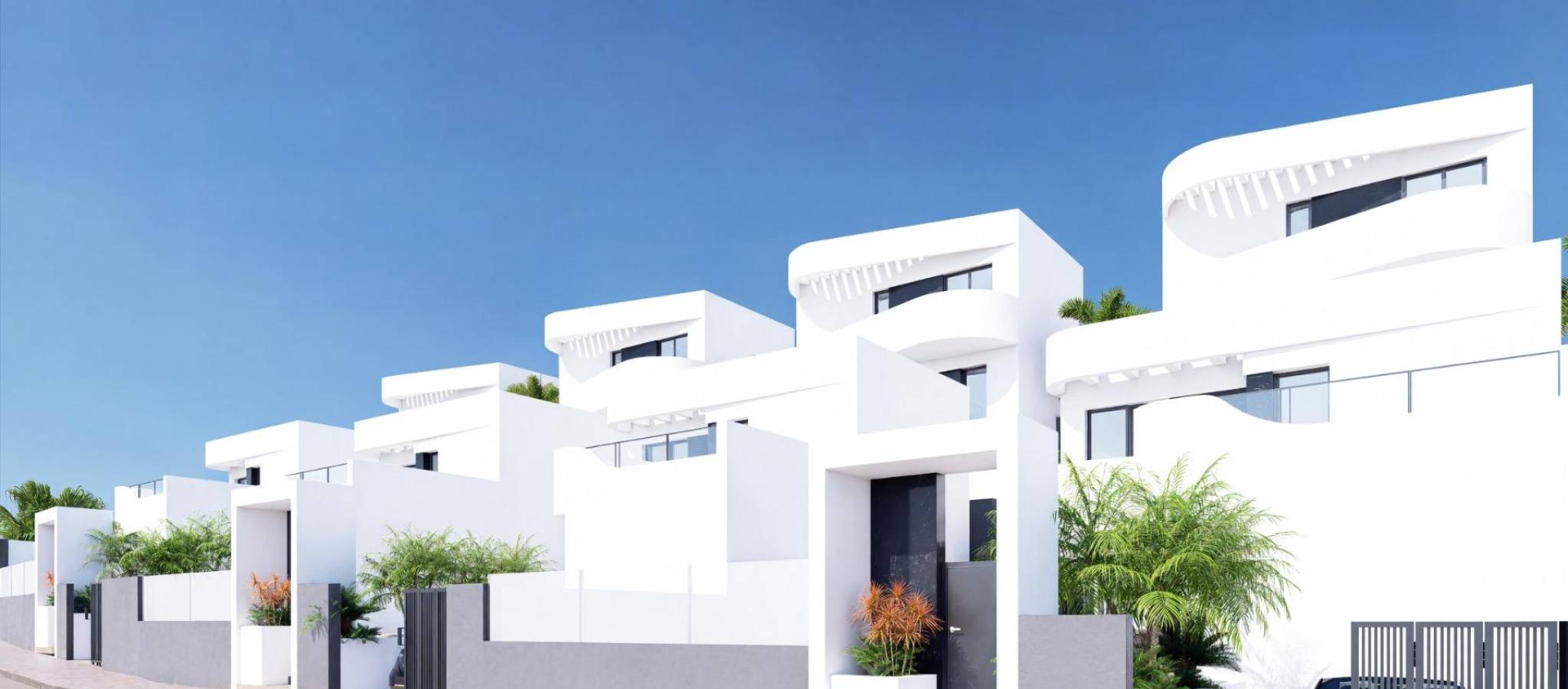 Nybyggede villaer i La Finca Golf Resort Algorfa Eksklusivt nybygg i et prestisjefylt golfmiljø Dette nye boligprosjektet med 53 moderne villaer ligger i det kjente La Finca Golf Resort i Algorfa, et av de mest ettertraktede områdene på Costa Blanca Sør. Omgitt av frodige grønne landskap, sitruslunder og golfbanens bølgende fairways, tilbyr dette stedet ro, privatliv og en middelhavsstil av høy kvalitet, samtidig som det ligger nær viktige tjenester og kysten. Valg av villamodeller og planløsninger Prosjektet tilbyr et bredt utvalg av frittliggende og tomannsboliger i tre forskjellige størrelser på omtrent 98 m2, 111 m2 eller 135 m2. Boligene er tilgjengelige i én eller to etasjer, og alle har tre soverom og to bad. De større modellene har også et gjestetoalett. Villaene i én etasje har et romslig privat solarium på taket, mens boligene i to etasjer har en stor åpen terrasse i øverste etasje. Noen enheter har kjeller, og andre tilbyr dette som et tilleggsvalg mot ekstra kostnad. Alle villaene har privat svømmebasseng og parkeringsplass på tomten. Ibiza-stil og utendørs liv Villaene skiller seg ut med sin elegante Ibiza-stil med myke, buede linjer og lyse, hvite overflater som passer perfekt inn i de naturlige omgivelsene. De romslige uteområdene er designet for å nyte det milde klimaet hele året, og tilbyr ideelle rom for avslapning, underholdning og for å få mest mulig ut av utendørslivet i et fredelig golfmiljø. Høy kvalitet og komfort Alle boligene er bygget etter høye standarder og har forsterket sikkerhetsdør, fullt utstyrt kjøkken, forhåndsinstallert sentralvarme og et aerotermisk system for varmt vann. Disse funksjonene sikrer komfort, energieffektivitet og moderne livsstil, enten det er som permanent bolig eller feriehus. La Finca Golf Resort og Algorfa Lifestyle La Finca Golf Resort er kjent for sin mesterskapsgolfbane, luksushotell, spa-fasiliteter, restauranter og sportsområder, alt i et trygt og velholdt miljø. Algorfa er en sjarmerende spansk by med lokale butikker, tradisjonelle restauranter og en avslappet atmosfære, mens nærliggende byer tilbyr et bredere utvalg av tjenester og fasiliteter. Viktige avstander og forbindelser La Finca golfbane ligger innenfor resortet. Guardamar del Segura-strendene ligger omtrent 14 km unna. Kjøpesentre i Torrevieja og Orihuela Costa ligger rundt 15 km unna. Almoradi, Benijofar og Ciudad Quesada ligger mellom 5 og 10 km unna. Alicante internasjonale lufthavn ligger omtrent 35 km unna. En smart investering på Costa Blanca Med over 300 soldager i året, utmerkede veiforbindelser og nærhet til golf, strender og shoppingområder, er disse villaene ideelle for å bo, feriere eller investere i. Kontakt oss i dag Sikre deg din nye villa i La Finca Golf Resort i dag. Kontakt oss nå for mer informasjon eller for å avtale en privat visning.