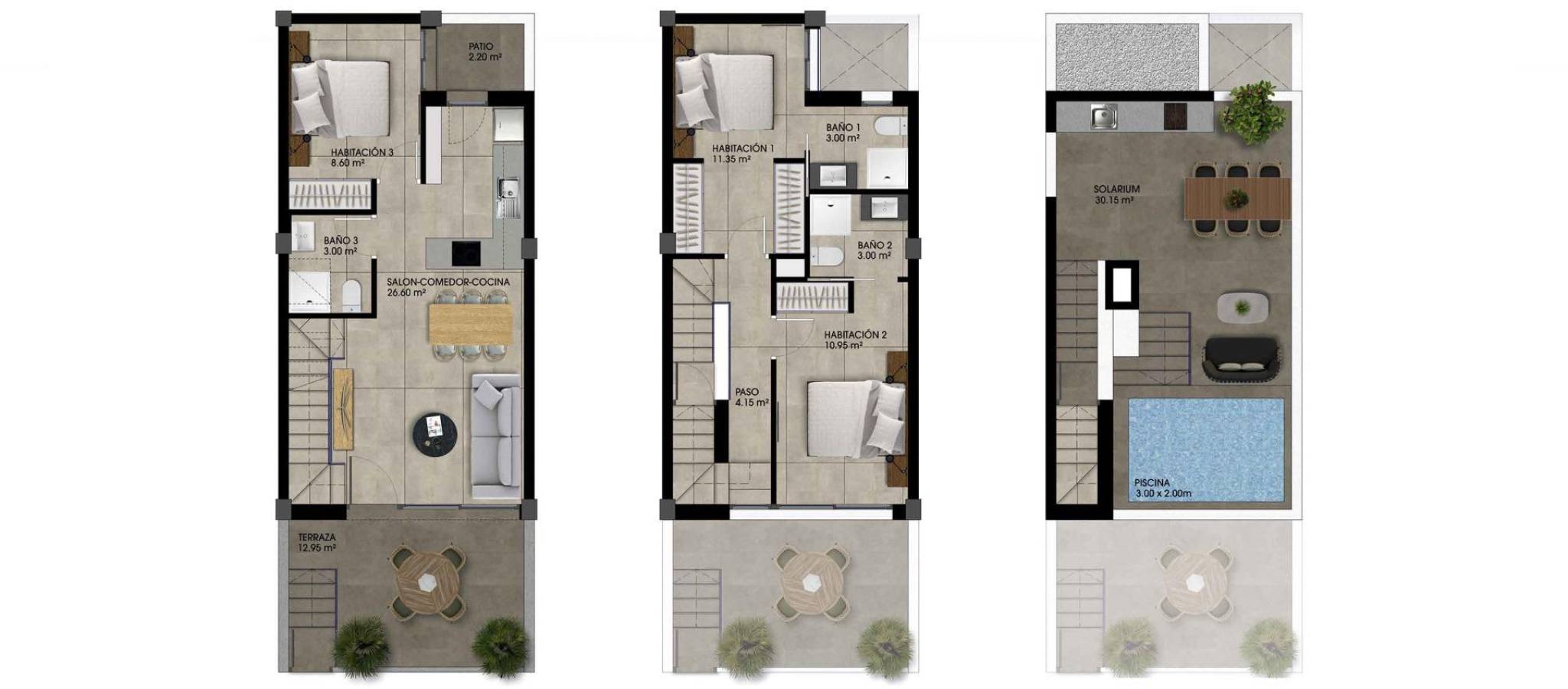 Moderne rekkehus i Dolores med felles svømmebasseng Moderne hjem designet for komfort og stil Oppdag dette eksklusive boligkomplekset med 20 moderne rekkehus i Dolores, som tilbyr en perfekt blanding av plass, stil og høy kvalitet. Med opptil 133 m² boareal, inkludert store terrasser, er disse boligene tilgjengelige med to eller tre soverom, slik at du kan velge den designen som passer best til din livsstil. Hver bolig strekker seg over tre etasjer, inkludert et privat solarium med fantastisk utsikt og en ideell plass for avslapning. Interiøret har integrert LED-belysning, moderne finish og en åpen planløsning som gir et fantastisk naturlig lys. Premiumfunksjoner og valgfrie oppgraderinger Romslig og lyst interiør med finish av høy kvalitet Tre etasjer, inkludert takterrasse Felles svømmebasseng, perfekt for avslapning Valgfritt privat boblebad eller basseng på taket (mot ekstra kostnad) Privat parkeringsplass for hvert hjem Moderne kjøkken og bad designet for funksjonalitet og eleganse Førsteklasses beliggenhet - rolige omgivelser med gode forbindelser Dette prosjektet ligger i Dolores, en sjarmerende by i Vega Baja-regionen i Alicante, og tilbyr den perfekte balansen mellom et fredelig liv og enkel tilgang til viktige tjenester. Området er kjent for sine vakre naturomgivelser, jordbrukslandskap og avslappede atmosfære. Avstander til viktige severdigheter: Strendene i La Marina og Guardamar del Segura - 10 km (10 minutter) Alicante lufthavn - 30 km (25 minutter) Murcia-Corvera lufthavn - 60 km (45 minutter) Golfbaner - 10 km (10 minutter) Kjøpesentre (La Zenia Boulevard, Habaneras) - 12 km (15 minutter) Et perfekt hjem på Costa Blanca Disse moderne rekkehusene i Dolores tilbyr den ideelle kombinasjonen av ro, moderne livsstil og nærhet til viktige destinasjoner. Enten du er ute etter et feriehus eller en permanent bolig, tilbyr dette prosjektet en komfortabel og stilig livsstil med en privilegert beliggenhet. Ikke gå glipp av noe! Kontakt oss i dag for mer informasjon eller for å avtale et besøk.