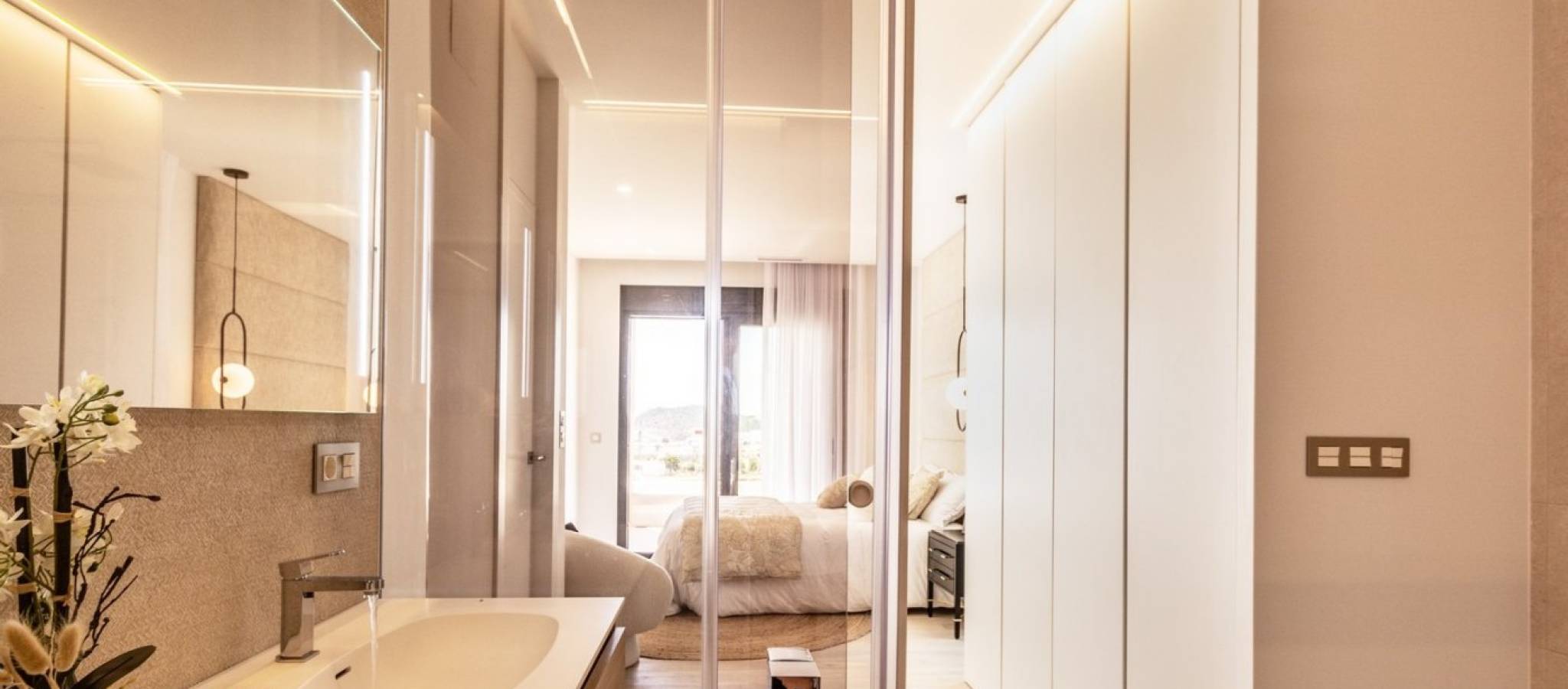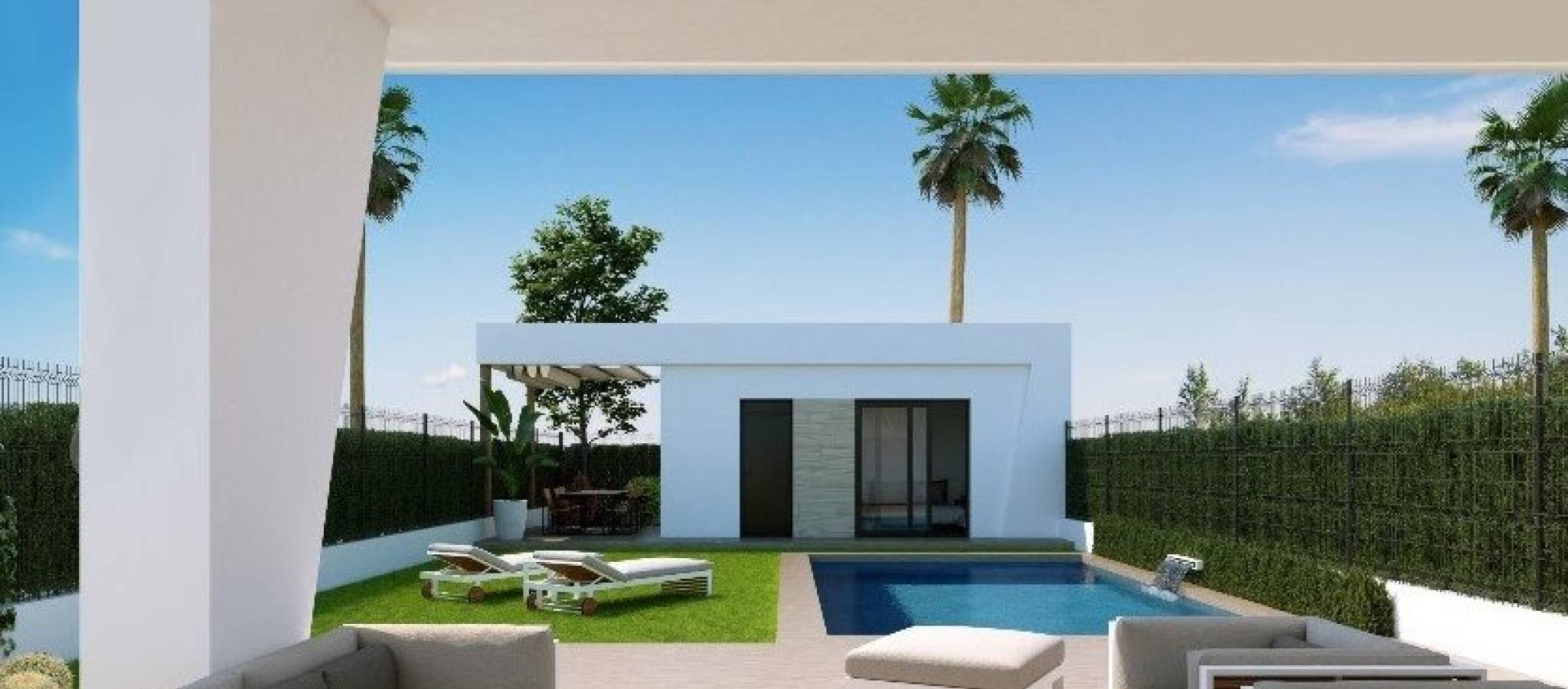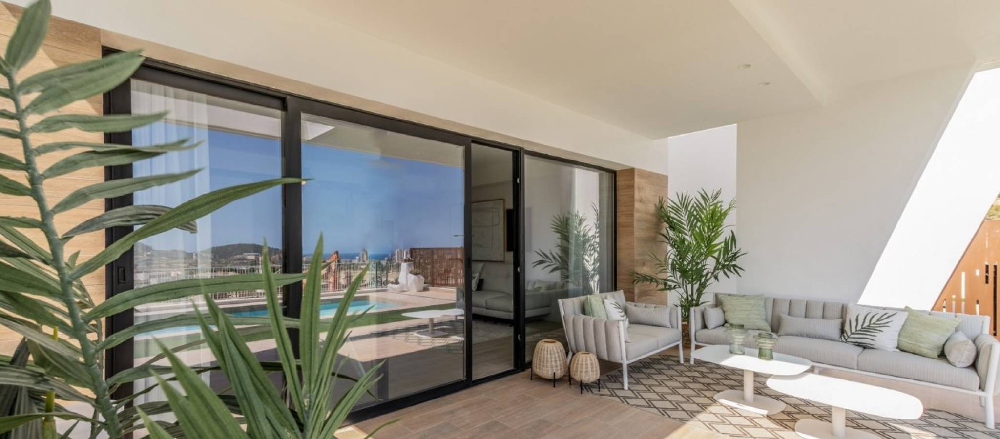 NYBYGGDE VILLAER MED PRIVAT BASSENG OG GJESTEHUS Ny Bygg et eksklusivt boligkompleks med villaer som ligger i Finestrat nær de fantastiske strendene i Benidorm. Ny modell av vakker villa med gjestehus på tomten. Det er 17 villaer av denne typen til salgs. Villaen er bygget i to etasjer. I første etasje er det en lys stue, med store vinduer og direkte tilgang til basseng og hage, soverom og bad. I første etasje er det to rom i suitestil, med utgang til en åpen terrasse. Et gjestehus er bygget på ett plan, bestående av et soverom og et bad, i tillegg til dette er det en koselig terrasse med utgang til hovedvillaen, bassenget og hagen. Bolig som ligger 5 minutter med bil fra alle tjenestene Benidorm kan tilby og i et miljø med en gjennomsnittlig årlig temperatur på 20ºC og 300 soldager i året, 44 km fra Alicante flyplass, 3 km fra sjøen og 200 meter til golf.