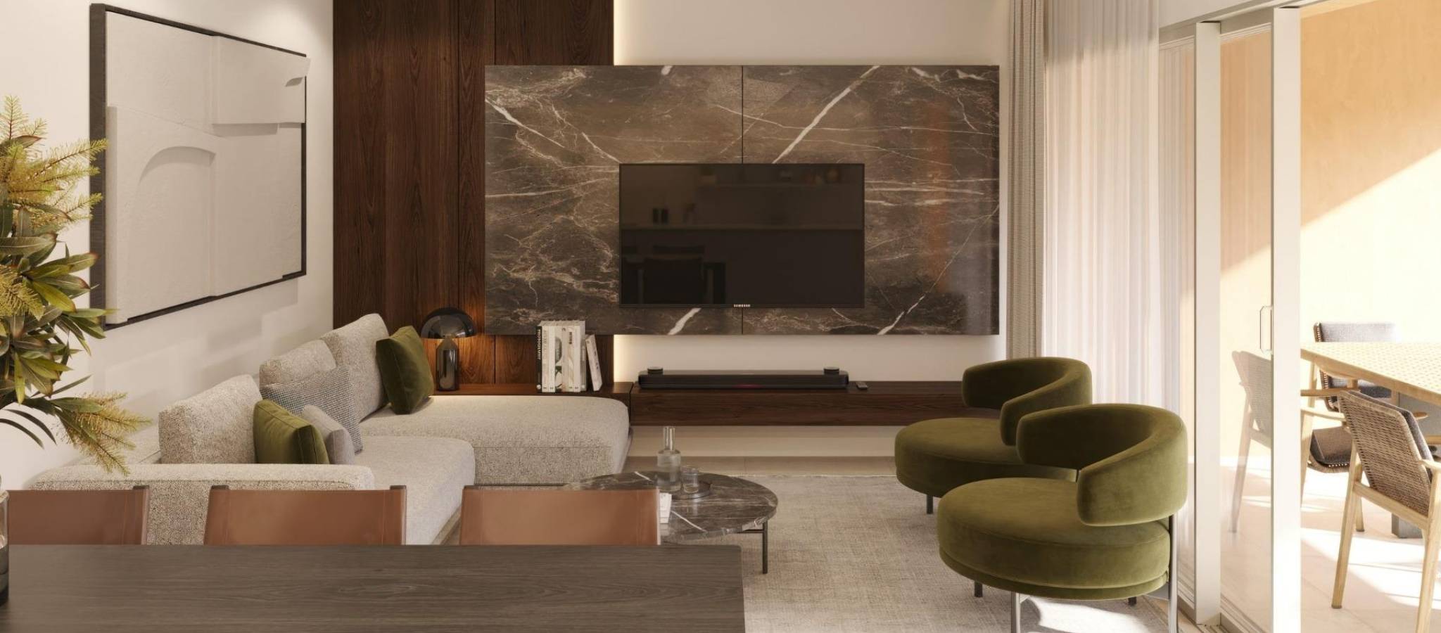 Kjøpere kan velge mellom leiligheter i første etasje med privat hage eller boliger i øvre etasje med romslig terrasse og privat solarium. Disse planløsningene er designet for å maksimere naturlig lys og gi komfortable innendørs og utendørs oppholdsrom for å nyte middelhavsklimaet hele året.
