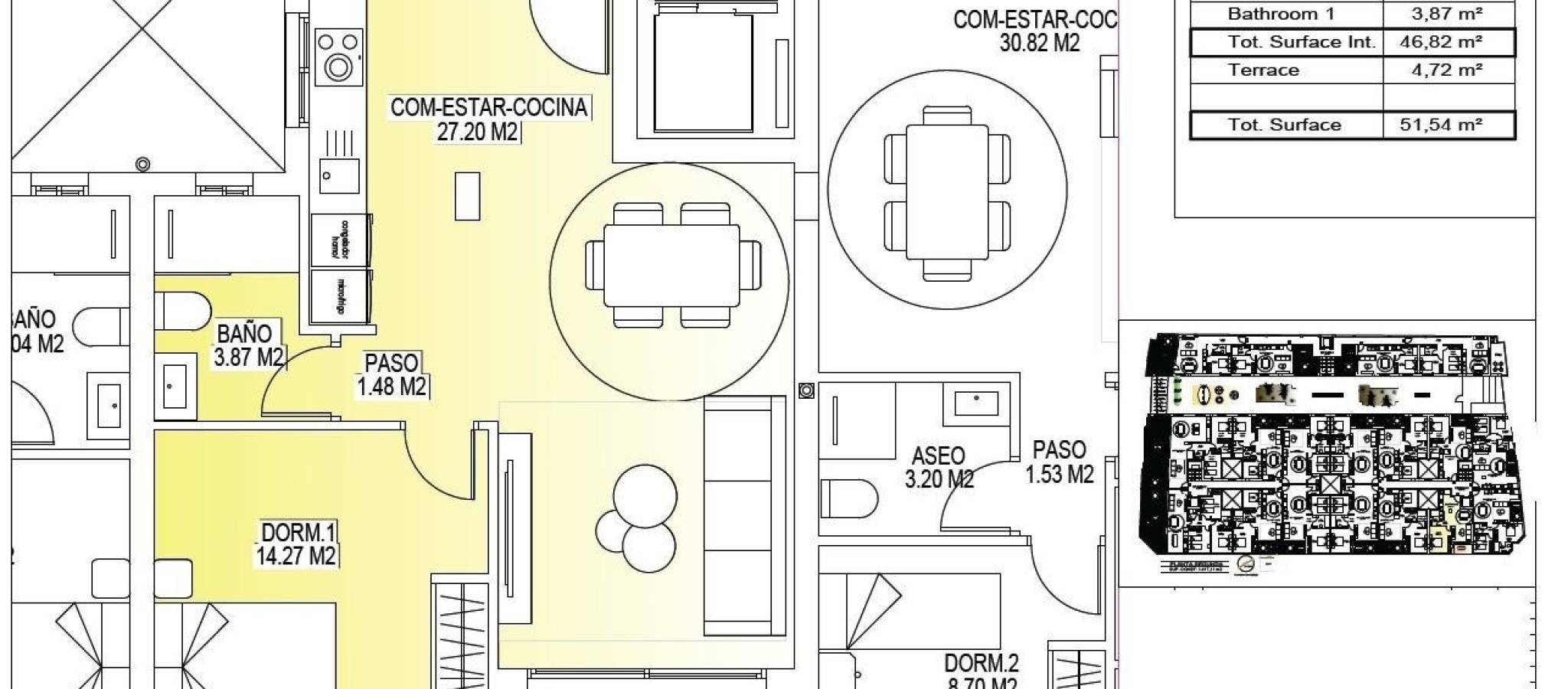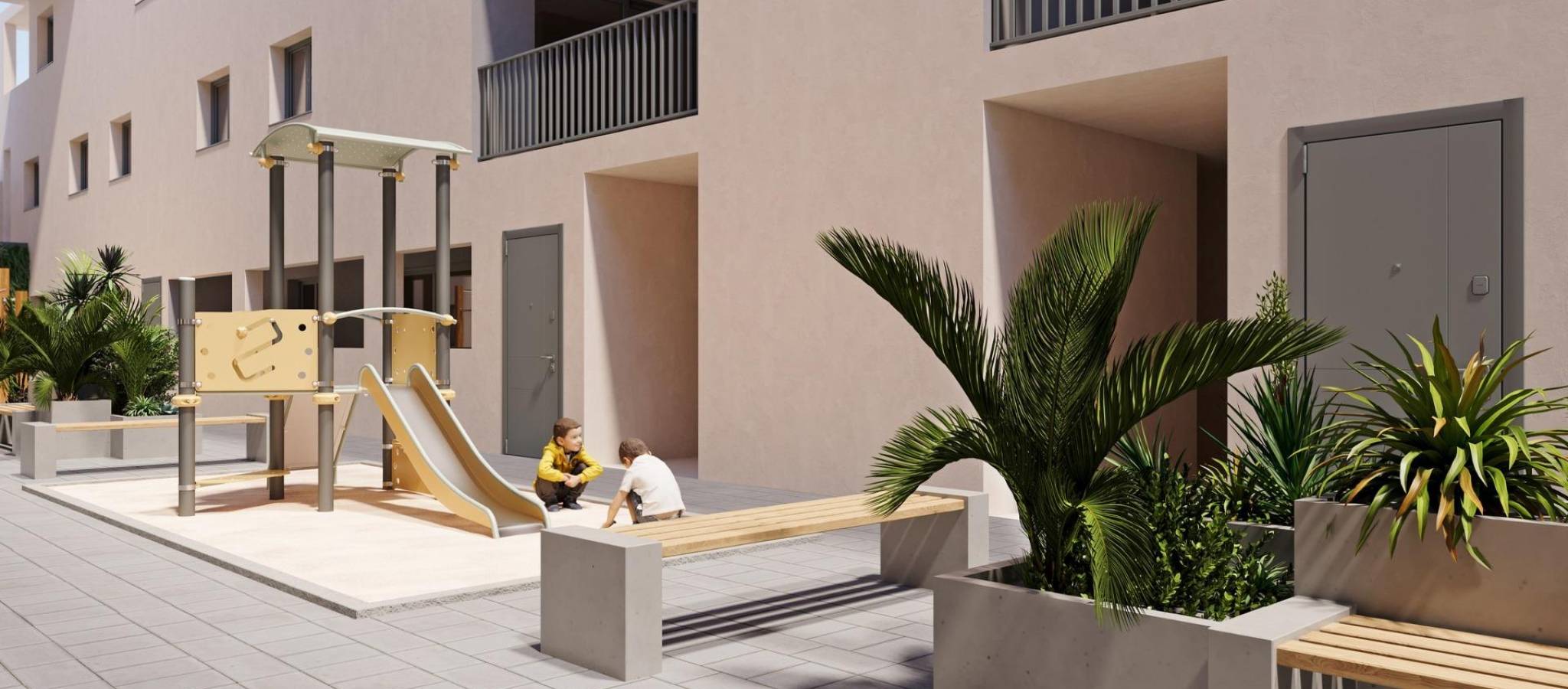 Moderne nybyggede leiligheter i sentrum av San Miguel de Salinas Moderne livsstil i et sunt middelhavsmiljø Dette nye boligprosjektet ligger i den sjarmerende byen San Miguel de Salinas, bare 10 km fra Middelhavet, og tilbyr den perfekte balansen mellom moderne komfort og naturlige omgivelser. Området er kjent for sine nærliggende saltsjøer og sitt eksepsjonelle mikroklima, som regnes som et av de sunneste i Europa. Denne fredelige, men livlige byen lar innbyggerne nyte den autentiske middelhavsstilen, samtidig som de har gangavstand til butikker, restauranter, supermarkeder og alle nødvendige tjenester. San Miguel de Salinas ligger litt inne i landet på Costa Blanca Sør, og tilbyr åpen utsikt, frisk luft og enkel tilgang til strender, golfbaner og shoppingområder. Stilfulle leiligheter designet for komfort og effektivitet Prosjektet består av to moderne bygninger adskilt av et felles hageområde. Totalt er det 56 moderne leiligheter med 1, 2 eller 3 soverom, hver med egen terrasse. Alle boligene er designet med tanke på komfort, estetikk og energieffektivitet, med bruk av materialer av høy kvalitet og moderne isolasjonssystemer. Hver leilighet har: Pansret inngangsdør Bad med servantskap Forhåndsinstallert luftkanal-klimaanlegg Energisertifikat klasse A Planløsningen og orienteringen av boligene sikrer naturlig lys hele dagen, og skaper lyse og innbydende interiører som er ideelle både for permanent boende og feriebruk. Eksepsjonelle fellesarealer for avslapning og sosialt liv Fellesarealet i første etasje er designet som det sosiale hjertet i prosjektet, omgitt av anlagte hager, sittegrupper, sykkelparkering og en lekeplass for barn. Det er et ideelt møtested for beboere i alle aldre. På taket venter et imponerende fritidsområde på 350 m2. Dette området inkluderer et 70 m2 stort svømmebasseng med et separat barnebasseng, pergolaer, solsenger og skyggefulle områder, slik at beboerne kan slappe av mens de nyter panoramautsikten. Taket er lett tilgjengelig med en av de tre heisene og inkluderer sanitæranlegg for ekstra komfort. Utmerket beliggenhet nær viktige severdigheter Middelhavsstrender 10 km Zenia Boulevard kjøpesenter 9 km Villamartin Golf 6 km Las Colinas Golf 8 km Torrevieja Marina 12 km Alicante lufthavn 60 km Murcia Corvera lufthavn 55 km En smart investering i Costa Blanca Sør Dette boligkomplekset kombinerer moderne arkitektur, kvalitetsfinish og en førsteklasses sentral beliggenhet, noe som gjør det til et utmerket valg for å bo, nyte ferien eller investere i utleie. Kontakt oss i dag for mer informasjon eller for å avtale en visning av disse moderne leilighetene i San Miguel de Salinas.