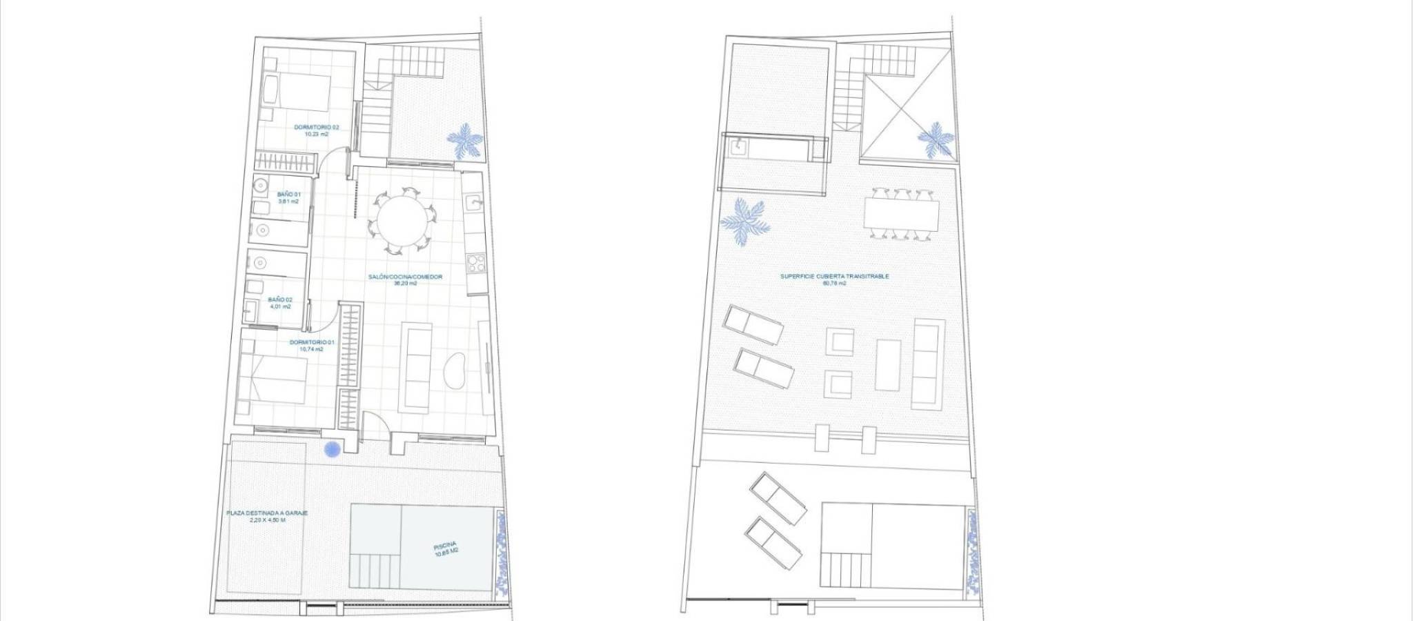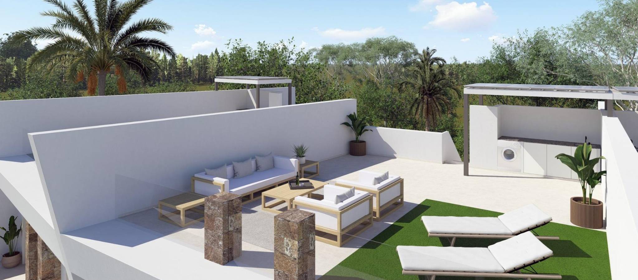 Moderne nybyggede rekkehus med privat basseng i El Alba Resort Torre Pacheco Moderne boliger i et voksende middelhavsresort Dette nybyggprosjektet består av kun 4 eksklusive rekkehus i første fase, og ligger i El Alba Mediterranean Resort i Torre Pacheco. Disse moderne boligene er designet i ett plan og tilbyr en perfekt kombinasjon av komfort, funksjonalitet og middelhavsinspirert utendørsliv. El Alba Resort er et voksende boligområde omgitt av åpne landskap og golfbaner, like ved byen Roldan, hvor du finner supermarkeder, restauranter, banker og daglige tjenester. Feriestedet har allerede en sosial klubb med svømmebasseng og restaurant, og et handelsområde er under utvikling, noe som gir området ytterligere bekvemmelighet og verdi. Enetasjes bolig med privat hage og solarium Hver bolig har 2 soverom og 2 bad, hvorav det ene er en-suite, med et åpent kjøkken som er koblet til en lys stue. Planløsningen er nøye utformet for å maksimere naturlig lys og skape en sømløs forbindelse mellom innendørs og utendørs områder. Alle boliger inkluderer: Fullt utstyrt kjøkken med hvitevarer Bad med møbler, speil, belysning og dusjvegger Innebygde garderober med skuffer i soverommene Forhåndsinstallert sentral klimaanlegg LED-belysning innvendig og utvendig Tre solcellepaneler med 1,5 kW kapasitet per bolig Uteområdene er designet for å kunne nytes hele året, med en privat hage med svømmebasseng, en terrasse og et stort privat solarium med sommerkjøkken, ideelt for utendørs servering og avslapning i solen. Kvalitetsfunksjoner designet for komfort og effektivitet Disse boligene er bygget med elegant og funksjonelt interiør, med fokus på energieffektivitet og moderne livsstil. En privat parkeringsplass ligger på tomten, noe som sikrer bekvemmelighet og sikkerhet. Kombinasjonen av solcellepaneler, kvalitetsisolasjon og smart design gir et energieffektivt hjem som er ideelt for permanent boende, feriebruk eller utleieinvestering. Utmerket beliggenhet nær golfbaner, strender og flyplasser Roldan sentrum 2 km Mar Menor-strendene 15 km Middelhavsstrendene 20 km La Torre Golf Resort 5 km Terrazas de la Torre Golf 6 km Murcia Corvera flyplass 18 km Cartagena by 30 km Denne strategiske beliggenheten gir enkel tilgang til golf, strender, tjenester og transportforbindelser, samtidig som du kan nyte et fredelig boligmiljø. En smart investering i Costa Calida Disse rekkehusene i El Alba Mediterranean Resort tilbyr en utmerket mulighet til å eie en moderne eiendom med privat basseng i et raskt voksende område i Torre Pacheco. Kontakt oss i dag for å få mer informasjon eller for å avtale en visning av disse eksklusive nybyggene.