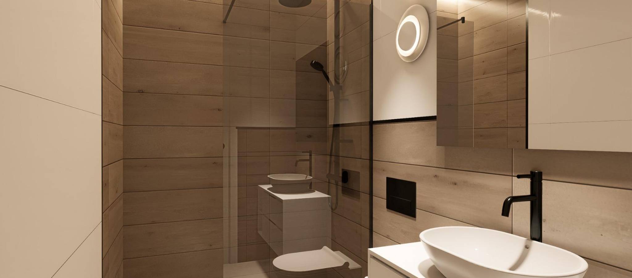 Fullt utstyrte bad med møbler og dusjvegger
