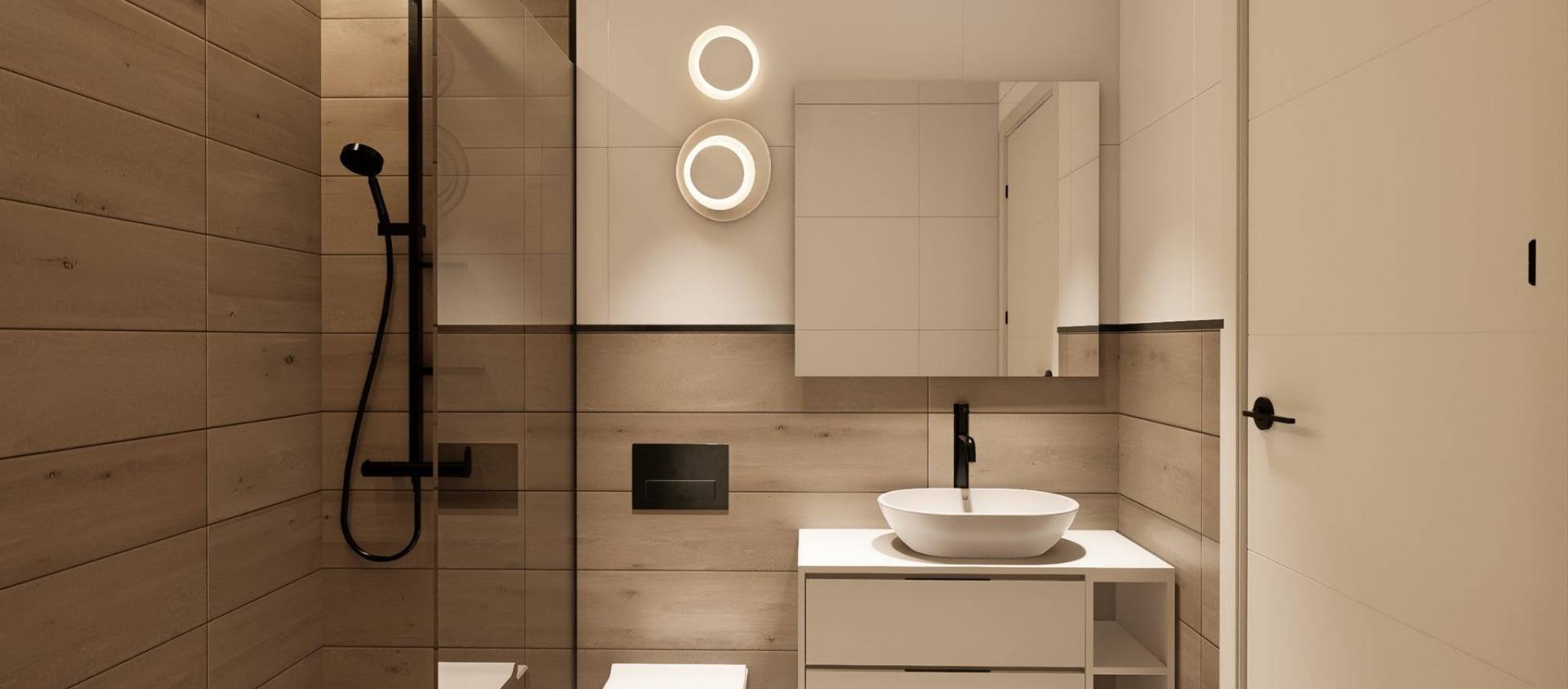 Fullt utstyrte bad med møbler og dusjvegger