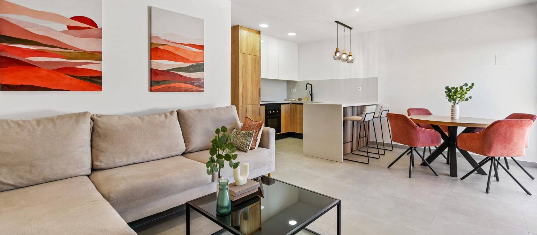Nybyggede turistleiligheter i Santiago de la Ribera, San Javier – bare 750 meter fra stranden Eksklusivt boligprosjekt på Costa Cálida Dette eksklusive boligkomplekset med 125 turistleiligheter ligger i Santiago de la Ribera (San Javier), en sjarmerende kystby på Costa Cálida, kjent for sine vakre sandstrender, avslappede middelhavsstil og utmerkede klima året rundt. Med Mar Menor bare 750 meter unna, tilbyr disse boligene den perfekte kombinasjonen av komfort, stil og nærhet til sjøen. Moderne leiligheter med flere alternativer Utbyggingen tilbyr romslige leiligheter med 3 soverom og 2 bad, inkludert et hovedsoverom med eget bad. Kjøpere kan velge mellom: Leiligheter i første etasje med privat hage Leiligheter i mellomste etasje med store terrasser Penthouseleiligheter med privat solarium Hver bolig er designet for å maksimere naturlig lys og utendørs liv. Funksjonene inkluderer fullt utstyrt og møblert kjøkken med hvitevarer, innvendig og utvendig belysning, bad med møbler og dusjvegger. Hver bolig har en parkeringsplass på overflaten, mens underjordisk parkering og bod er tilgjengelig mot en ekstra kostnad. Førsteklasses fasiliteter og tjenester Eierne vil kunne nyte godt av en moderne bygning utstyrt med heiser, to felles svømmebassenger og vakre hager. Boligene har forhåndsinstallert kanalisert klimaanlegg for komfort hele året. En smart investeringsmulighet Disse leilighetene har allerede fått turistlisens, noe som gjør dem til en utmerket investering for ferieutleie. Eierne kan generere inntekter gjennom korttidsutleie, samtidig som de kan nyte eiendommen til egne familieferier. Vær oppmerksom på at disse boligene er ment for feriebruk og ikke kan brukes som permanente boliger. Førsteklasses beliggenhet i San Javier Utbyggingen er strategisk plassert i nærheten av alle viktige tjenester og fritidsaktiviteter. Avstander til viktige severdigheter: Mar Menor-stranden: 750 m La Ribera kjøpesenter: 2 km Dos Mares kjøpesenter: 3 km Roda Golf: 5 km Lo Pagán marina: 4 km Murcia lufthavn (Corvera): 40 km Cartagena: 30 km Murcia by: 40 km Gjør din drøm om å bo ved kysten til virkelighet Dette nybyggprosjektet i Santiago de la Ribera representerer en unik mulighet til å nyte middelhavslivet samtidig som du gjør en smart investering i utleie. Kontakt oss i dag for mer informasjon eller for å avtale en visning av disse moderne turistleilighetene, bare noen skritt fra Mar Menor.