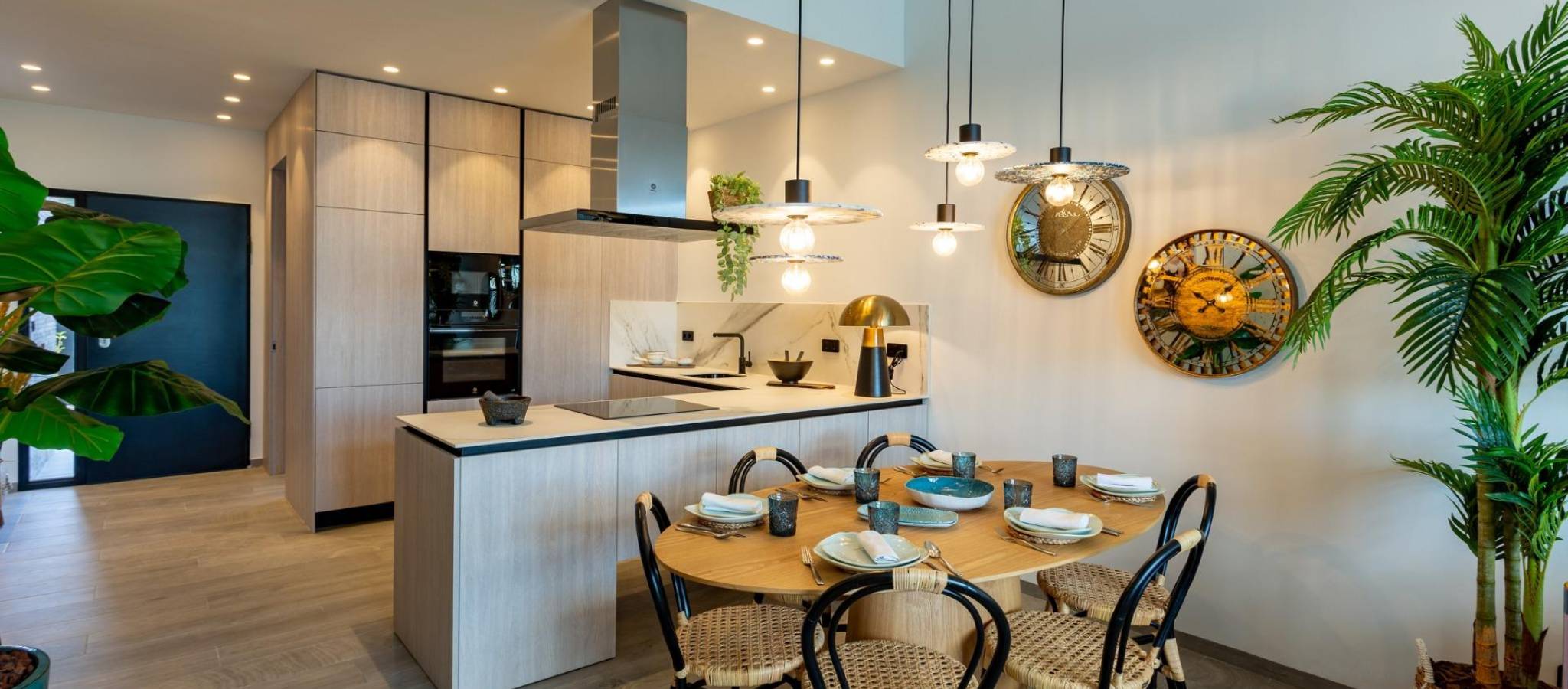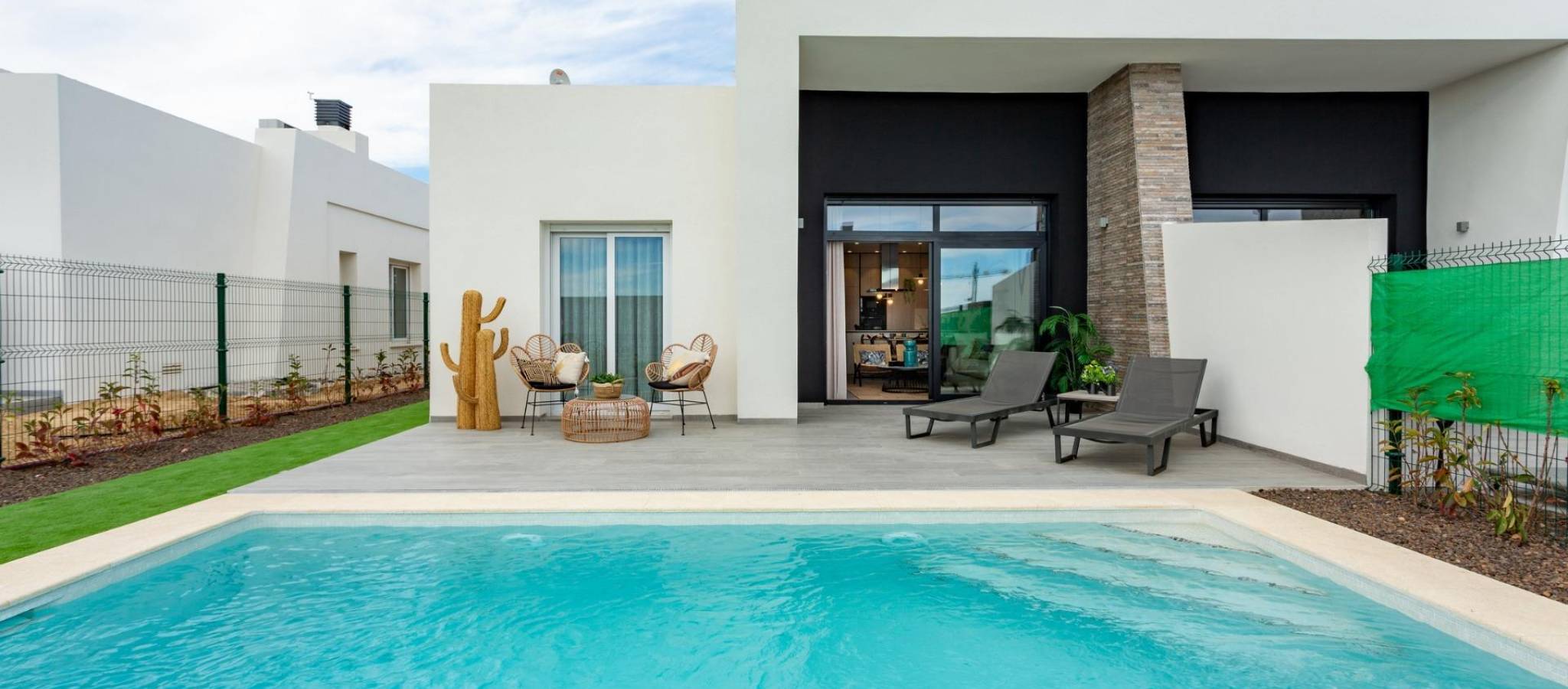 Nybyggede tomannsboliger med privat basseng på La Finca Golf Resort Algorfa Moderne villaer i et prestisjetungt golfresort på Costa Blanca Oppdag disse elegante nybygde tomannsboligene i det eksklusive La Finca Golf Resort i Algorfa, et av de mest attraktive boligområdene på Costa Blanca Sør. Omgitt av natur, golfbaner og fredelige landskap, tilbyr dette boligprosjektet den perfekte balansen mellom ro og nærhet til viktige tjenester, strender og fritidsfasiliteter. La Finca Golf Resort er kjent for sin mesterskapsgolfbane, luksushotell, restauranter og velværefasiliteter. Den nærliggende byen Algorfa har beholdt sin tradisjonelle spanske sjarm, samtidig som den tilbyr praktisk tilgang til større kystdestinasjoner som Torrevieja og de vakre strendene på den sørlige Costa Blanca. Stilige villaer i ett plan med romslige planløsninger Hver villa har et byggeareal på ca. 105 m2 på generøse tomter fra 450 m2. Boligene er designet i ett plan for å maksimere komfort og tilgjengelighet, samtidig som de tilbyr lyse og åpne oppholdsrom. Eiendommen har tre romslige soverom med innebygde garderober og to moderne bad, inkludert et hovedsoverom med eget bad. Badene er utstyrt med speil og dusjkabinetter med glassvegger for et rent og moderne design. Det åpne kjøkkenet integreres sømløst med stue og spisestue og har en praktisk frokostbar, noe som skaper et lyst og funksjonelt rom som er ideelt for både hverdagsliv og underholdning. Et separat vaskerom gir ekstra bekvemmelighet til hjemmet. En utvendig trapp fører til det store private solariet på taket, som gir ekstra uteplass til å slappe av og nyte middelhavsklimaet. Privat basseng og middelhavsstil utendørs Store skyvedører i glass forbinder stuen med utendørsterrassen og den anlagte hagen. Hver villa har et privat svømmebasseng, som skaper det perfekte miljøet for avslappende ettermiddager, utendørs servering og for å nyte det varme været på Costa Blanca. Boligene har også fullt installert klimaanlegg for å sikre komfort hele året. Førsteklasses beliggenhet nær strender, golf og fasiliteter Disse villaene har en ideell beliggenhet i gangavstand fra golfbanen og nær mange viktige destinasjoner i regionen. La Finca Golf Resort golfbane i gangavstand Guardamar del Segura strender 20 km Zenia Boulevard kjøpesenter 15 km Torrevieja 20 km Alicante Elche flyplass 40 km Region de Murcia internasjonale flyplass 55 km Området er også omgitt av flere golfbaner, naturparker og kystpromenader, og tilbyr en utmerket livsstil for både golfentusiaster og strandelskere. Sikre deg din villa på La Finca Golf Resort Disse nybygde tomannsboligene kombinerer moderne design, privat uterom og en førsteklasses beliggenhet på et golfresort. Kontakt oss i dag for å få mer informasjon eller avtale et besøk og oppdag ditt nye hjem på La Finca Golf Resort i Algorfa.