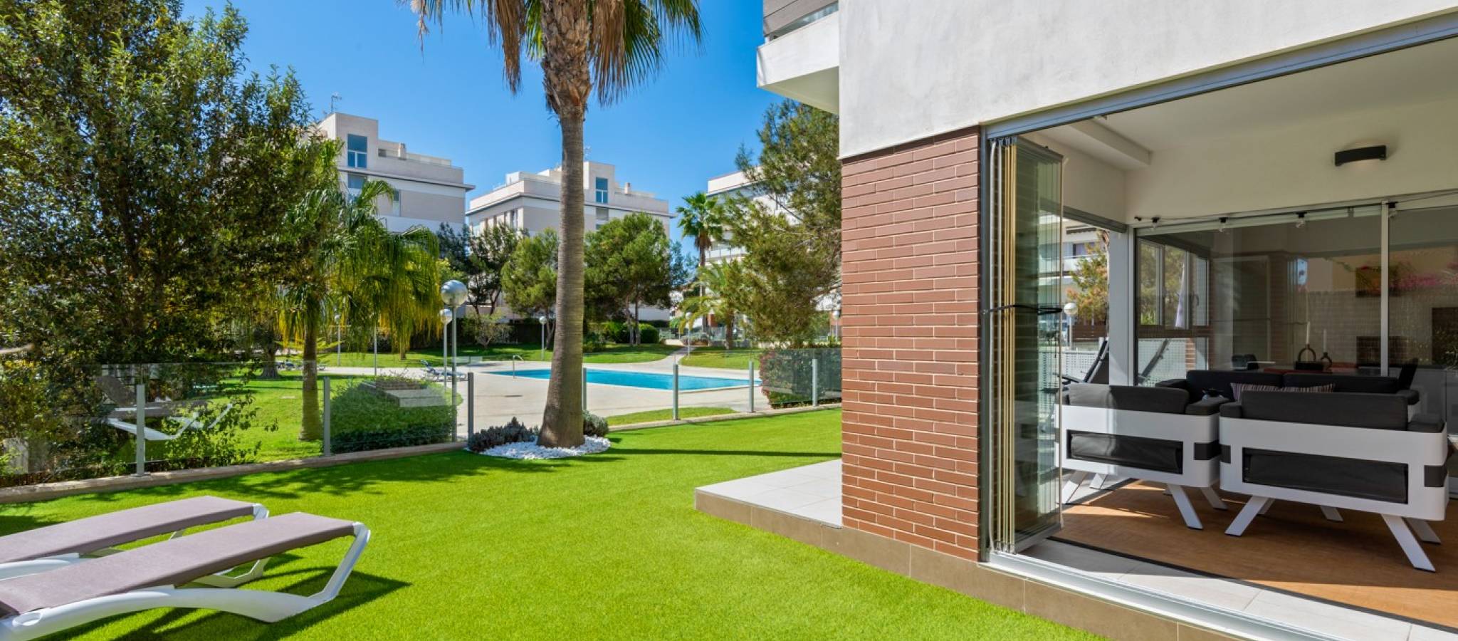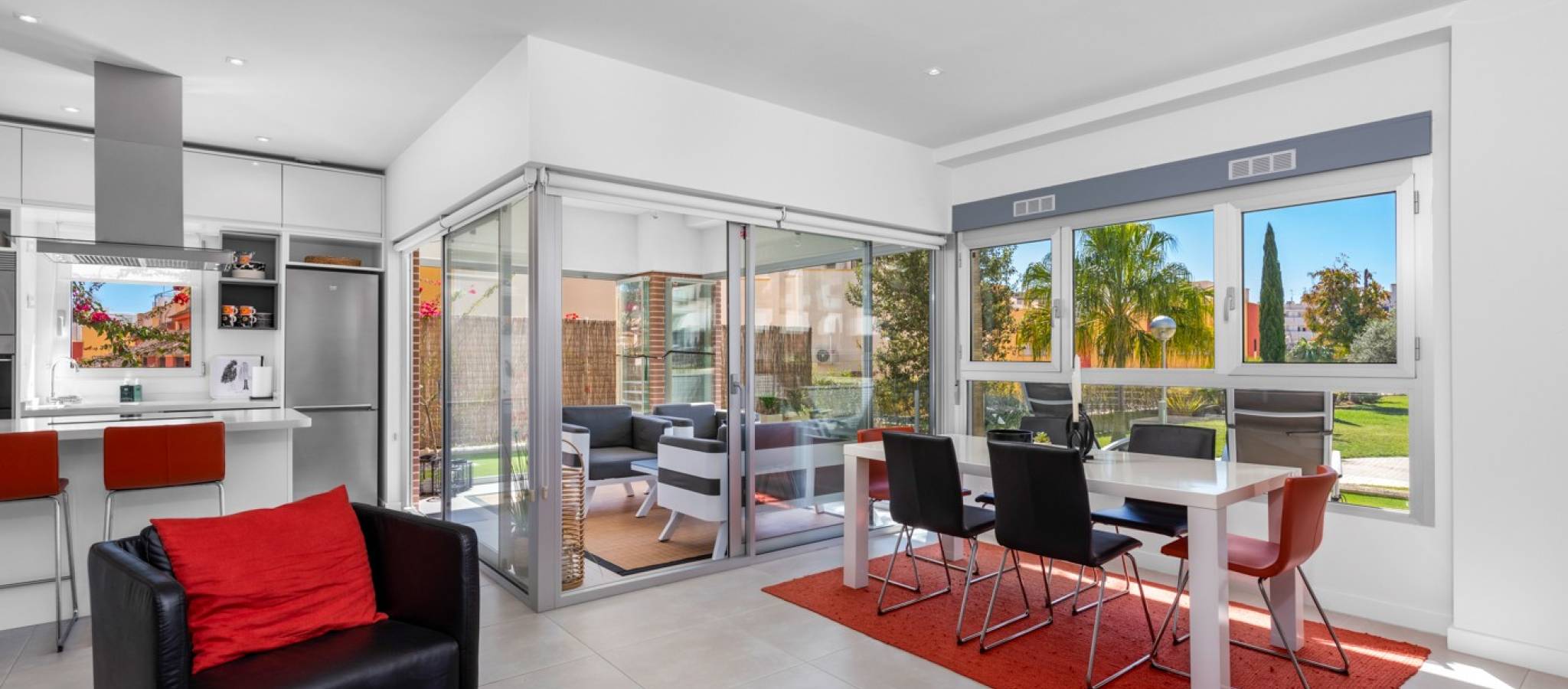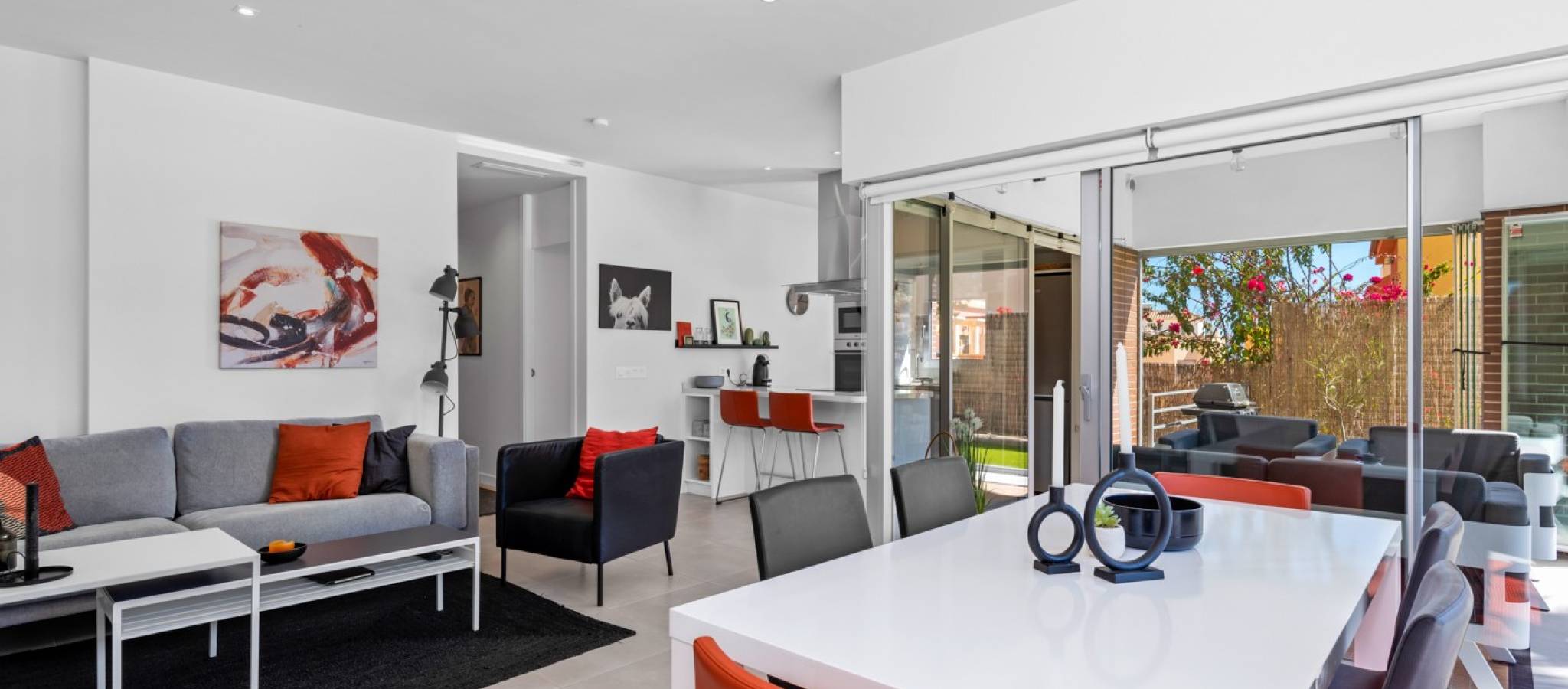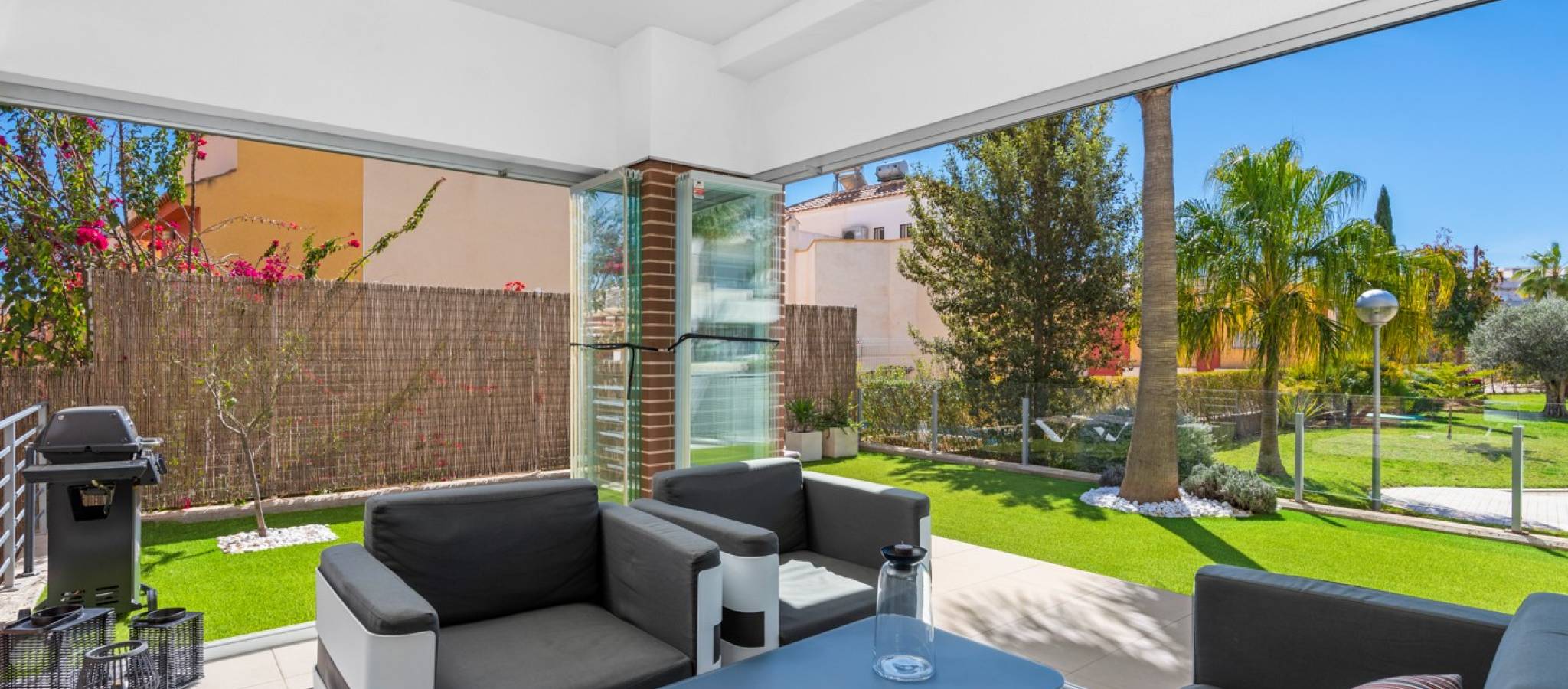 Denne praktfulle og moderne leiligheten på bakkeplan i Los Dolses, Orihuela Costa, har 3 soverom og elegant design. Den tilbyr stil og komfort med en romslig stue og spisestue med åpen kjøkkenløsning, to bad og et vaskerom. Nyt bekvemmeligheten av en overbygd terrasse med glassgardiner og en sørvendt terrasse som vender ut til et stort privat hageområde. Med direkte tilgang til bassengområdet fra hagen, samt privat parkering og en bod, tilbyr denne eiendommen både luksus og praktikalitet.