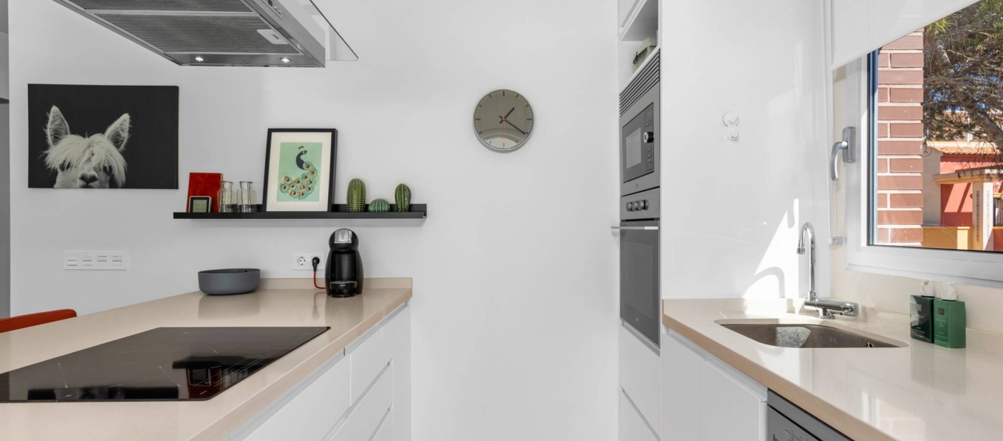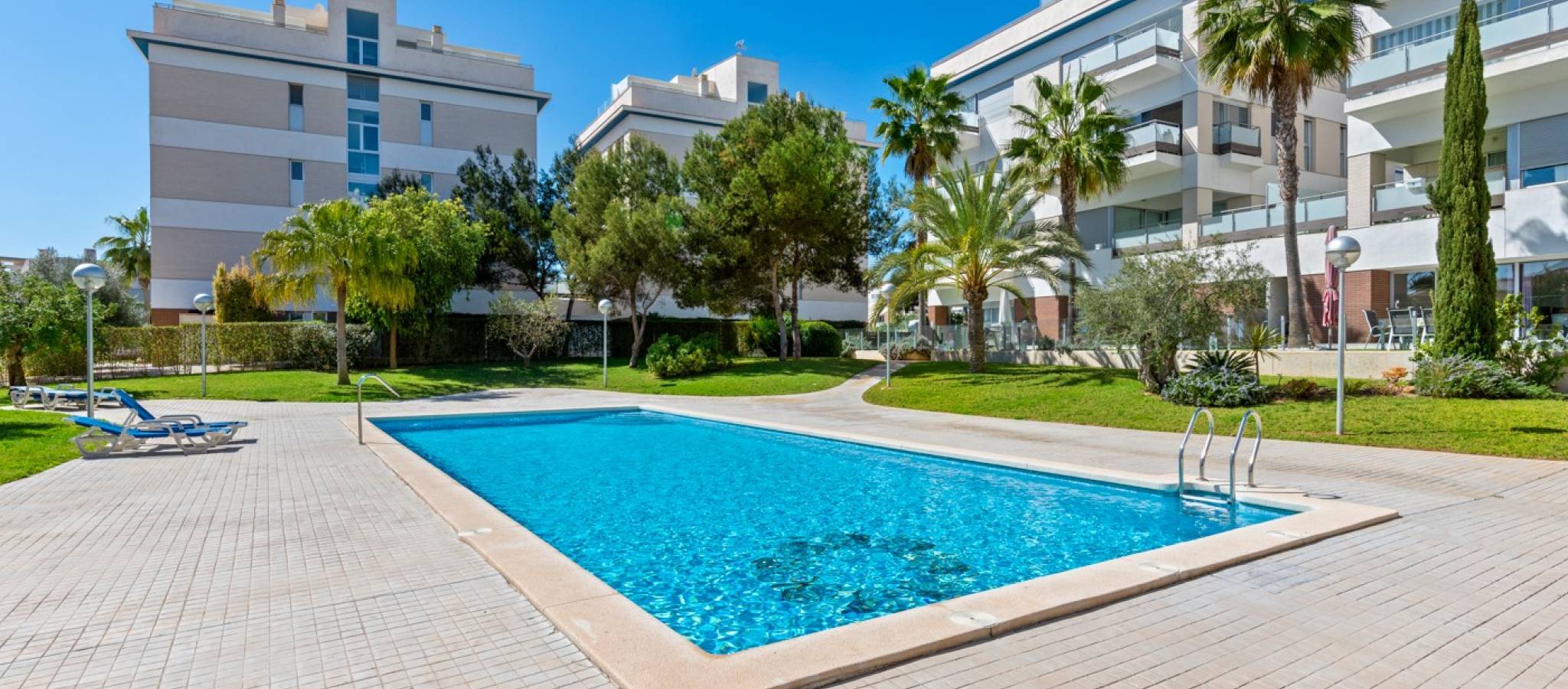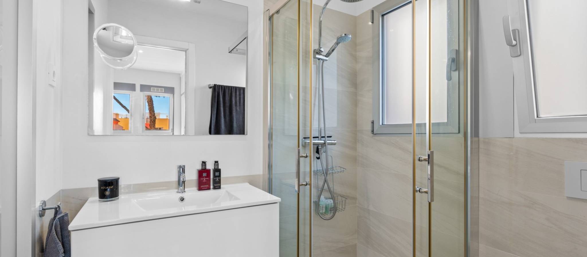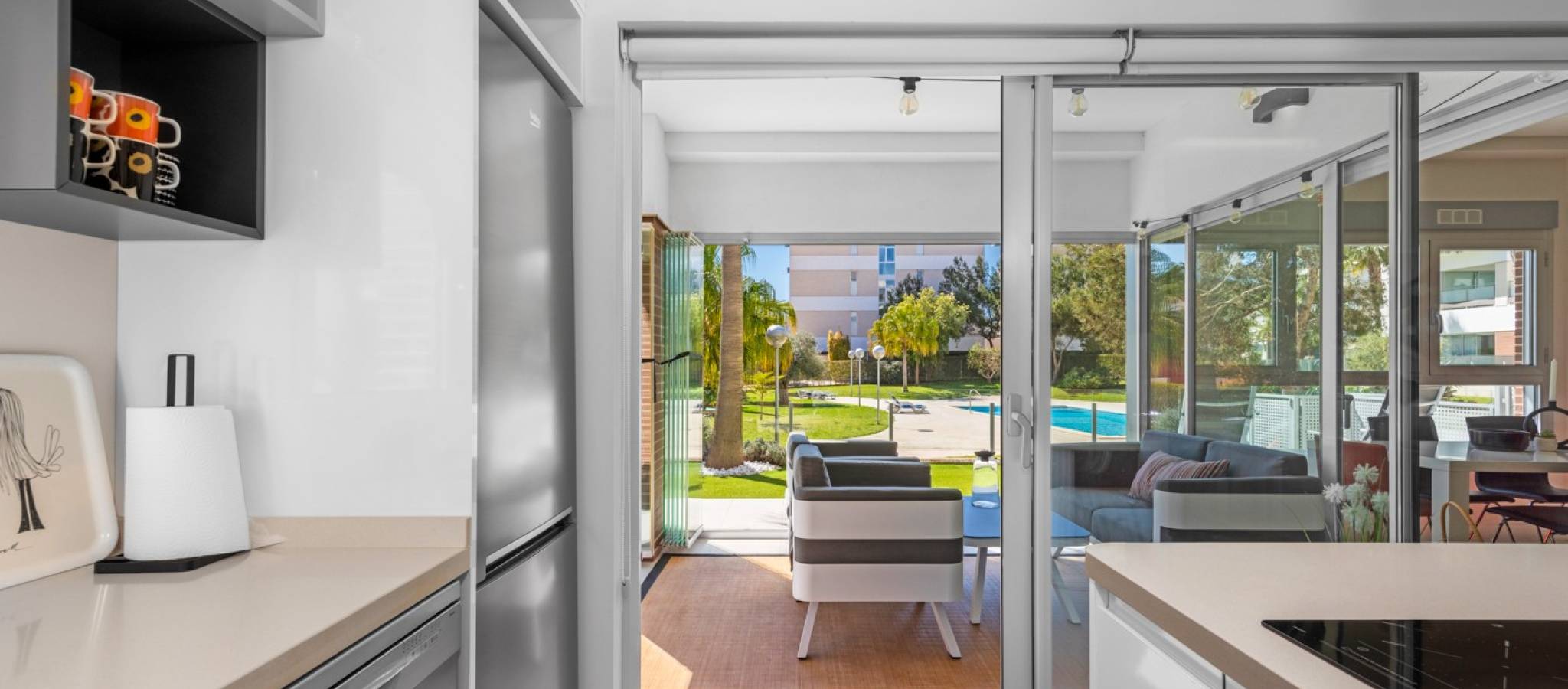 Denne praktfulle og moderne leiligheten på bakkeplan i Los Dolses, Orihuela Costa, har 3 soverom og elegant design. Den tilbyr stil og komfort med en romslig stue og spisestue med åpen kjøkkenløsning, to bad og et vaskerom. Nyt bekvemmeligheten av en overbygd terrasse med glassgardiner og en sørvendt terrasse som vender ut til et stort privat hageområde. Med direkte tilgang til bassengområdet fra hagen, samt privat parkering og en bod, tilbyr denne eiendommen både luksus og praktikalitet.