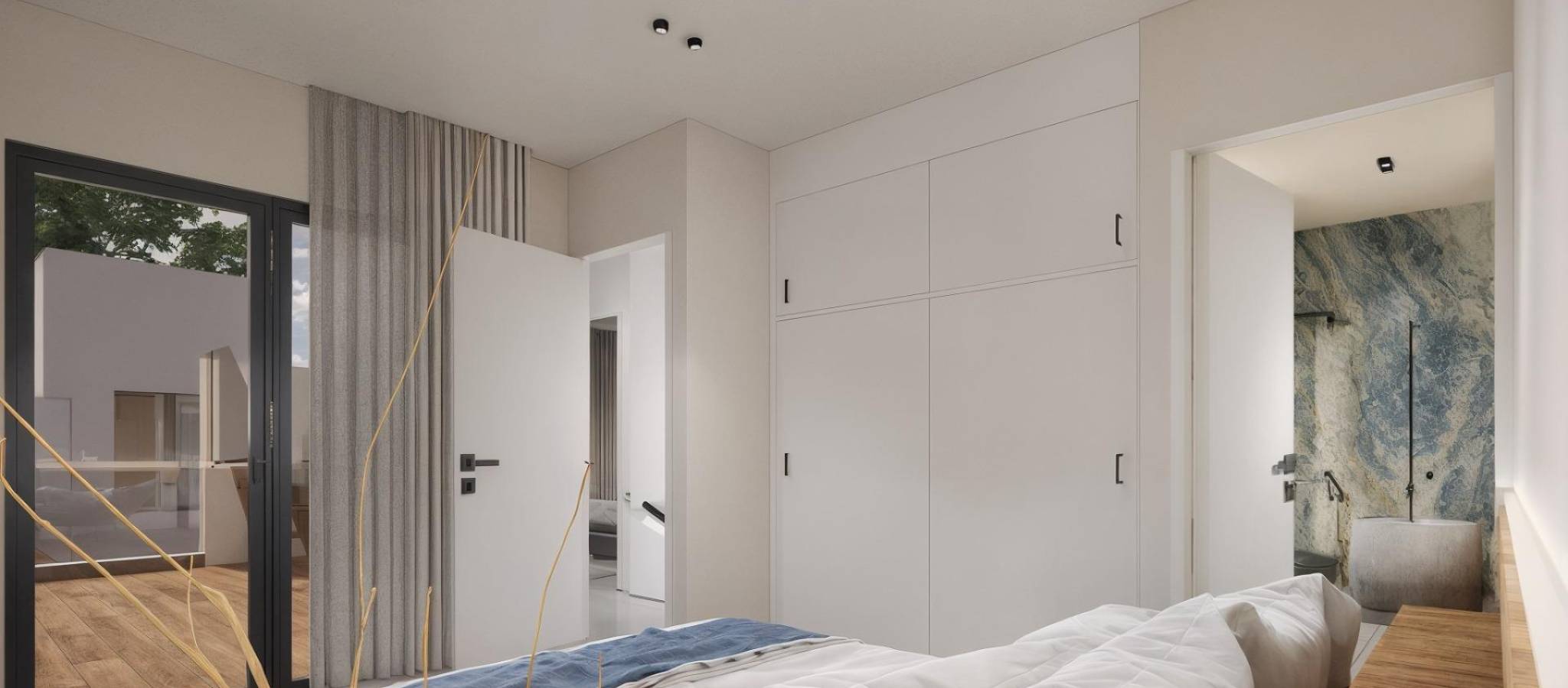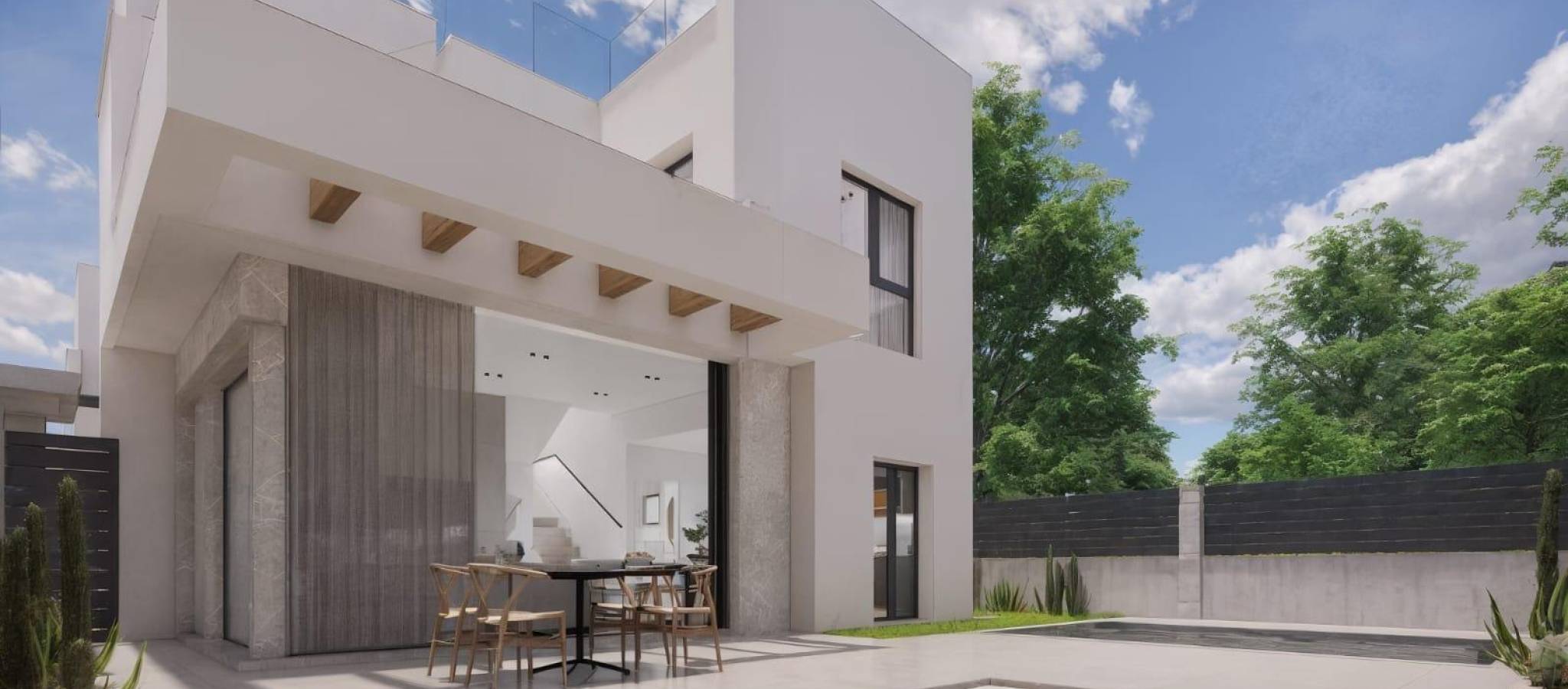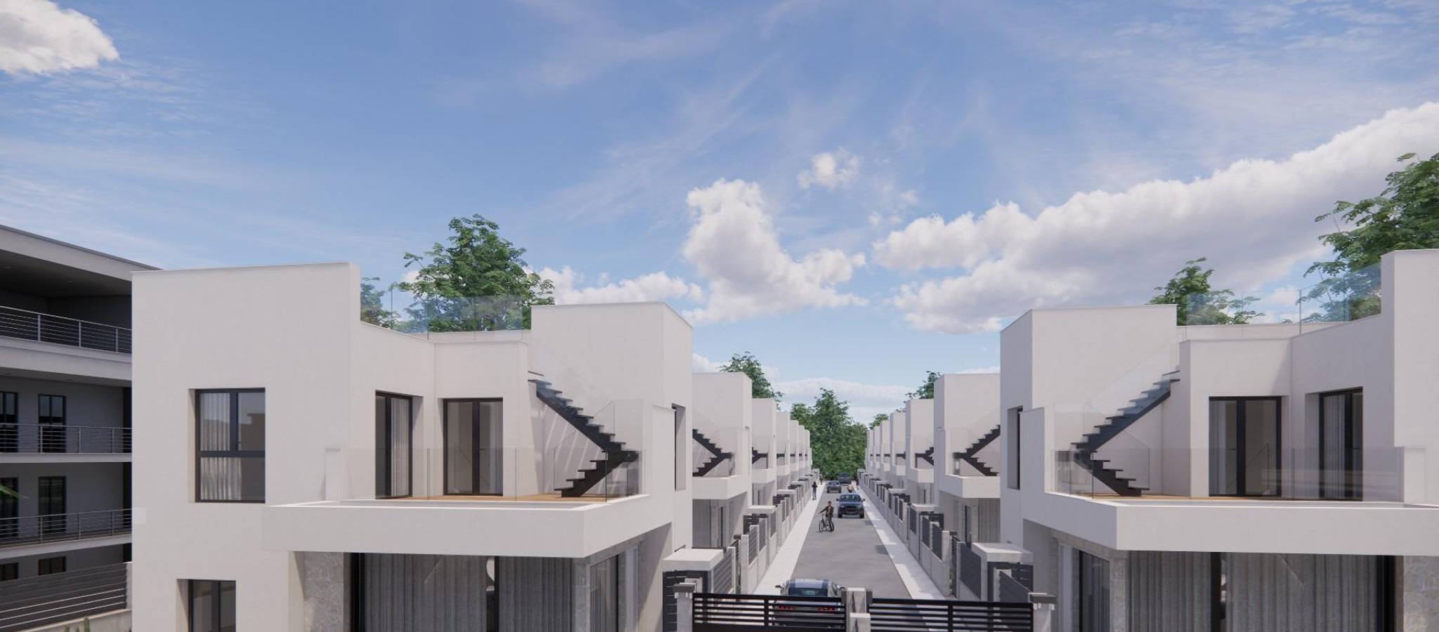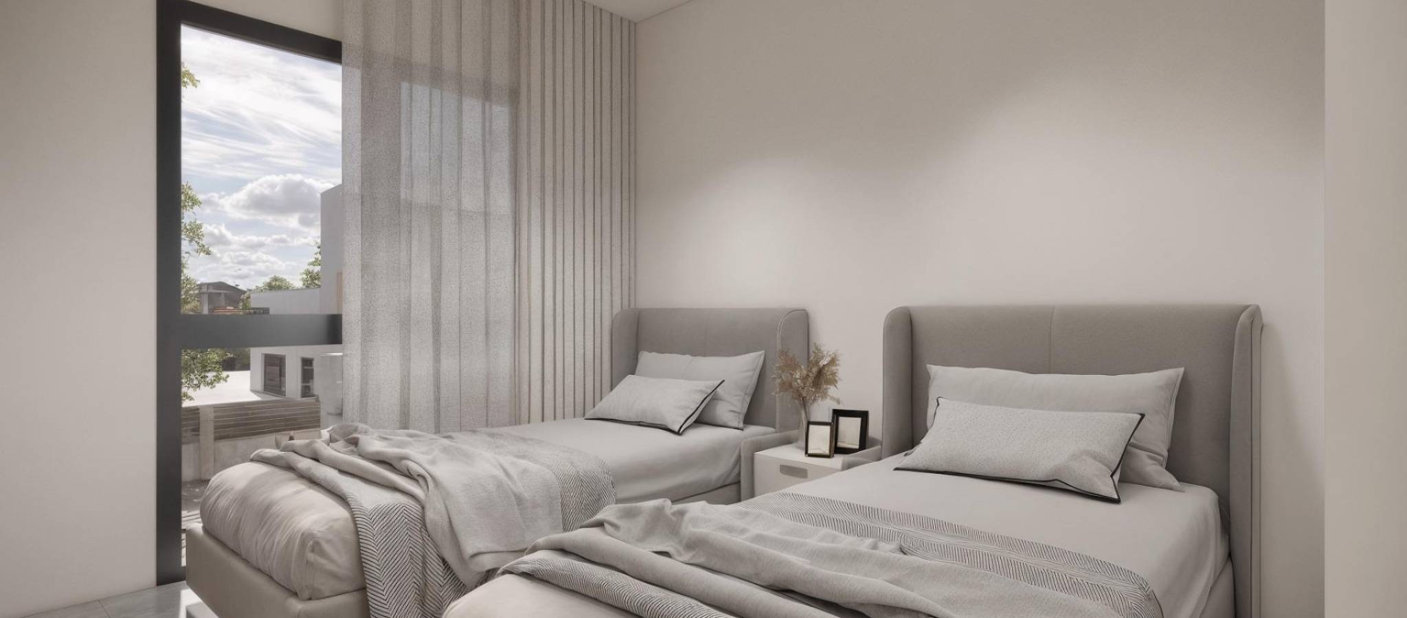 Moderne, nybygde villaer i La Herrada Los Montesinos med privat svømmebasseng Eksklusivt boligprosjekt i fredelige omgivelser Dette eksklusive boligprosjektet med 16 moderne villaer ligger i det prestisjefylte boligområdet La Herrada i Los Montesinos, og tilbyr privatliv, komfort og en utmerket livskvalitet. La Herrada er kjent for sin fredelige boligatmosfære, nærheten til dagligdagse fasiliteter og sin privilegerte beliggenhet mellom de berømte saltslettene Torrevieja og La Mata. Det er et ideelt sted for de som søker en avslappet og sunn middelhavsstil i den sørlige delen av Costa Blanca. Moderne design med optimalisert interiør Hver villa har 130 m² godt fordelt boareal fordelt på to etasjer, designet for å maksimere naturlig lys og funksjonalitet. Eiendommene er bygget på tomter fra 250 m² og tilbyr romslige uteområder som er perfekte for soling, underholdning eller avslapning ved det private bassenget. Komfortabel planløsning over to etasjer Første etasje har en åpen stue med fullt integrert kjøkken og direkte tilgang til hagen og bassengområdet. Denne etasjen har også to soverom, et komplett bad og et praktisk vaskerom. Ovenpå er det to romslige soverom, hvert med eget bad, hvorav det ene er en-suite. Begge soverommene har tilgang til en 28 m² åpen privat terrasse. For de som ønsker enda mer uteplass, er det et valgfritt solarium på taket tilgjengelig mot en ekstra kostnad. Høy kvalitet på finish og moderne funksjoner Villaene har kvalitetsfinish som baderomsmøbler, speil, dusjvegger og gulvvarme i alle bad. Det er forhåndsinstallert for sentral klimaanlegg, en motorisert inngangsport for biler, privat parkering på tomten og inngjerdet tilgang til boligområdet via en privat intern vei. Førsteklasses beliggenhet nær viktige fasiliteter og attraksjoner Guardamar og Torrevieja strender 9 km unna La Marquesa Golf, La Finca Golf og Vistabella Golf mindre enn 5 km unna Alicante flyplass 29 km unna Naturparker, saltsletter, sykkelruter og turstier i nærheten Bo komfortabelt i hjertet av Costa Blanca Disse nybygde villaene i Los Montesinos tilbyr den perfekte kombinasjonen av moderne komfort, naturlige omgivelser og utmerket tilgjengelighet. Enten du er på utkikk etter en permanent bolig eller et feriehus, tilbyr dette prosjektet alt du trenger for å nyte en fredelig og komfortabel middelhavsstil. Kontakt oss i dag for å avtale en visning og sikre deg ditt nye hjem i La Herrada.