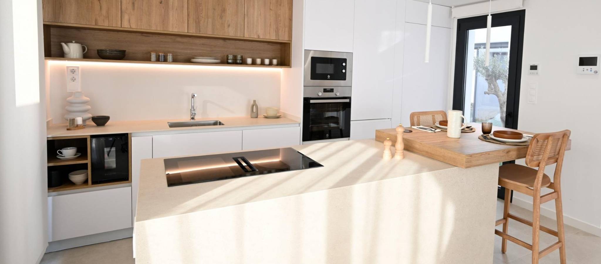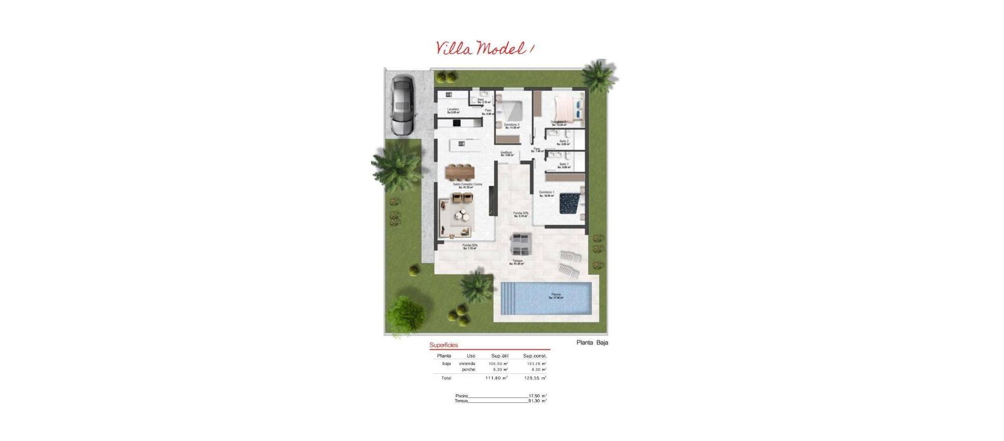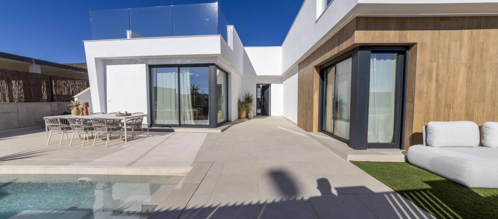 Nybygde villaer i Altaona Golf Resort i Murcia med privat basseng og fjellutsikt Moderne villaer i Altaona Golf Resort i Murcia Oppdag et eksklusivt nybyggprosjekt med moderne villaer i Altaona Golf Resort, et av de mest attraktive boligområdene i Murcia. Omgitt av naturlandskap og fjell tilbyr dette sikre golfresortet et fredelig miljø, samtidig som det ligger bare en kort kjøretur fra byen Murcia og Middelhavskysten. Disse nybygde villaene er designet for å tilby komfort, privatliv og en avslappet middelhavsstil. Prosjektet tilbyr et utvalg av villaer i ett plan med valgfritt solarium eller i to plan, alle med tre soverom og to bad, inkludert et hovedsoverom med eget bad. Romslig design med private hager og basseng Hver villa er bygget på en privat tomt på minst 300 m², og tilbyr rikelig med uteplass for å nyte solskinnet hele året. Eiendommene inkluderer privat svømmebasseng, anlagte hageområder og parkering på tomten. Interiøret er utformet for å maksimere naturlig lys og skape en sømløs overgang mellom inne- og utearealene. Åpne stue- og spisestueområder går direkte ut til terrassen og bassenget, og skaper den perfekte rammen for avslapning eller for å ha besøk av familie og venner. Kvalitetsutførelse og moderne funksjoner Disse villaene er bygget med materialer av høy kvalitet og moderne byggeteknikker for å sikre komfort og energieffektivitet. Funksjonene inkluderer en forsterket sikkerhetsinngangsdør, fullt utstyrt kjøkken med hvitevarer, gulvvarme på badene og LED-belysning innendørs. Ytterligere spesifikasjoner inkluderer forhåndsinstallasjon for kanalisert klimaanlegg og varmtvannsproduksjon via et energieffektivt aerotermisk system, som gir både bærekraft og kostnadsbesparelser. Førsteklasses beliggenhet nær golf, by og kyst Altaona Golf Resort er kjent for sin 18-hulls golfbane, fredelige omgivelser og utmerket sikkerhet, noe som gjør det ideelt for både permanent bolig og fritidsbolig. Anlegget tilbyr en unik kombinasjon av natur, sport og nærhet til viktige destinasjoner. Murcias sentrum ligger bare 15 km unna og tilbyr et bredt utvalg av butikker, restauranter, kulturelle attraksjoner og tjenester. Strendene ved Mar Menor og Middelhavskysten ligger omtrent 20 km unna, perfekt for å nyte solfylte dager ved sjøen. Andre viktige avstander inkluderer Murcia Corvera lufthavn 15 km, Cartagena by 35 km og flere golfbaner innen kort kjøretur, noe som gjør dette til en ideell beliggenhet for golfelskere og internasjonale kjøpere. Ideell investering og mulighet for middelhavslivsstil Disse nybygde villaene i Altaona Golf Resort tilbyr en utmerket mulighet til å nyte en livsstil av høy kvalitet i et naturlig og trygt miljø, med enkel tilgang til både byen og kysten. Kontakt oss i dag for mer informasjon eller for å avtale en visning, og oppdag ditt nye hjem i Murcia.
