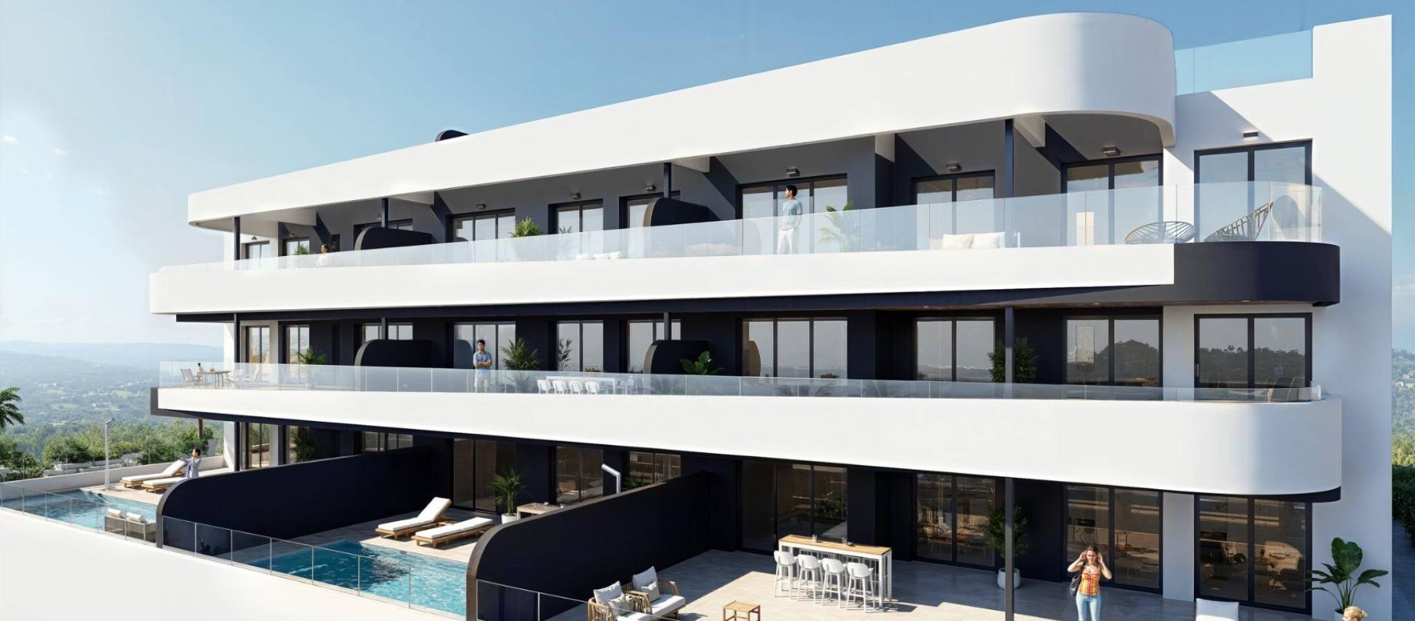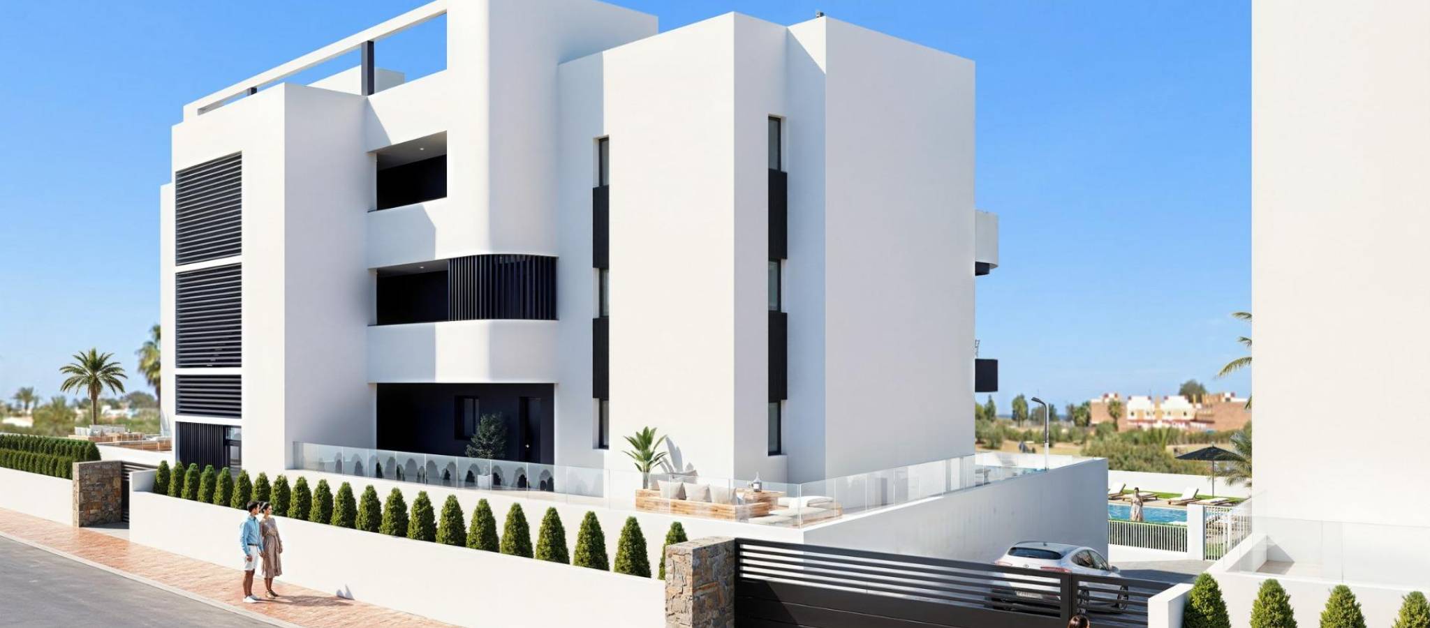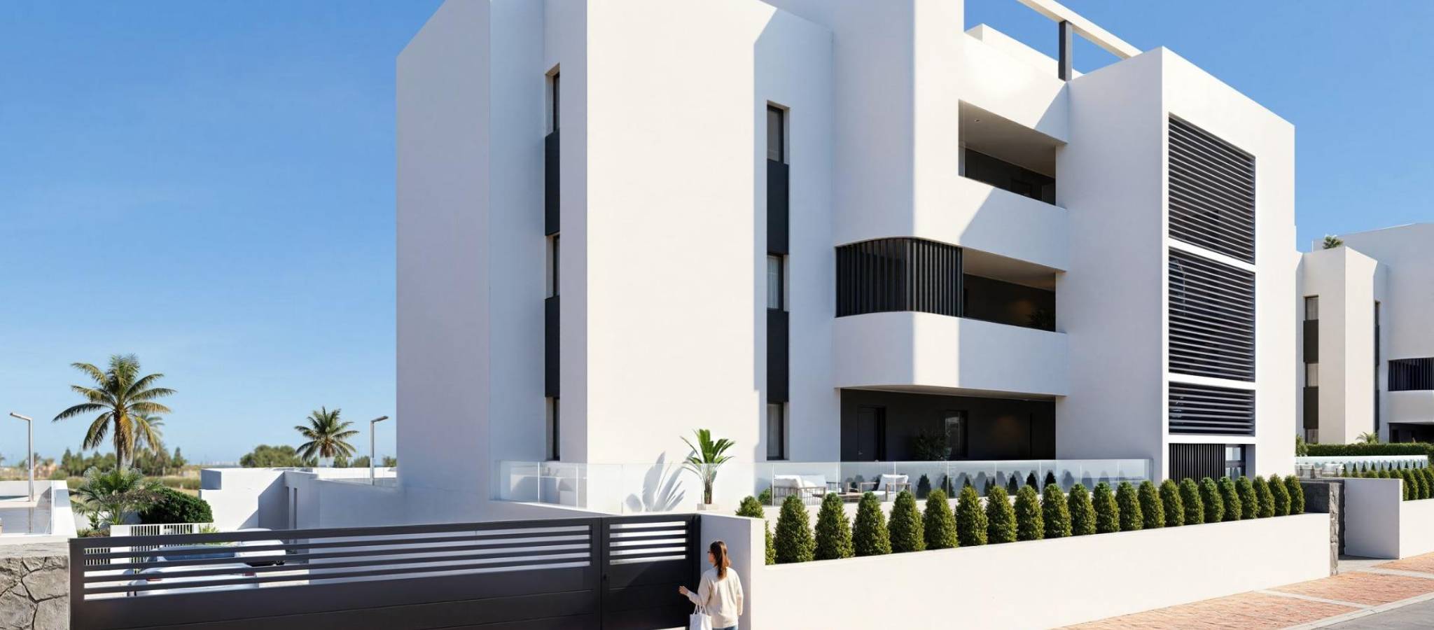 Nybyggede leiligheter og villaer med utsikt mot golfbanen i La Serena Golf, Los Alcazares Eksklusivt boligprosjekt med direkte utsikt mot La Serena Golf Oppdag dette enestående nybyggprosjektet med direkte utsikt mot La Serena Golf i Los Alcazares, en av de mest ettertraktede kystbyene på Costa Calida. Dette eksklusive boligområdet tilbyr en førsteklasses livsstil omgitt av natur, åpne utsikter og direkte tilgang til en kjent 18-hulls golfbane kjent for sitt flate terreng, naturskjønne innsjøer og tekniske utfordringer. Ideelt beliggende bare 1,7 km fra strendene ved Mar Menor og sentrum, kan beboerne nyte både ro og enkel tilgang til restauranter, butikker og alle nødvendige tjenester. Los Alcazares er kjent for sin avslappede atmosfære, lange promenader og varme, grunne vann, noe som gjør stedet perfekt for helårsbolig eller ferieopphold. Moderne leiligheter med terrasser og private solterrasser Prosjektet består av 36 moderne leiligheter fordelt på fire blokker. Kjøpere kan velge mellom planløsninger med to eller tre soverom og to bad, inkludert et bad på soverommet. Leilighetene i første etasje har romslige terrasser med mulighet for å legge til et privat basseng. Leilighetene i mellometasjene har store utendørsterrasser, mens penthouse-leilighetene har private solterrasser som er ideelle for soling og utendørs servering. Alle leilighetene har underjordisk parkering og bod med heis. Anlegget tilbyr også vakre, anlagte middelhavshager og et stort felles svømmebasseng som beboerne kan nyte. Stilfulle enetasjesvillaer med privat basseng I tillegg til leilighetene tilbyr prosjektet ni eksklusive enetasjesvillaer. Disse boligene har tre soverom, to bad og et ekstra gjestetoalett, alt designet for å gi en sømløs overgang mellom inne- og utearealer. Hver villa har privat svømmebasseng, hage, bod og privat parkering. En romslig, åpen kjeller gir ekstra fleksibel plass som kan tilpasses individuelle behov, for eksempel som treningsrom, underholdningsområde eller ekstra lagringsplass. Høykvalitets finish og energieffektiv design Alle boligene er bygget med materialer av høy kvalitet og moderne spesifikasjoner. Funksjonene inkluderer utvendig snekkerarbeid i aluminium med termisk brudd, fullt utstyrte bad med servantskap og dusjvegger i glass, samt forhåndsinstallasjon for kanalisert klimaanlegg og møblerte kjøkken i leilighetene. Villaene leveres med fullt installerte klimaanlegg og fullt utstyrte kjøkken med hvitevarer. Det er heiser i leilighetsblokkene, noe som sikrer komfort og tilgjengelighet. Førsteklasses beliggenhet nær golf, strender og fasiliteter Dette prosjektet tilbyr utmerket tilknytning til viktige severdigheter. Murcia internasjonale lufthavn ligger 35 km unna, og Alicante lufthavn ligger 95 km unna. Marinaen i Los Alcazares ligger bare 2 km unna, Dos Mares kjøpesenter ligger 15 km unna, og Roda Golf ligger bare 4 km fra prosjektet. Cartagena sentrum ligger 25 km unna. Ideell investering og mulighet for middelhavsliv Dette boligprosjektet ved golfbanen gir en unik mulighet til å nyte et moderne liv i en privilegert beliggenhet nær både sjøen og golfbanen. Kontakt oss i dag for å få mer informasjon eller for å avtale en visning, og finn ditt perfekte hjem i Los Alcazares.