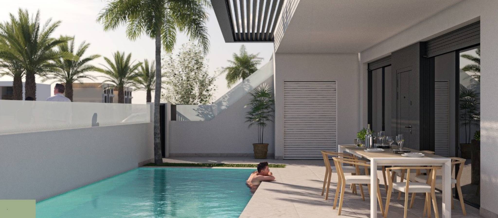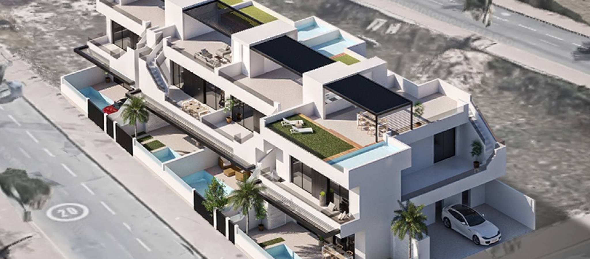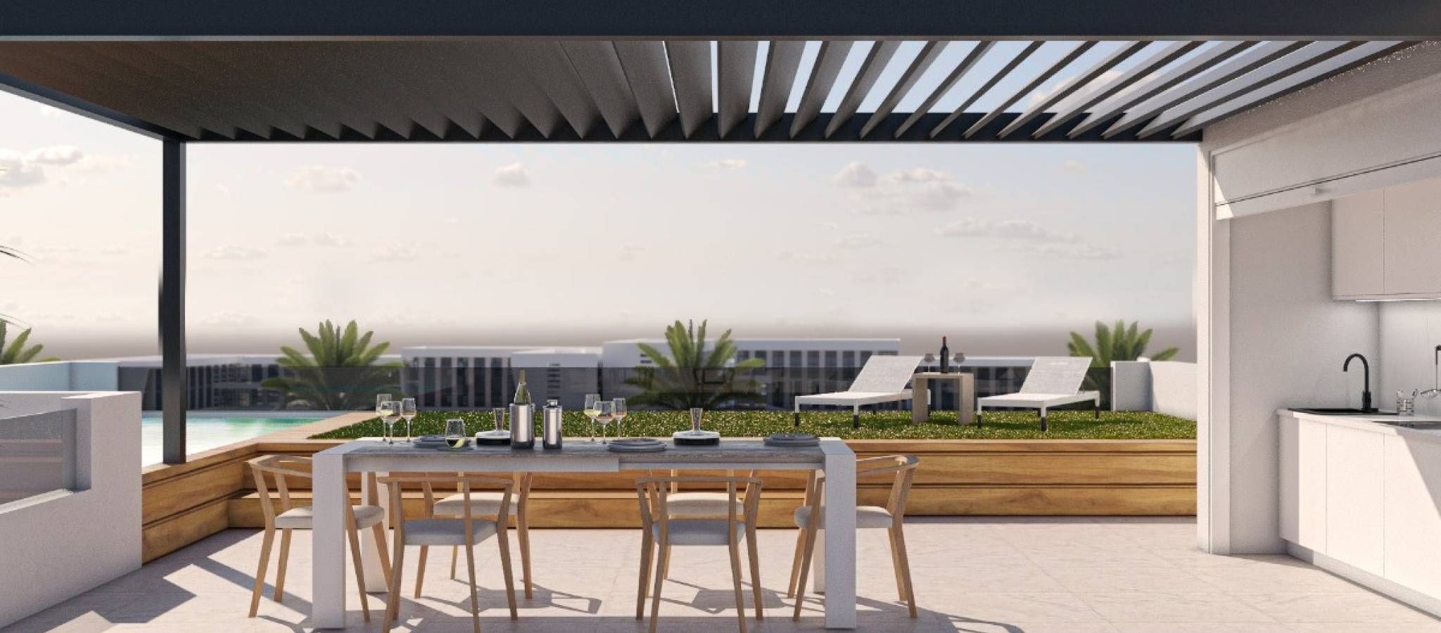 Oppdag moderne duplexer med tre soverom og to bad i San Pedro del Pinatar. Disse nye boligene tilbyr alternativer med hage i første etasje eller terrasser og solarium med utekjøkken i toppetasjen. Eiendommene lover komfort og eleganse, ideelle for å nyte et eksklusivt opphold. Designet med et konsept av åpen stue mot kjøkkenet, tilbyr disse boligene rom og stil. Duplexene i første etasje inkluderer store terrasser med privat svømmebasseng, parkeringsplass og bod innenfor tomten. Enhetene i toppetasjen har en privat balkong og en takterrasse med privat svømmebasseng og toalett, i tillegg til parkering og bod i komplekset. De øvre duplexene er utstyrt med et komplett utekjøkken, elektrisk grill, dusj med varmt vann og en elegant metallpergola. Dette designet gir en ekstra flate som kan nytes året rundt, med skygge i de varme sommermånedene. Plassert ved Mar Menor av Costa Cálida i Murcia, er San Pedro del Pinatar en sjarmerende by kjent for sin fiskerihavn og nærhet til den spektakulære lagunen La Manga. Tilbyr mange tjenester, inkludert barer, restauranter og shoppingområder. Denne destinasjonen er kjent for sine vakre strender, som Playa de la Torre Derribada og Playa de Llana, med diverse kulinariske alternativer og rikelig med parkering. Bare 46 km fra Murcia og 87 km fra Alicante, San Pedro del Pinatar er det perfekte stedet for å nyte den middelhavsstranda i et dynamisk og praktisk miljø. Eiendommene presenteres i et prisspenn fra 409 000 € til 489 000 €, med en boareal på 87 m² til 249 m².