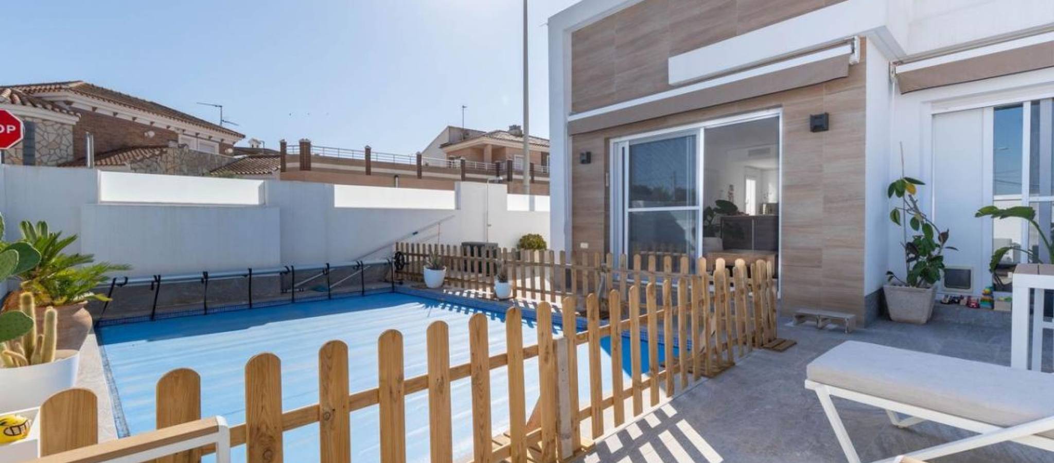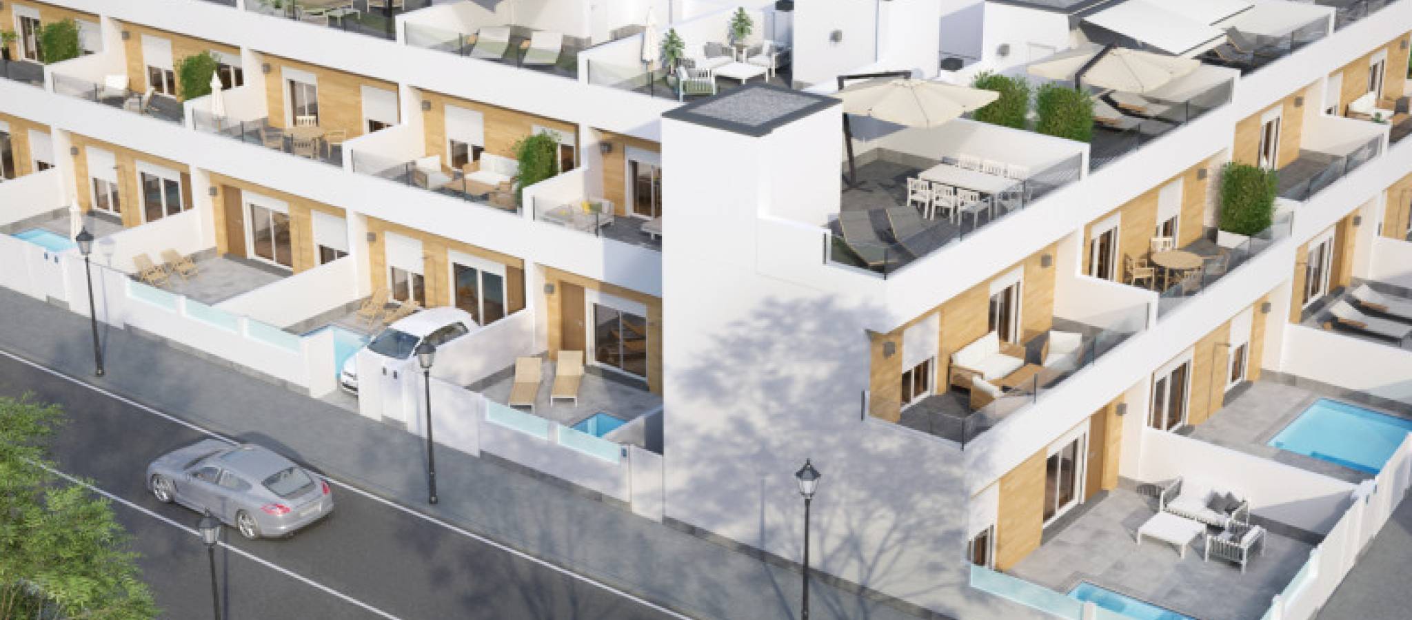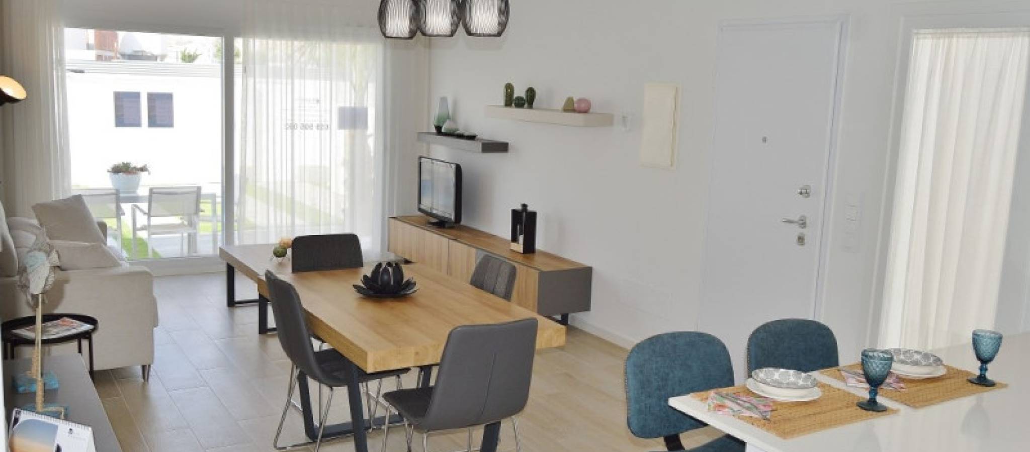 Eiendom i Aire Limpio III Oppdag luksus og komfort i dette eksklusive komplekset med 10 rekkehus i Murcia, Avileses. Hver av disse eiendommene har svømmebasseng og privat parkering, noe som sikrer en livsstil i toppklasse. Fordeler med nybygg Aire Limpio III Med romslige terrasser og et generøst solarium kan beboerne nyte det solrike været året rundt. Boligene har tre soverom og to bad fordelt på tre etasjer. Designet med en moderne stil og et åpent konsept, har de en helt utstyrt åpen kjøkkenløsning og en stue/spisestue. Livet i byen Avileses Strategisk beliggenhet, dette utviklingsområdet er omgitt av tjenester og sportsaktiviteter. Bare en kort kjøretur unna finner man anerkjente golfbaner, noe som gjør Avileses til det perfekte stedet å slå seg ned. I tillegg gjør nærheten til Murcia flyplass og kysten både ved Mar Menor og Middelhavet det ideelt for et dynamisk liv. Eiendommene, med overflater mellom 110 m² og 112 m², oppfyller de høyeste kvalitetsstandarder og er utstyrt med mange bekvemmeligheter. Svømmebassenget har dusj og kjøkkenet er fullstendig utstyrt med høykvalitets hvitevarer som induksjonstopp, stekeovn, mikrobølgeovn, avtrekksvifte, integrert kjøleskap og oppvaskmaskin. Badene inkluderer hengende toaletter, moderne servantmøbler, speil og regndusjer. Skapene er praktiske, kledd med fôr og skuffeseksjoner. Det innvendige lyset i kjøkken, stue, gang og bad er optimalisert med LED-spotter, samt i hagen og solariet. Disse boligene har også forhåndsinstallasjon av klimaanlegg for ekstra komfort. Med en prisskala mellom 269 000 € og 294 000 €, representerer disse eiendommene en stor mulighet for dem som ønsker høy livskvalitet i Spania. For mer informasjon og for å avtale et besøk, er du velkommen til å ta kontakt. Vi ser frem til å hjelpe deg og vise deg alle detaljene.