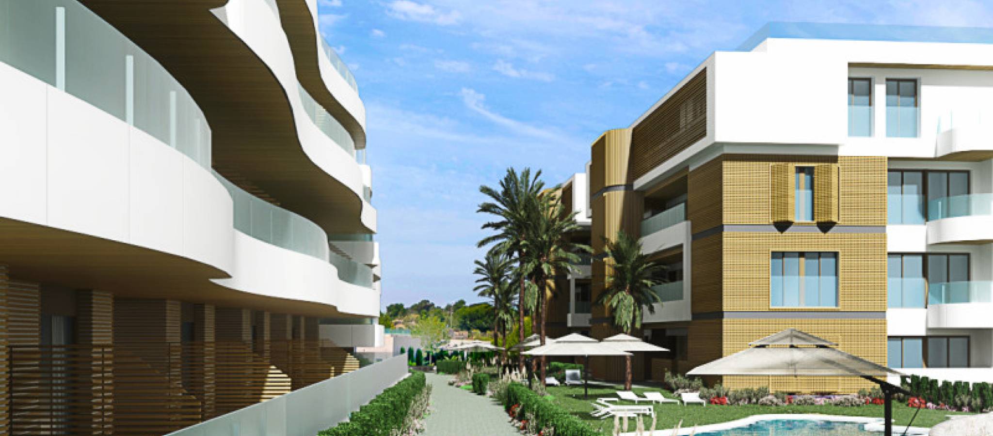 Beliggende i den ettertraktede Orihuela Costa-regionen, bare 500 meter fra havet, finnes et nyskapende boligprosjekt som redefinerer kunsten å leve ved Middelhavet. Dette imponerende prosjektet inkluderer storslåtte felles bassenger, revitaliserende jacuzzier og flotte hager designet for å tilby øyeblikk av fred og ro. Dette nybyggde komplekset tilbyr et utvalg av eiendommer, med priser fra 325 000 € til 525 000 €, og størrelser fra 101 m² til 169 m². Kjøpere kan velge leiligheter med 2 til 4 soverom, enten i første etasje med hyggelige private hager eller i toppleiligheter med eksklusive solarium. Alle leilighetene har garasjeplass og bod som en del av fasilitetene. Ligger i en utmerket posisjon, gir dette boligprosjektet tilgang til et bredt utvalg av tjenester i umiddelbar nærhet: supermarkeder, barer, restauranter og mye mer beriker et svært imøtekommende miljø. I tillegg er det kjente kjøpesenteret Zenia Boulevard bare 1 km unna, og flere kjente golfbaner ligger omtrent 5 km unna, som sikrer en aktiv og komplett livsstil. Orihuela Costa, i Alicante, er en destinasjon som tilbyr en perfekt kombinasjon av kystskjønnhet og tjenester av høy kvalitet. Takket være sitt varme klima og nærhet til strendene, blir det til det ideelle stedet ikke bare for å nyte en ferie, men også for å etablere en permanent bolig i et livlig og avslappende miljø.