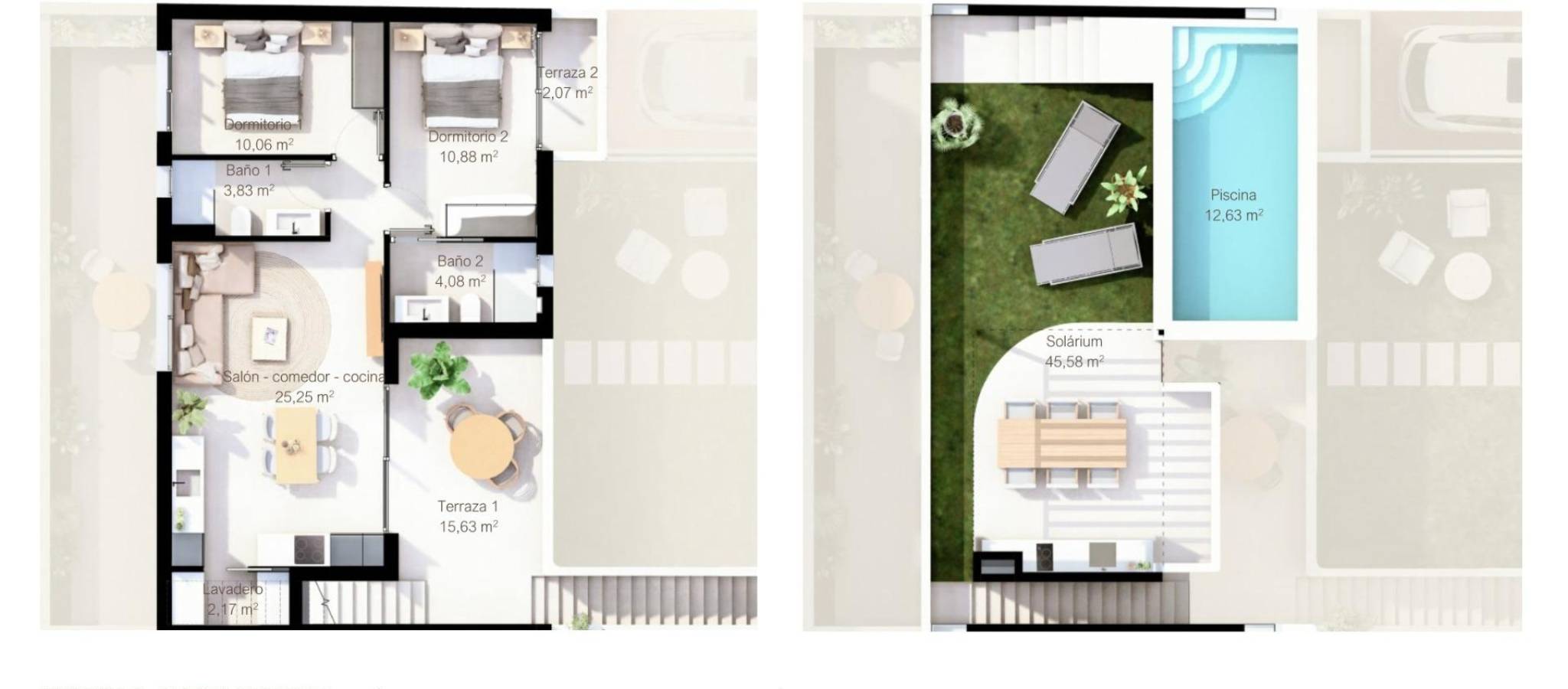 Penthouse Bungalows: Including a large terrace, private rooftop solarium with pool, plus ground-floor storage and a private parking space.
