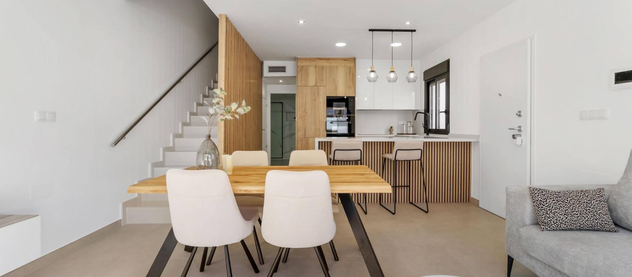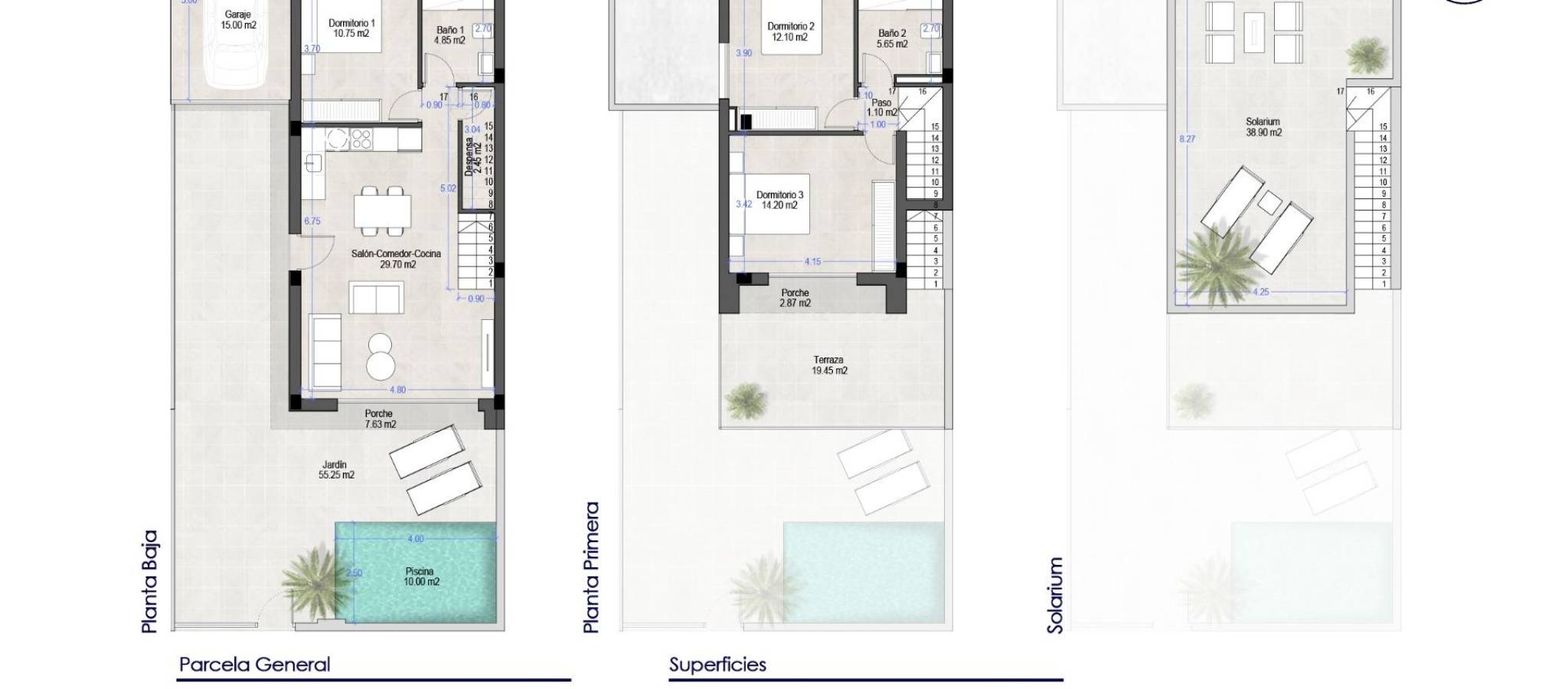 New Build Semi-Detached Villas with Private Pool in San Pedro del Pinatar Modern Homes in a Prime Location This exclusive development of 5 semi-detached villas is located in San Pedro del Pinatar, a vibrant coastal town in the Costa Cálida. Positioned near the municipal sports center, within walking distance to the town center, and just 3.5 km from the beaches of the Mar Menor and Mediterranean, these homes offer the perfect blend of comfort, convenience, and Mediterranean lifestyle. Contemporary Design and Functional Layout Each villa is distributed across two floors and designed with modern architecture, maximizing space and natural light. With 3 bedrooms and 2 bathrooms, these properties are ideal for families, holiday homes, or investment. Ground Floor: Open-plan kitchen connected to the bright living and dining area, one bedroom, one bathroom, a rear patio and direct access to the private garden with pool. First Floor: Two additional bedrooms, one bathroom, and a spacious terrace with access to the private rooftop solarium, perfect for sunbathing or entertaining. Quality Finishes and Comfort The villas are delivered with high-quality specifications and thoughtful details to ensure modern living: Fully furnished and equipped kitchen with appliances Private swimming pool and garden Rooftop solarium for year-round outdoor living Summer kitchen included Interior and exterior lighting package Closed private garage San Pedro del Pinatar - Lifestyle and Surroundings San Pedro del Pinatar is renowned for its year-round sunshine, sandy beaches, and natural landscapes such as the famous Salinas y Arenales Natural Park. The town offers all essential services, including shops, supermarkets, restaurants, health centers, and sports facilities, making it an excellent place for both permanent living and holidays. Distances to key points of interest: Beaches of the Mar Menor - 3.5 km Dos Mares Shopping Center - 5 km Lo Pagán Marina - 4 km Roda Golf - 8 km Murcia Airport (Corvera) - 35 km Alicante Airport – 75 km Secure Your New Home by the Sea These new build semi-detached villas in San Pedro del Pinatar combine modern design, high-quality finishes, and a privileged location close to the sea and all amenities. Contact us today for more information or to schedule a viewing and take the first step toward your dream Mediterranean home.