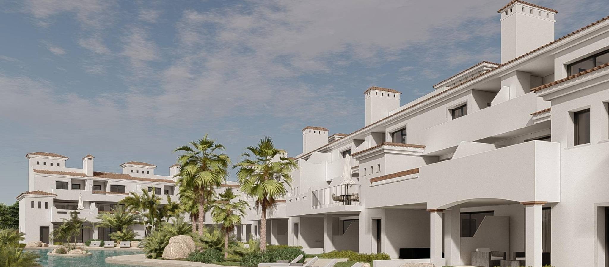 NEW BUILD RESIDENTIAL IN LOS ALCAZARES New Build Mediterranean style residential complex in Los Alcazares. Ground floor apartments has 2 bedrooms, 2 bathrooms with private gardens and penthouses has 3 bedrooms, 3 bathrooms and terrace, all with open plan kitchen with living area, fitted wardrobes, air conditioning, household appliances, parking space and storage room. Residential complex has elevator and community garden with the swimming pool. The feeling of privacy and comfort is very important to us, which is why in our homes you will find high walls in gardens and their terraces, a comforting swimming pool and green areas accompanied by natural vegetation arranged to have contemplative views both outside and inside. In addition, you will find a large masonry wall, which has become the identity of the company and generates hierarchy and harmony in the facades, thus giving a warm contrast between white and earth colours. Our interiors convey a minimalist and warm feeling, we also seek a balance between aesthetics and functionality, we think of every detail and everything is designed to the millimetre. You will find neutral and spacious spaces, accompanied by warm lighting where the colour white stands out for its neutrality and allows you to decorate without limitations. Residential located in Los Alcázares an exceptional area on the Costa Cálida at only 25 minutes from Murcia airport and 55 min from Alicante airport. The area is connected through highway with the cities of Cartagena, Murcia and Alicante and the rest of the beaches of the Costa Cálida and the Costa Blanca. Residential located near of the prestigious golf course "La Serena Golf". This golf course is well renowned for its lakes and vegetation that interweave with the golf course. The water and lakes are present in 16 of the 18 holes, but all the course is designed to offer the golfer different strategies in each hole. Another aspect that makes this golf course unique is that it's connected by walking to the city centre, something impossible to find in other golf locations that allow us to enjoy the calm and the beauty of the area without refusing the access to the services that Los Alcázares offers.