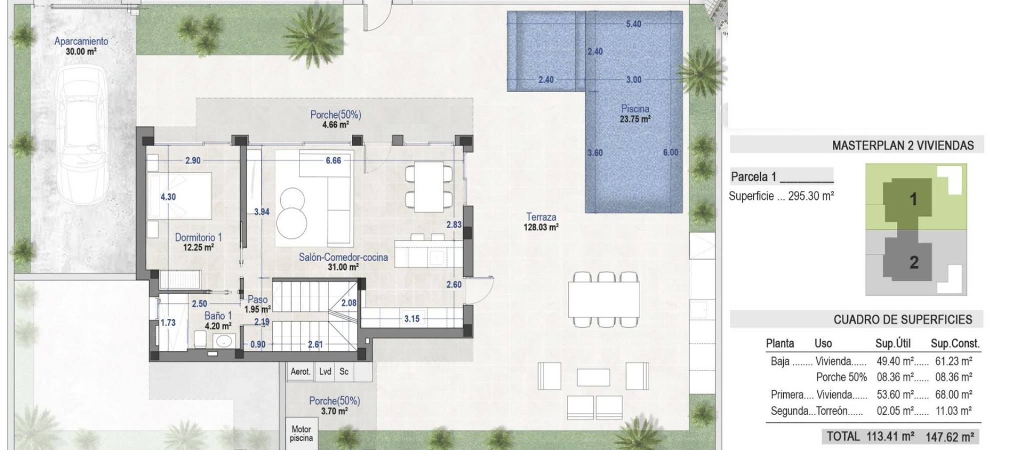 Modern Semi-Detached Villas at Santa Rosalía Lake and Life Resort - A New Standard of Mediterranean Luxury Contemporary Design Inspired by the Mediterranean Discover these exclusive new semi-detached villas located in the prestigious Santa Rosalía Lake and Life Resort, a unique residential destination on the Costa Cálida. Inspired by Mediterranean architecture, these villas combine clean lines, natural light, and modern comfort to create a harmonious and elegant living environment. Each villa is designed to provide a perfect balance between luxury and relaxation, making it ideal as a permanent residence, holiday home, or investment opportunity. Spacious Layout and High-End Finishes Each villa offers 220 m² of living space distributed across a basement, two main floors, and a rooftop solarium, set on generous 295 m² plots. The homes feature 4 bedrooms and 4 bathrooms (3 en suite), providing ample space for family and guests. The private pool with jacuzzi area, large terraces, and rooftop solarium with summer kitchen and toilet invite you to enjoy the region’s exceptional climate all year round. Premium specifications include: Fully furnished kitchen with Bosch appliances Bathrooms with furniture, mirrors, shower screens, and towel heaters Armoured entrance door and motorized access gate for vehicles LED spotlights throughout the interior and exterior Ducted air conditioning (installed on both floors) Private pool with jacuzzi area 2 photovoltaic solar panels for energy efficiency Summer kitchen in the garden Underground level with English patio for natural light and ventilation Resort-Style Living at Santa Rosalía Santa Rosalía Lake and Life Resort is a private, gated community with 24-hour security, designed around an impressive 126,000 m² of green areas. Residents enjoy walking and cycling paths, sports facilities, paddle and tennis courts, mini-golf, gardens, dog parks, and leisure zones. The clubhouse and the resort’s centerpiece-a stunning 17,000 m² crystal-clear lagoon surrounded by white sandy beaches and palm trees-offer a true Caribbean-inspired lifestyle. The lagoon even features two islands, one with its own bar, and several beach chiringuitos for relaxed dining. Prime Location on the Costa Cálida The development enjoys a central location within the resort, close to the lagoon and beach club. It’s less than 4 km from Los Alcázares Beach, 15 minutes from Cartagena, and only 22 km from Murcia International Airport. Golf enthusiasts will find several top-rated courses within a short drive, while local marinas, restaurants, and shopping areas complete the vibrant lifestyle offering. Your Exclusive Mediterranean Retreat Awaits Experience the perfect combination of luxury, comfort, and wellbeing in the heart of the Costa Cálida. Contact us today to schedule a visit and discover your dream villa at Santa Rosalía Lake and Life Resort.