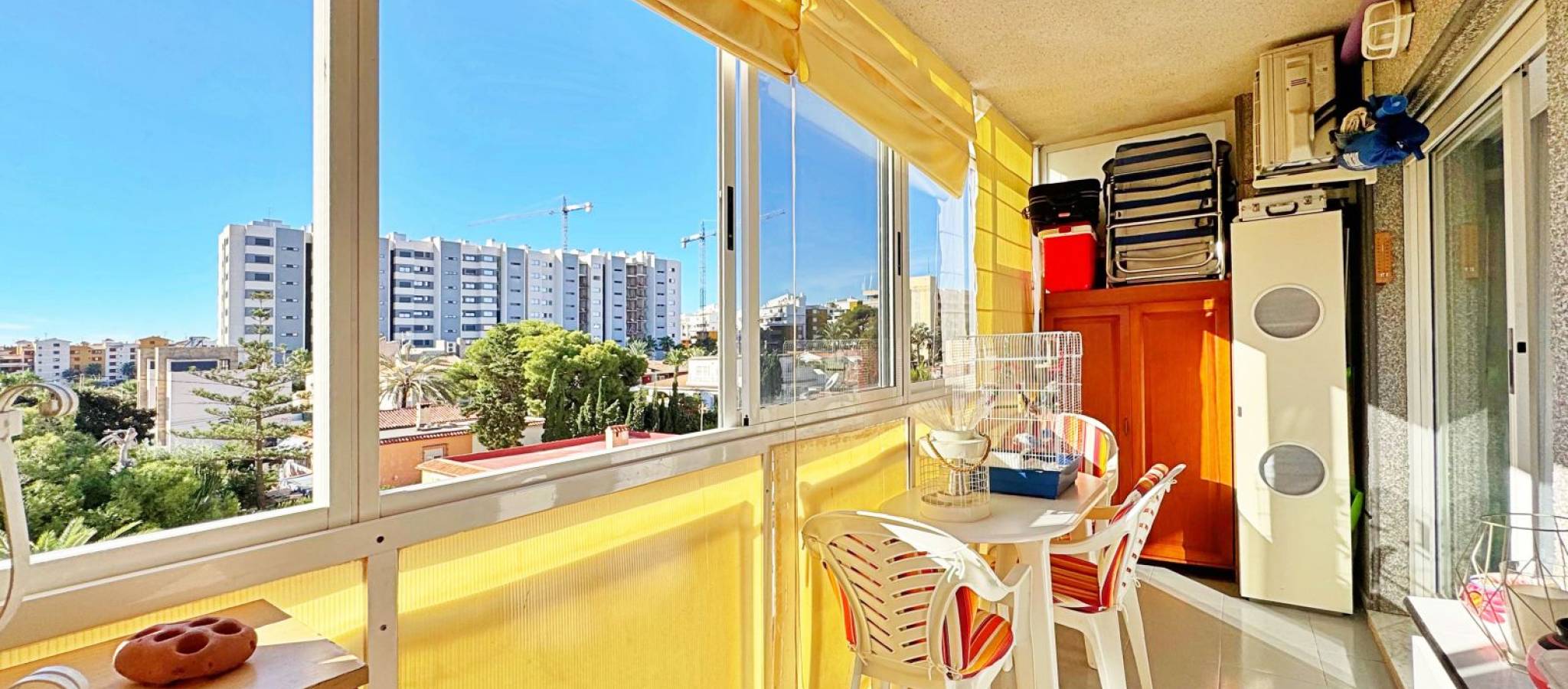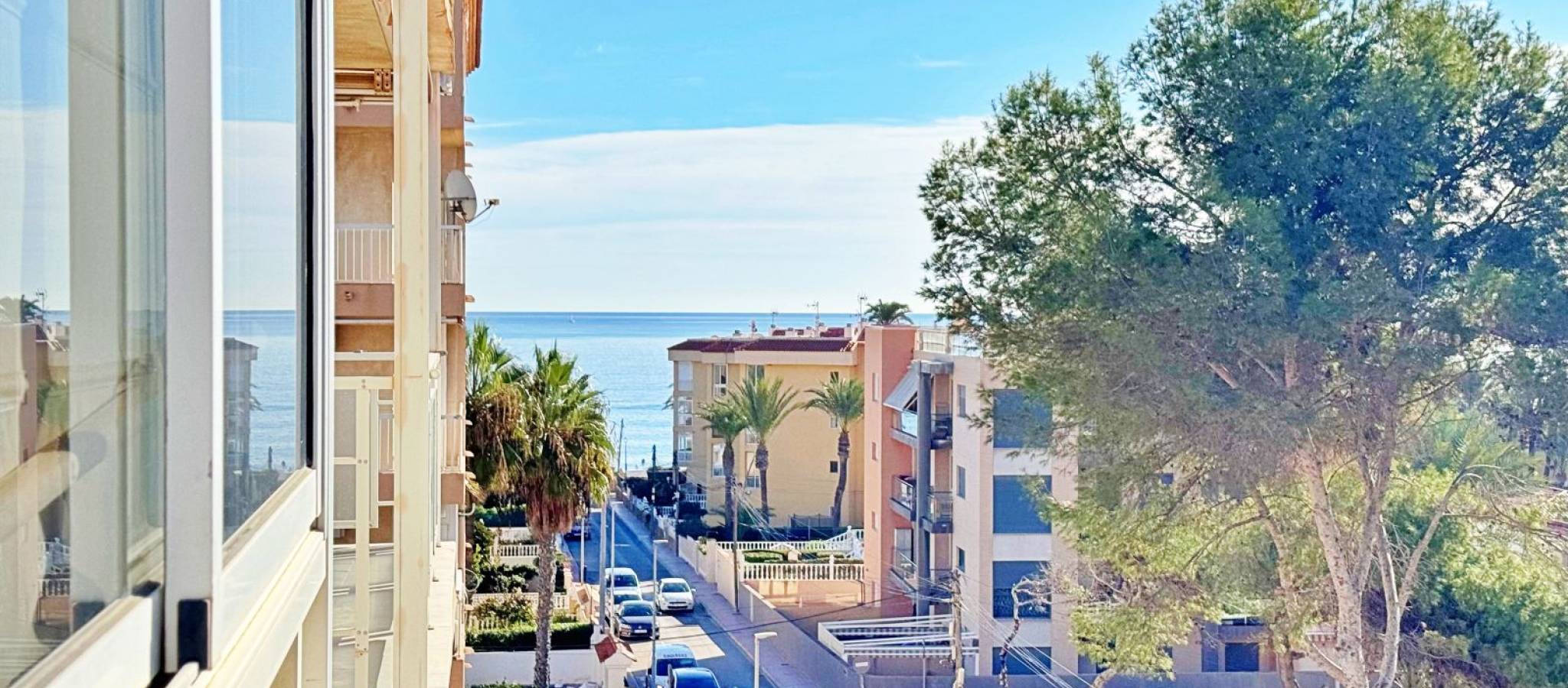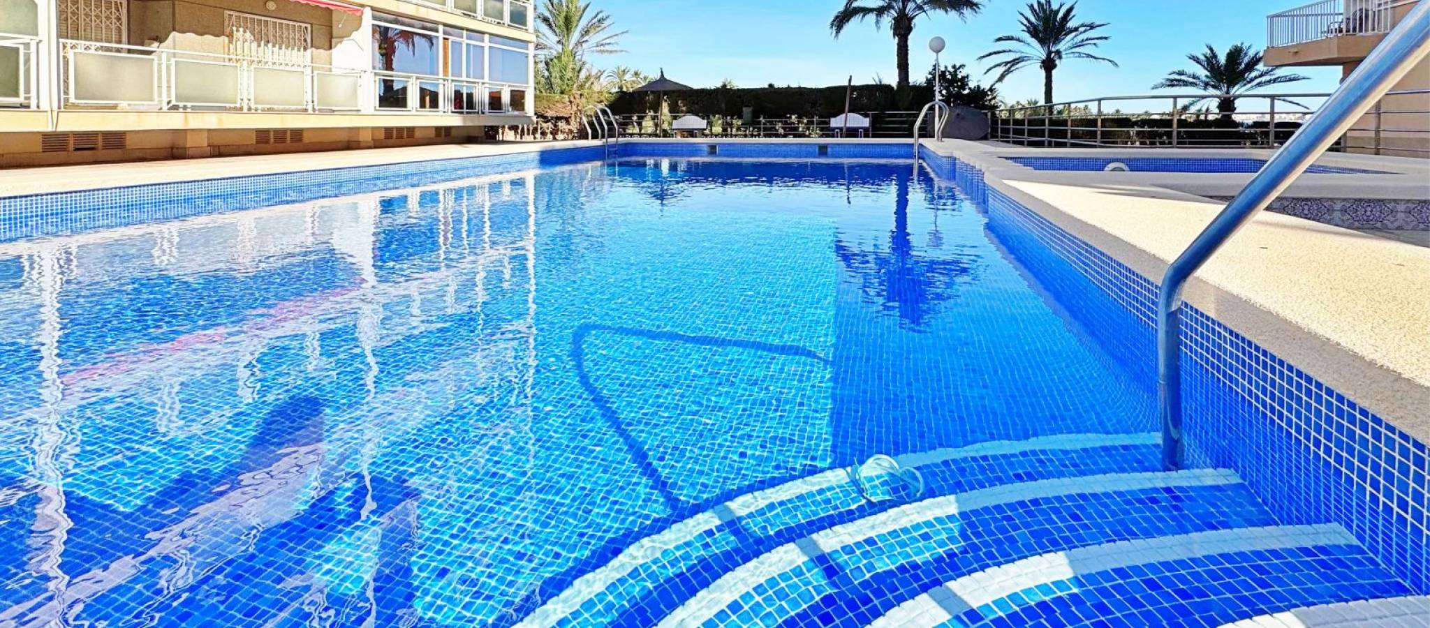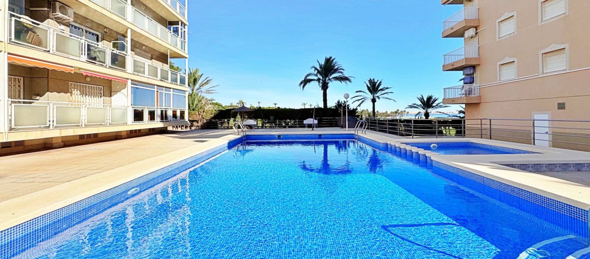 Apartment for sale in Rocío del Mar, Torrevieja, located in an exclusive residential area next to Punta Prima, just 200 metres from the sea. This 43 m² property is part of a private urbanisation with a communal swimming pool, offering a quiet and family-friendly atmosphere all year round. The apartment is in excellent condition and benefits from a south-facing orientation, ensuring natural light throughout the day. It features a bright living-dining room with access to a glazed terrace perfect for enjoying the Mediterranean climate, a fully equipped kitchen, one double bedroom with fitted wardrobe, and a complete bathroom with bathtub and natural ventilation. The terrace has pleasant side sea views and enough space for a table and chairs. Additional features include air conditioning in the living room, awnings on the terrace, tiled floors, lift in the building and adapted access. The property is delivered ready to move into. The private complex offers a large communal pool surrounded by sunbathing areas and well-kept gardens. Its privileged location, only 200 metres from the sea and within walking distance to supermarkets, restaurants, public transport and leisure areas, makes it an ideal option for those seeking comfort and convenience. This apartment in Rocío del Mar, Torrevieja, represents an excellent purchase opportunity — perfect as a permanent residence, holiday home or investment with high rental potential in one of the most desirable coastal areas of the Costa Blanca.
