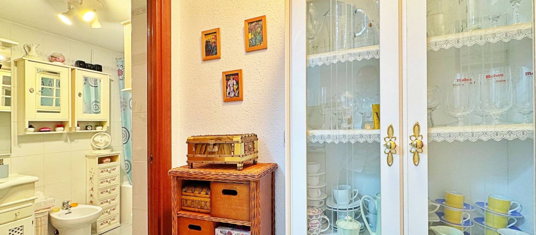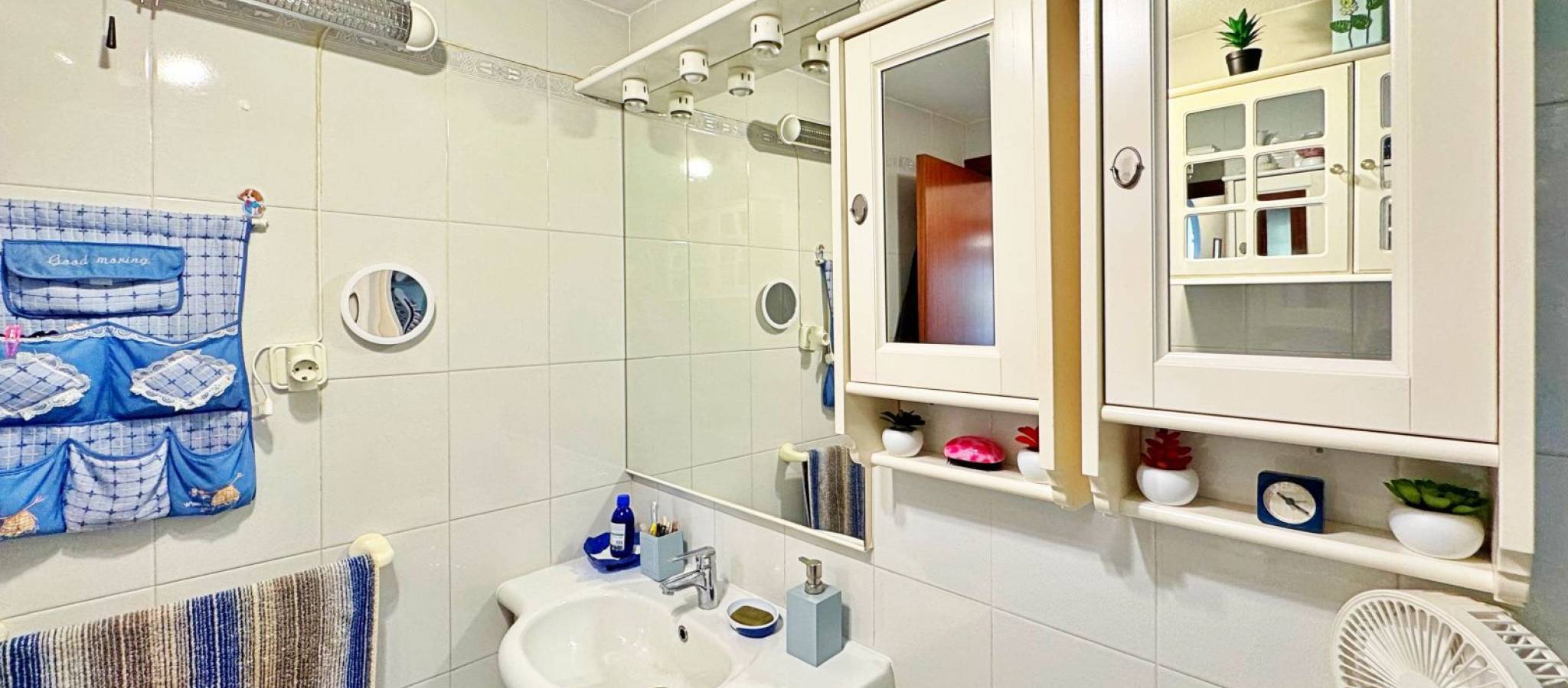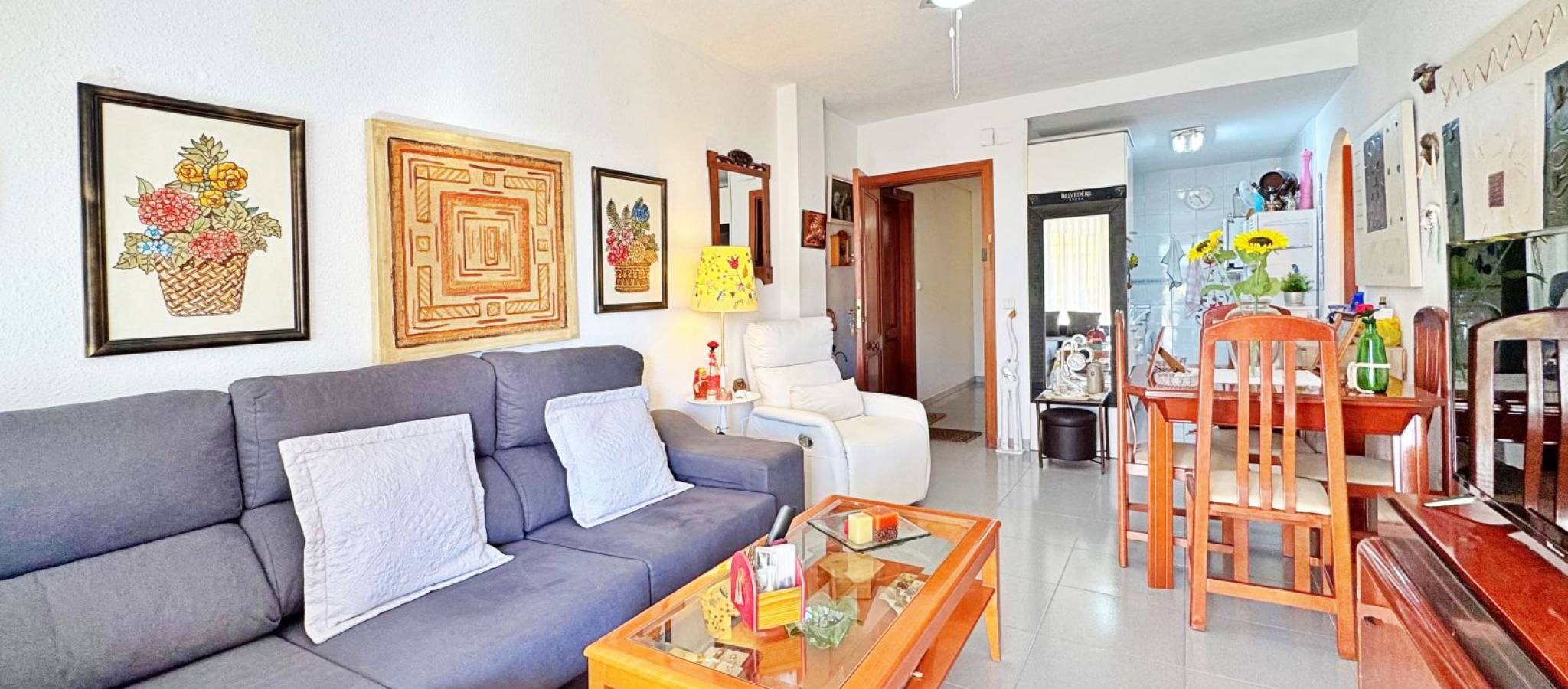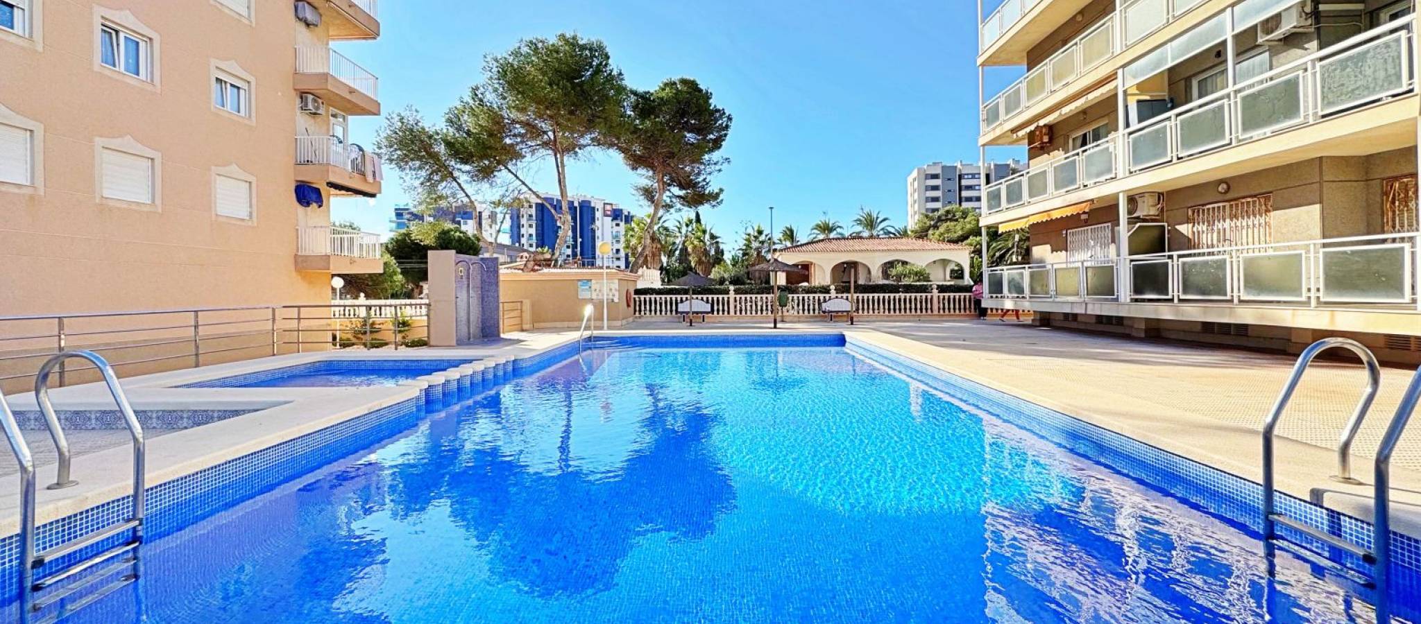 Apartment for sale in Rocío del Mar, Torrevieja, located in an exclusive residential area next to Punta Prima, just 200 metres from the sea. This 43 m² property is part of a private urbanisation with a communal swimming pool, offering a quiet and family-friendly atmosphere all year round. The apartment is in excellent condition and benefits from a south-facing orientation, ensuring natural light throughout the day. It features a bright living-dining room with access to a glazed terrace perfect for enjoying the Mediterranean climate, a fully equipped kitchen, one double bedroom with fitted wardrobe, and a complete bathroom with bathtub and natural ventilation. The terrace has pleasant side sea views and enough space for a table and chairs. Additional features include air conditioning in the living room, awnings on the terrace, tiled floors, lift in the building and adapted access. The property is delivered ready to move into. The private complex offers a large communal pool surrounded by sunbathing areas and well-kept gardens. Its privileged location, only 200 metres from the sea and within walking distance to supermarkets, restaurants, public transport and leisure areas, makes it an ideal option for those seeking comfort and convenience. This apartment in Rocío del Mar, Torrevieja, represents an excellent purchase opportunity — perfect as a permanent residence, holiday home or investment with high rental potential in one of the most desirable coastal areas of the Costa Blanca.