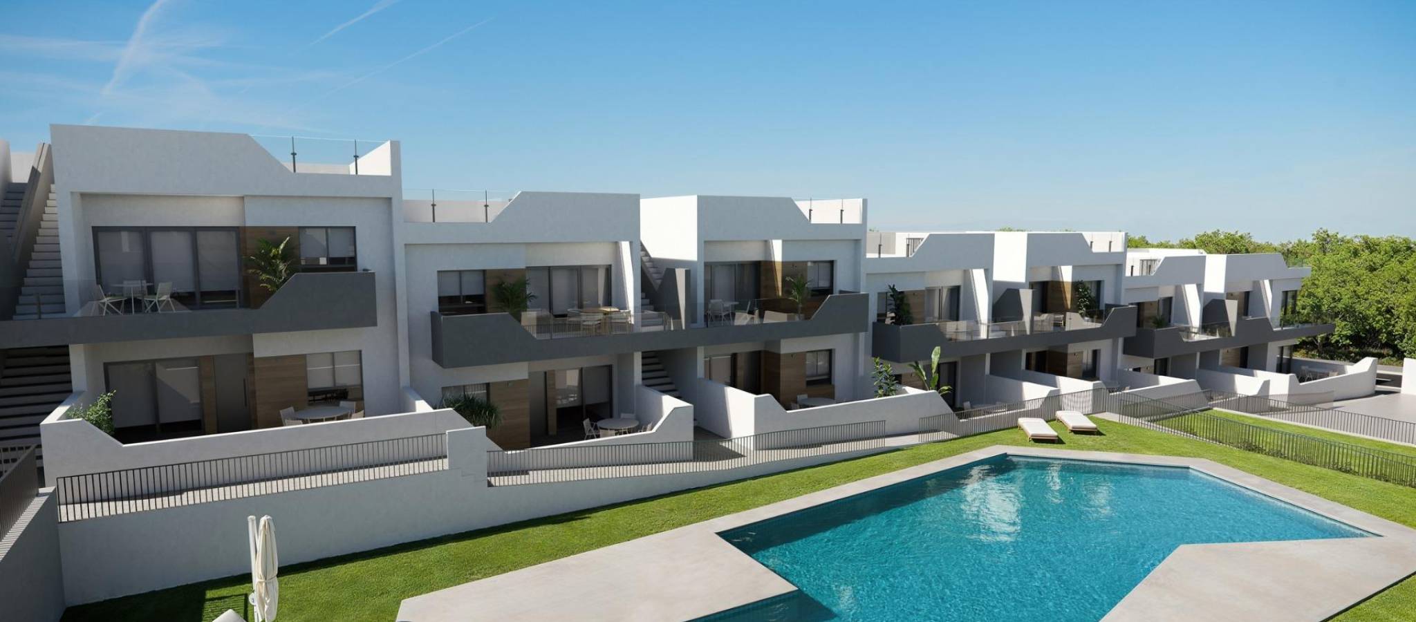 NEW BUILD BUNGALOW APARTMENTS IN SAN MIGUEL DE SALINAS New Build residential complex of bungalows in San Miguel del Salinas. Residential consist of bungalow apartments with 2 and 3 bedrooms, on ground floor with a private garden or top floor with a private solarium. An exclusive residential complex offering high quality homes with excellent thermal and acoustic insulation, top quality finishes and complete facilities. The facilities include two swimming pools, large garden areas, and well-designed communal areas, guaranteeing a comfortable and safe environment. Each property has modern fitted kitchens, porcelain flooring and efficient plumbing and air conditioning systems. Residential located in San Miguel de Salinas near the Las Colinas and Campoamor golf courses, shopping centres, Torrevieja and La Mata lagoons and sandy beaches of Orihuela Costa. San Miguel de Salinas is a municipality in the Valencian Community, Spain. Located in the south of the province of Alicante, in the region of Vega Baja del Segura near the Region of Murcia. Alicante airport located 35 minutes drive away and Murcias Corvera airport is about 1 hour drive away.