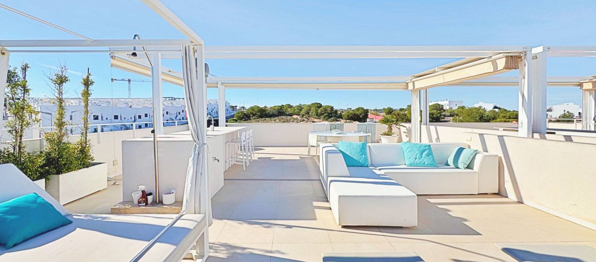 This exclusive penthouse in Mirasal, located in the prestigious Los Balcones area of Torrevieja, stands out for its contemporary design, exceptional brightness and privileged position at the highest point of the residential complex. Thanks to this elevated location, the property enjoys panoramic views over Torrevieja, the Mediterranean Sea and the iconic Pink Salt Lake, one of the most unique natural landscapes on the Costa Blanca. Inside, the penthouse offers a spacious and elegant atmosphere, with a modern open-plan kitchen and a bright living area connected to a generous terrace overlooking the infinity-style swimming pool and landscaped gardens. Large floor-to-ceiling windows create a seamless transition between indoor and outdoor spaces, enhancing the sense of openness and wellbeing. The highlight of the property is its spectacular private rooftop solarium, fully designed for year-round outdoor living. The space includes chill-out areas, an outdoor dining space, a bar area and pergolas, making it perfect for relaxing or entertaining guests. From here, the open views of the salt lake and the entire city of Torrevieja are simply extraordinary. Mirasal is known for its contemporary architecture, large green areas and impressive infinity-style pool. Its location in Los Balcones offers tranquillity, proximity to all services, quick access to sports facilities, supermarkets and natural surroundings, and is just a short drive from Torrevieja’s best beaches. A unique opportunity for those seeking a modern and exclusive penthouse with privileged views in one of the finest residential complexes on the Costa Blanca.