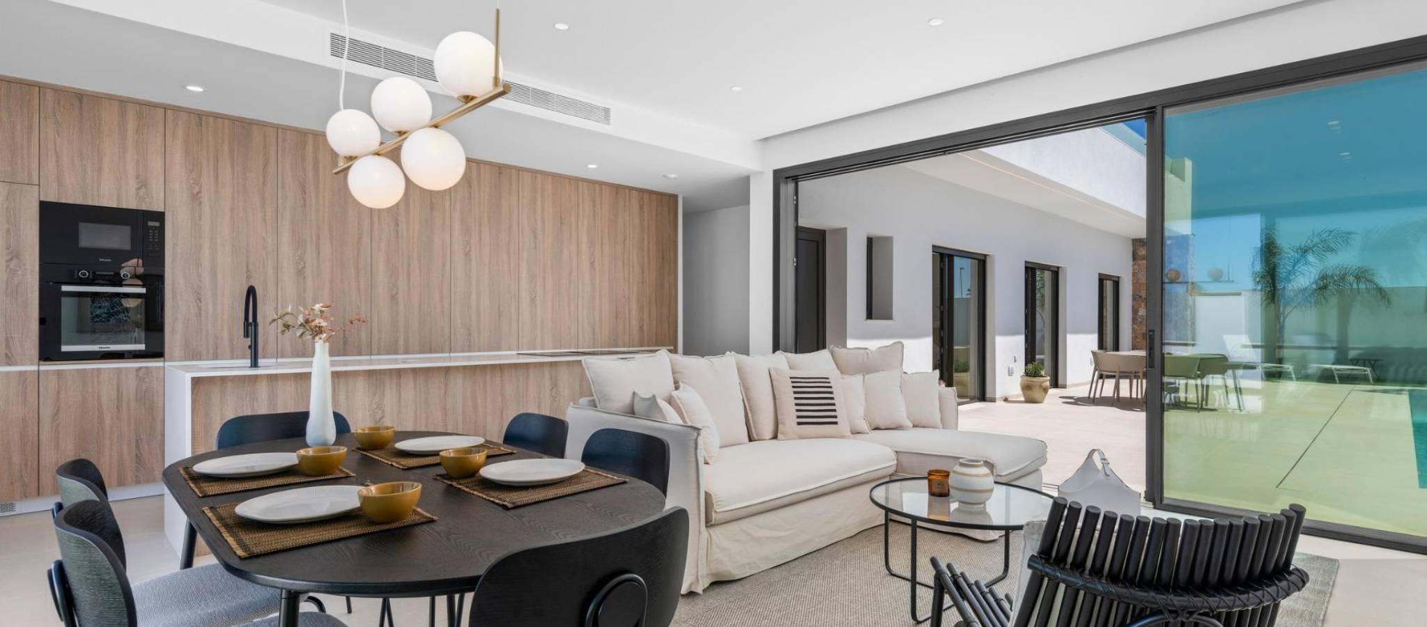 New Build Villas Near Serena Golf in Los Alcazares Modern Villas in a Prime Coastal and Golf Location This exclusive new build residential project offers modern villas located in Los Alcazares, just a short distance from the prestigious Serena Golf and only 1.2 km from the sandy beaches of the Mar Menor. Set in one of the most attractive areas of the Region of Murcia, these homes combine contemporary design, comfort and an excellent location close to the sea, golf and all daily services. Los Alcazares is a well established coastal town known for its relaxed lifestyle, long promenade, water sports and mild climate throughout the year. Single Level Design with Private Outdoor Spaces The development features stylish villas with 3 bedrooms and 2 bathrooms, available in two different built sizes of approximately 106 sqm and 130 sqm. The larger model also includes an additional guest toilet. All villas are designed on a single floor, offering practical and comfortable living. The open plan kitchen, dining and living area connects directly to a terrace and private garden with swimming pool, creating an ideal space for indoor and outdoor living. Each property also includes a private solarium and on plot parking. High Quality Finishes and Modern Equipment These villas are built with high quality materials and equipped with modern features. The fully fitted kitchens are available in white gloss or wood finish and include quartz worktops, stainless steel sink, induction hob with integrated extractor, oven, microwave, washing machine, integrated fridge and dishwasher. Bathrooms are fitted with furniture, mirrors, lighting and electric towel heaters. Additional features include electric blinds in bedrooms, LED lighting throughout the property and a complete ducted air conditioning system by Fujitsu. Private Pool and Energy Efficient Comfort Each villa includes a private swimming pool finished with blue ceramic tiles, integrated steps and white LED lighting. The pool is prepared with pre installation for a heat pump. The combination of efficient climate control, modern construction and thoughtful design ensures comfort all year round. Excellent Connectivity and Key Distances The villas are within walking distance of the town centre of Los Alcazares and very close to Serena Golf. The beach is approximately 1.2 km away. Cartagena city is around 20 km away, offering a rich cultural and gastronomic scene. Murcia Corvera International Airport is about 22 km away, and Alicante Airport is approximately 90 km. Several golf courses and marinas are also nearby, making this location ideal for both permanent living and holidays. Your Ideal Home by the Sea and Golf If you are looking for a modern new build villa near the beach and golf in Los Alcazares, contact us today for more information or to arrange a private viewing.