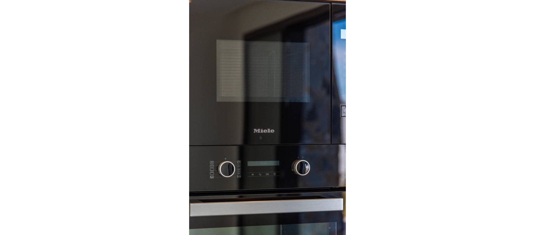 Fully furnished kitchen in white gloss or wood colour includes Induction hob with integrated extractor, oven, microwave, washing machine, integrated refrigerator, and integrated dishwasher.