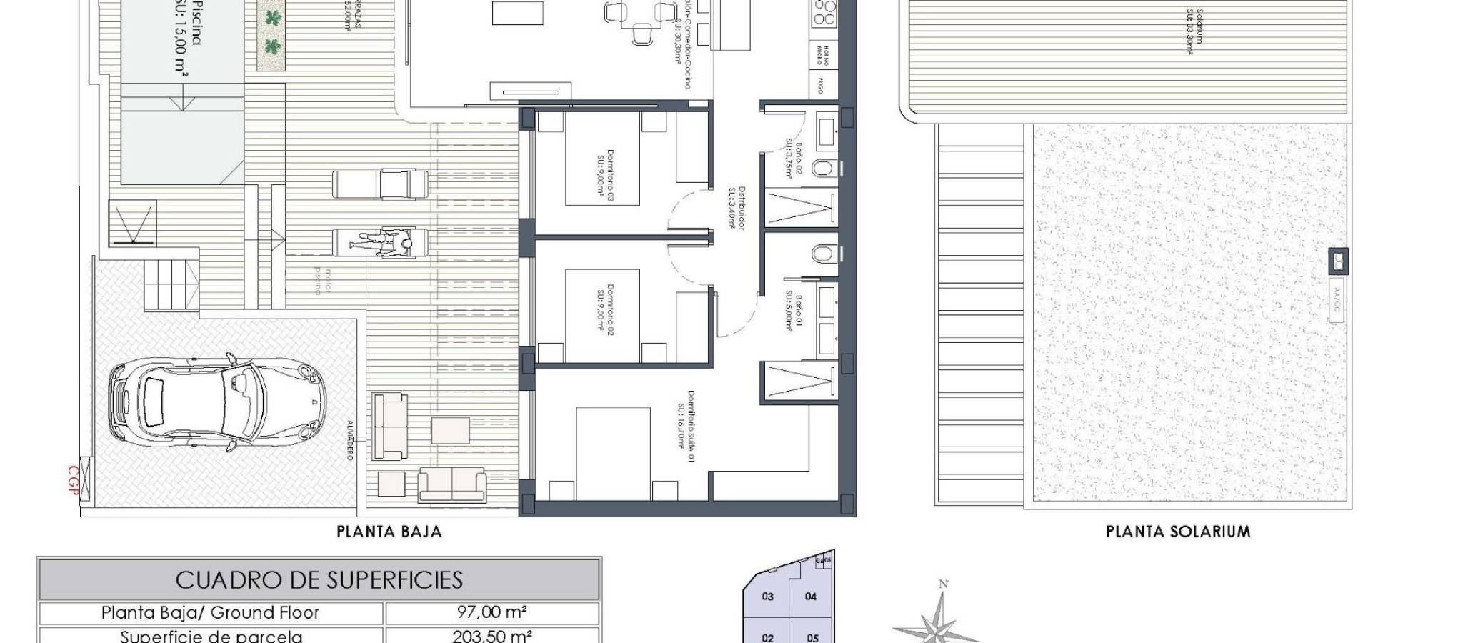 These new build villas are constructed with modern materials and quality finishes. Features include electric shutters, a complete interior and exterior lighting package, and bathrooms fitted with furniture, mirrors and shower screens. Hot water is provided through an efficient aerothermal system, enhancing energy efficiency and sustainability. The homes also include pre installation for ducted air conditioning, allowing future owners to customize the climate system to their needs.