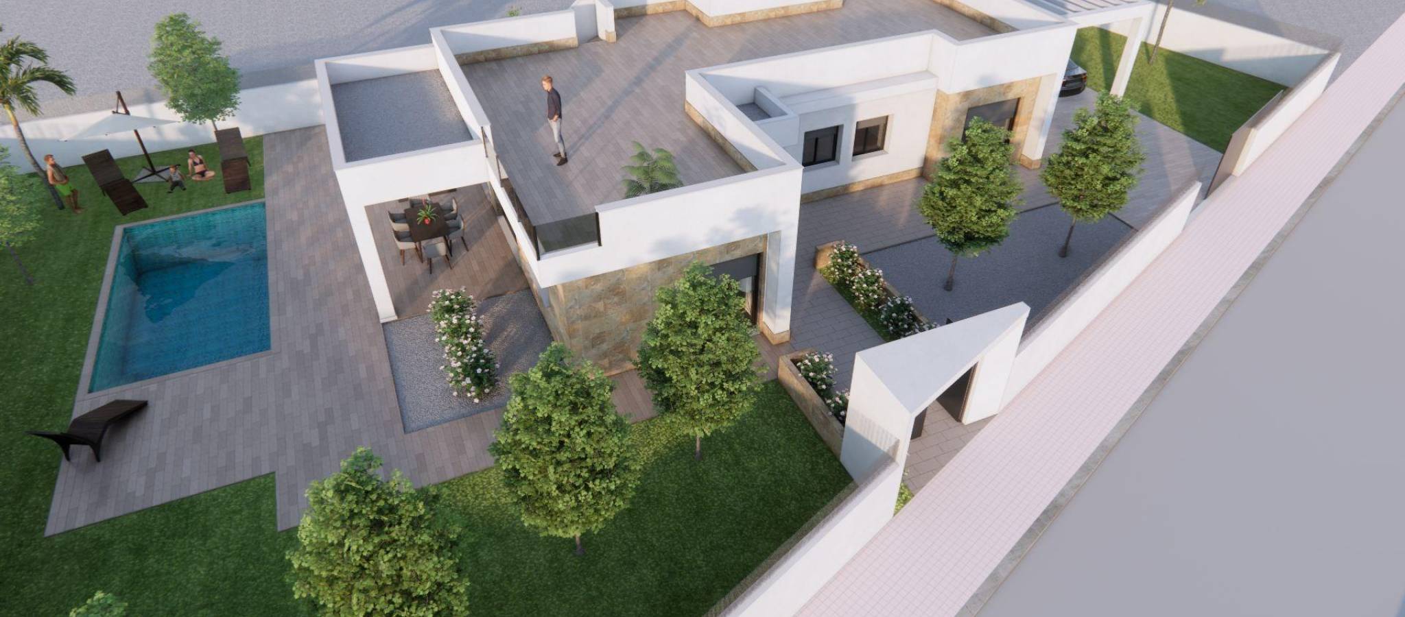 New Build Villa with Private Pool in Vistabella, Jacarilla Exclusive New Build Villa in a Natural and Golf Setting This new build villa under self promotion regime is located in the peaceful area of Vistabella, within the municipality of Jacarilla. Set in a natural environment between the Vistabella Golf course and the La Pedrera reservoir, this property offers privacy, open views and a relaxed Mediterranean lifestyle. The area is ideal for those seeking tranquility while remaining close to the coast, golf courses and everyday services. Vistabella is a well known residential area popular with international buyers thanks to its golf course, local restaurants and proximity to Orihuela Costa and Torrevieja. Jacarilla maintains its traditional Spanish charm, offering local shops, services and a friendly atmosphere all year round. Modern Single Level Layout with Spacious Outdoor Areas The villa is distributed on one single floor and has been designed to combine comfort, functionality and natural light. It offers 3 bedrooms and 2 bathrooms, including a master bedroom with ensuite bathroom. The open plan living and dining area connects seamlessly with the modern kitchen, creating a bright and welcoming living space. A covered terrace of 22 sqm provides direct access to the private garden, where a private swimming pool and landscaped areas invite you to enjoy the outdoor lifestyle. The generous 750 sqm plot also includes on plot parking space for two vehicles. Private Solarium with Open Views One of the highlights of this villa is the impressive private solarium of 120 sqm, accessed via an external staircase. From here, you can enjoy open panoramic views of the surrounding countryside, perfect for sunbathing, entertaining or relaxing throughout the year. Quality Specifications and Energy Efficient Features The villa is built with quality materials and modern specifications to ensure comfort and efficiency. Features include a reinforced security entrance door, aerothermal system for domestic hot water, electric blinds in the living room and bedrooms, and preinstallation of ducted air conditioning. These elements provide an ideal base for a comfortable and energy efficient home. Excellent Location Close to Golf, Nature and the Coast Vistabella Golf is located approximately 2 km away, while the La Pedrera reservoir is just 1.5 km from the property, ideal for nature lovers and outdoor activities. The beaches of Orihuela Costa are around 15 km away. Alicante International Airport is approximately 55 km away, offering easy connections to major European destinations. Several additional golf courses and shopping areas can be reached within 10 to 15 km. A Unique Opportunity on the Costa Blanca This new build villa in Vistabella is perfect as a permanent residence, holiday home or investment opportunity in a sought after location. Contact us today to receive more information and secure your new home in the heart of the Costa Blanca.