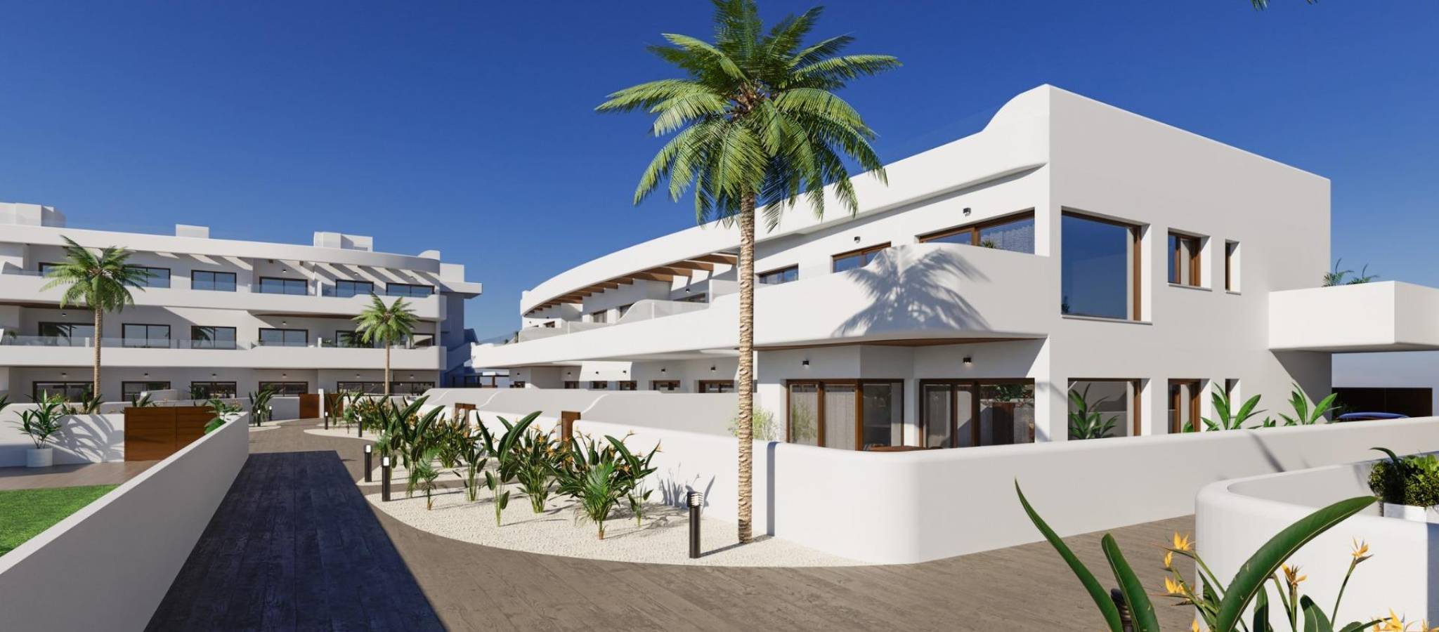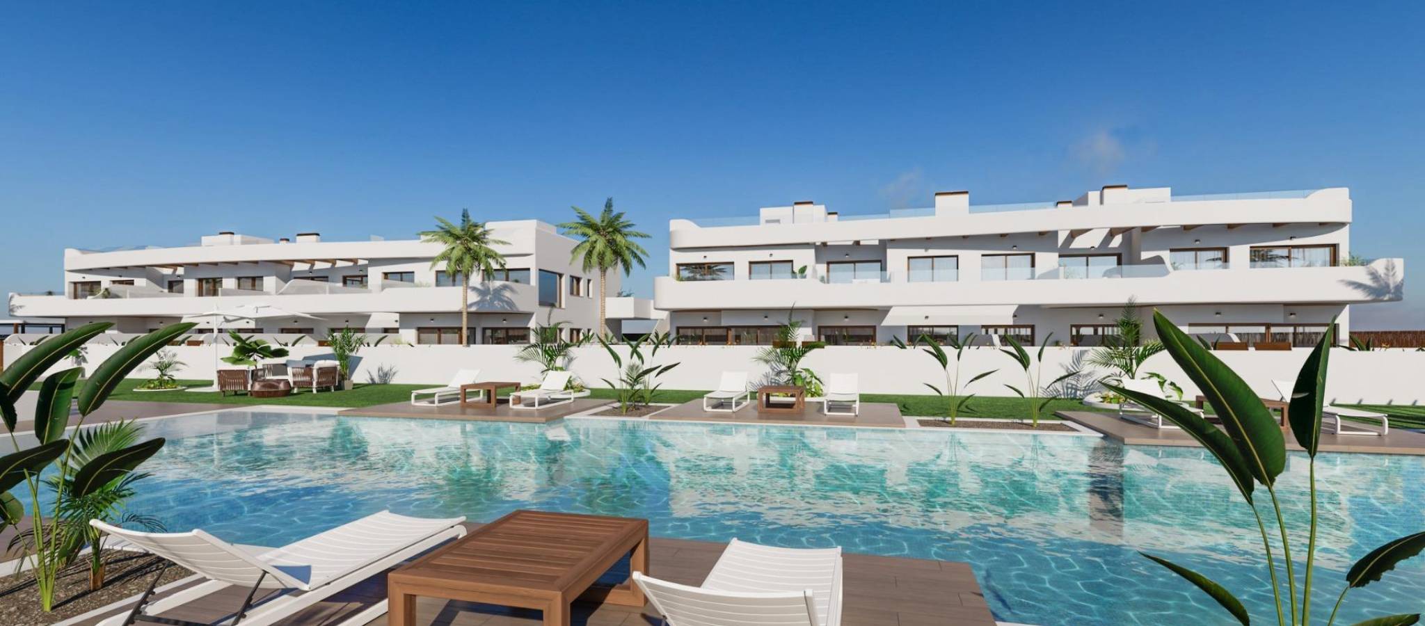 The development consists of 29 modern homes with 2 or 3 bedrooms, designed with clean architectural lines and high quality finishes. Buyers can choose between ground floor apartments with private garden and terrace, middle floor homes with spacious terraces, or penthouses with private terrace and rooftop solarium offering open views. Many of the properties enjoy views towards Serena Golf and the Mar Menor, creating a calm and pleasant living environment.
