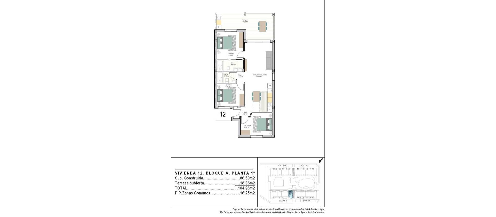 Modern New Build Apartments in San Cayetano, Torrepacheco, Murcia Contemporary Living in a Peaceful Mediterranean Setting This exclusive new residential complex is located in San Cayetano, Murcia, part of the municipality of Torre Pacheco, just 9 km from the sea and surrounded by several renowned golf courses. The project combines tranquility, comfort and contemporary design, offering an ideal environment for permanent living, holiday use or investment on the Costa Calida. The development consists of 72 apartments with 2 and 3 bedrooms and 2 bathrooms, one of them ensuite, distributed across four modern buildings. A second phase with bungalows and villas is also planned, adding further value and appeal to the area. Designed Communal Areas for Relaxation and Wellbeing Residents will enjoy carefully landscaped communal spaces that include two swimming pools, beautiful gardens and a fully equipped gym. These areas create a pleasant and social environment where neighbors can relax, exercise and enjoy the Mediterranean lifestyle. The residential complex also features 40 kW of photovoltaic solar panels that help support the community electricity costs, contributing to a more sustainable and energy efficient living environment. Apartments with Private Outdoor Spaces and Solarium Each apartment is designed to make the most of outdoor living. Ground floor properties include private gardens, first floor apartments offer spacious terraces, and top floor homes benefit from both a terrace and a private rooftop solarium. All properties include a summer kitchen on the terrace or solarium, perfect for enjoying the sun all year round. All homes come with an outdoor parking space and a private storage room in the basement, adding extra convenience and practicality. Quality Features and Energy Efficient Installations These new build apartments are delivered with quality finishes and modern installations to ensure comfort and functionality, including: Fully fitted kitchen with appliances Fully equipped bathrooms with furniture, mirror, lighting and shower screens Preinstallation for ducted air conditioning Aerothermal system for hot water The combination of modern materials and energy efficient systems makes these homes ideal for year round use. Excellent Location Close to Golf, Beaches and Services San Cayetano is a quiet and well connected village with local amenities, shops and services. Its strategic location allows easy access to beaches, golf courses and major transport links. Key distances to points of interest include: Mar Menor beaches 9 km Roda Golf 6 km La Serena Golf 14 km Los Alcazares 10 km Cartagena 30 km Murcia Corvera Airport 25 km Alicante Airport 90 km Secure Your Property in San Cayetano Today This modern residential complex offers an excellent opportunity to enjoy Mediterranean living in a peaceful yet well connected area. Contact us today for more information and reserve your new build apartment in San Cayetano.