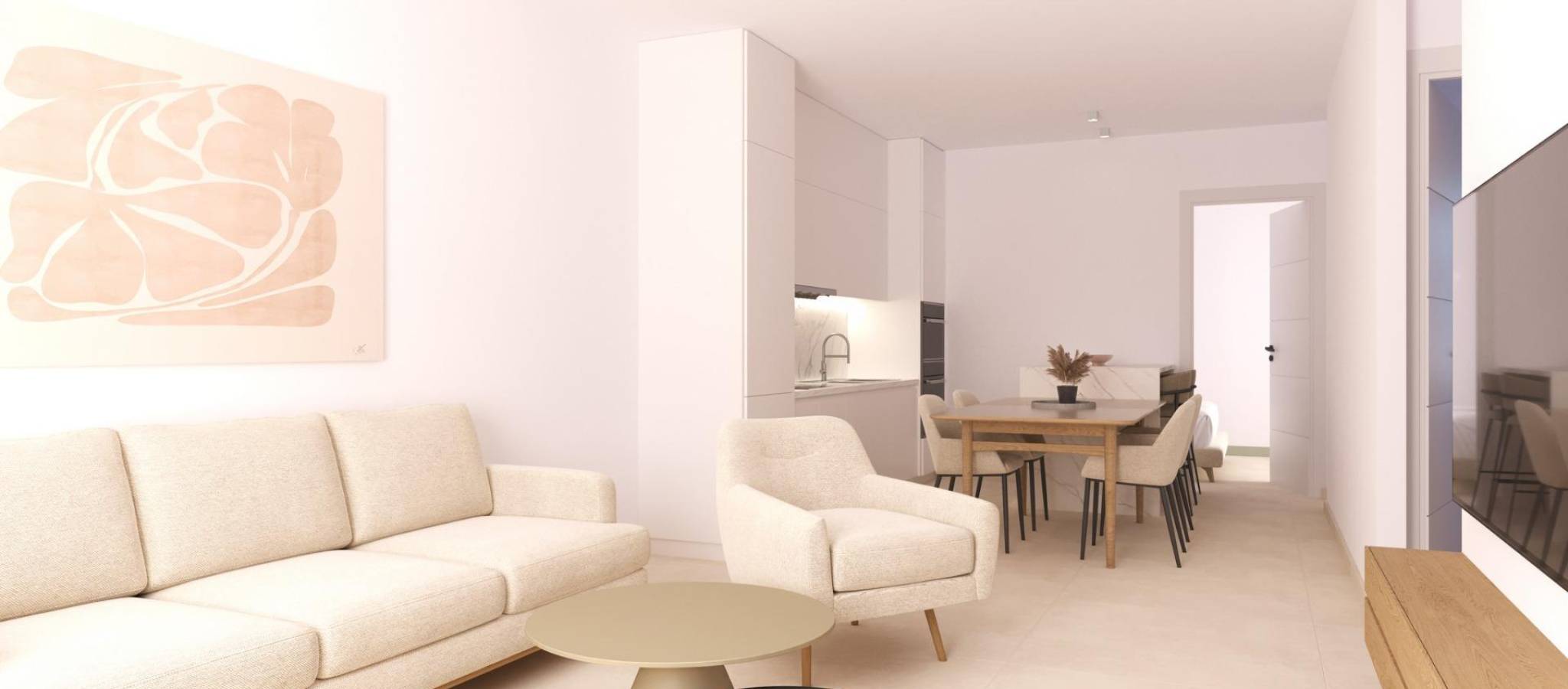 Modern New Build Apartments in San Cayetano, Torrepacheco, Murcia Contemporary Living in a Peaceful Mediterranean Setting This exclusive new residential complex is located in San Cayetano, Murcia, part of the municipality of Torre Pacheco, just 9 km from the sea and surrounded by several renowned golf courses. The project combines tranquility, comfort and contemporary design, offering an ideal environment for permanent living, holiday use or investment on the Costa Calida. The development consists of 72 apartments with 2 and 3 bedrooms and 2 bathrooms, one of them ensuite, distributed across four modern buildings. A second phase with bungalows and villas is also planned, adding further value and appeal to the area. Designed Communal Areas for Relaxation and Wellbeing Residents will enjoy carefully landscaped communal spaces that include two swimming pools, beautiful gardens and a fully equipped gym. These areas create a pleasant and social environment where neighbors can relax, exercise and enjoy the Mediterranean lifestyle. The residential complex also features 40 kW of photovoltaic solar panels that help support the community electricity costs, contributing to a more sustainable and energy efficient living environment. Apartments with Private Outdoor Spaces and Solarium Each apartment is designed to make the most of outdoor living. Ground floor properties include private gardens, first floor apartments offer spacious terraces, and top floor homes benefit from both a terrace and a private rooftop solarium. All properties include a summer kitchen on the terrace or solarium, perfect for enjoying the sun all year round. All homes come with an outdoor parking space and a private storage room in the basement, adding extra convenience and practicality. Quality Features and Energy Efficient Installations These new build apartments are delivered with quality finishes and modern installations to ensure comfort and functionality, including: Fully fitted kitchen with appliances Fully equipped bathrooms with furniture, mirror, lighting and shower screens Preinstallation for ducted air conditioning Aerothermal system for hot water The combination of modern materials and energy efficient systems makes these homes ideal for year round use. Excellent Location Close to Golf, Beaches and Services San Cayetano is a quiet and well connected village with local amenities, shops and services. Its strategic location allows easy access to beaches, golf courses and major transport links. Key distances to points of interest include: Mar Menor beaches 9 km Roda Golf 6 km La Serena Golf 14 km Los Alcazares 10 km Cartagena 30 km Murcia Corvera Airport 25 km Alicante Airport 90 km Secure Your Property in San Cayetano Today This modern residential complex offers an excellent opportunity to enjoy Mediterranean living in a peaceful yet well connected area. Contact us today for more information and reserve your new build apartment in San Cayetano.